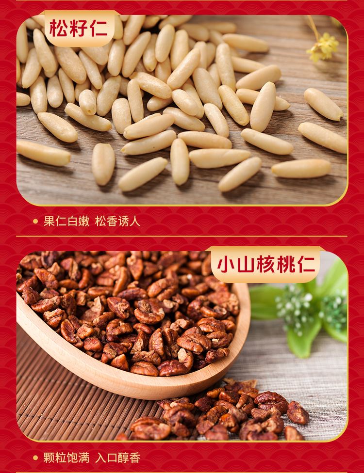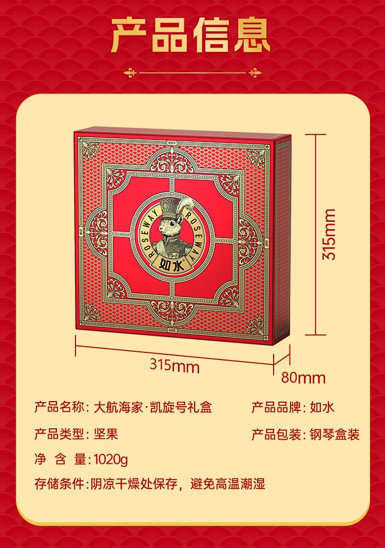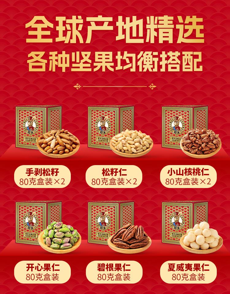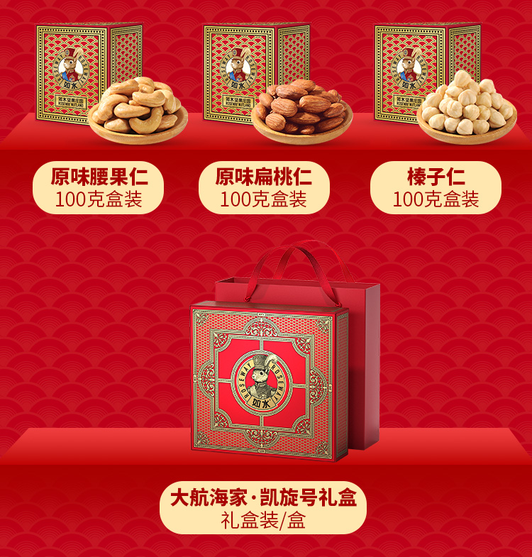 如水大航海家·凯旋号礼盒 净含量:1020g 如水手剥松籽80g 如水手剥松籽80g 如水松籽仁80g 如水松籽仁80g 如水小山核桃仁80g 如水小山核桃仁80g 如水开心果仁80g 如水碧根果仁80g 如水夏威夷果仁80g 如水原味腰果仁100g 如水原味扁桃仁100g 如水榛子仁100g