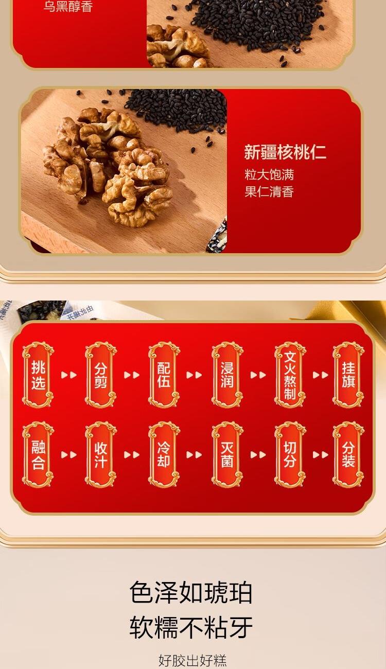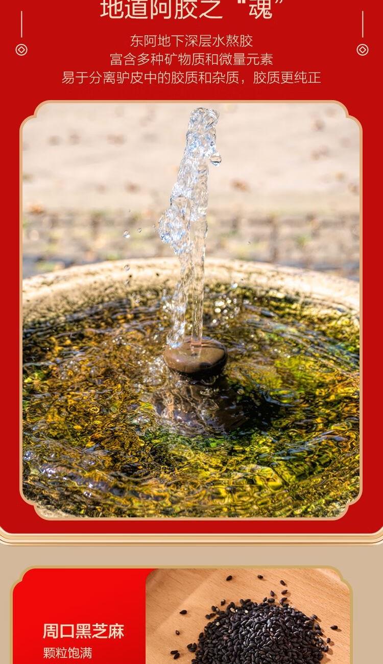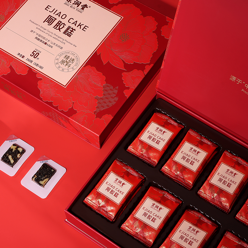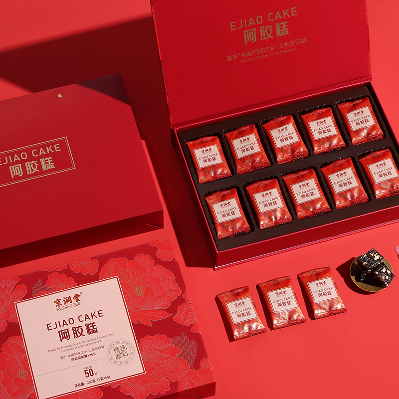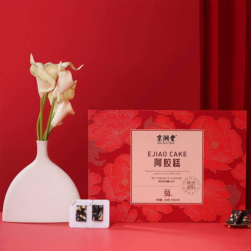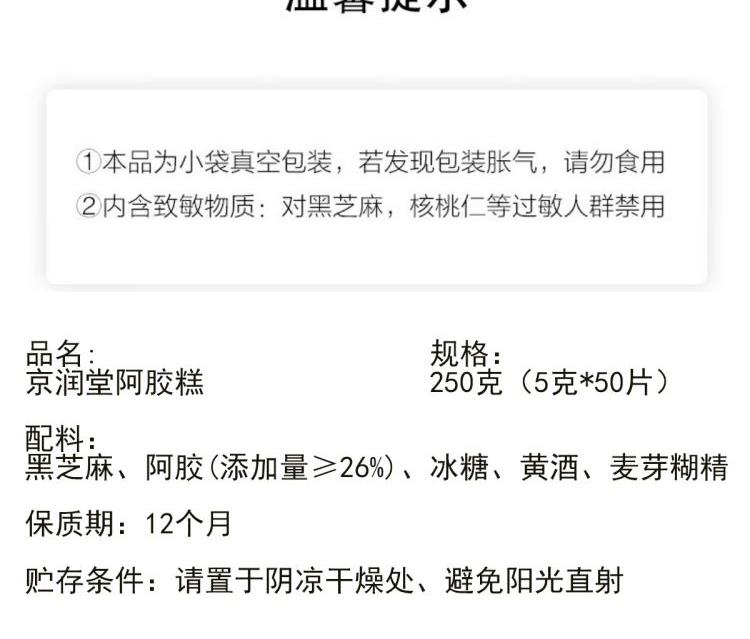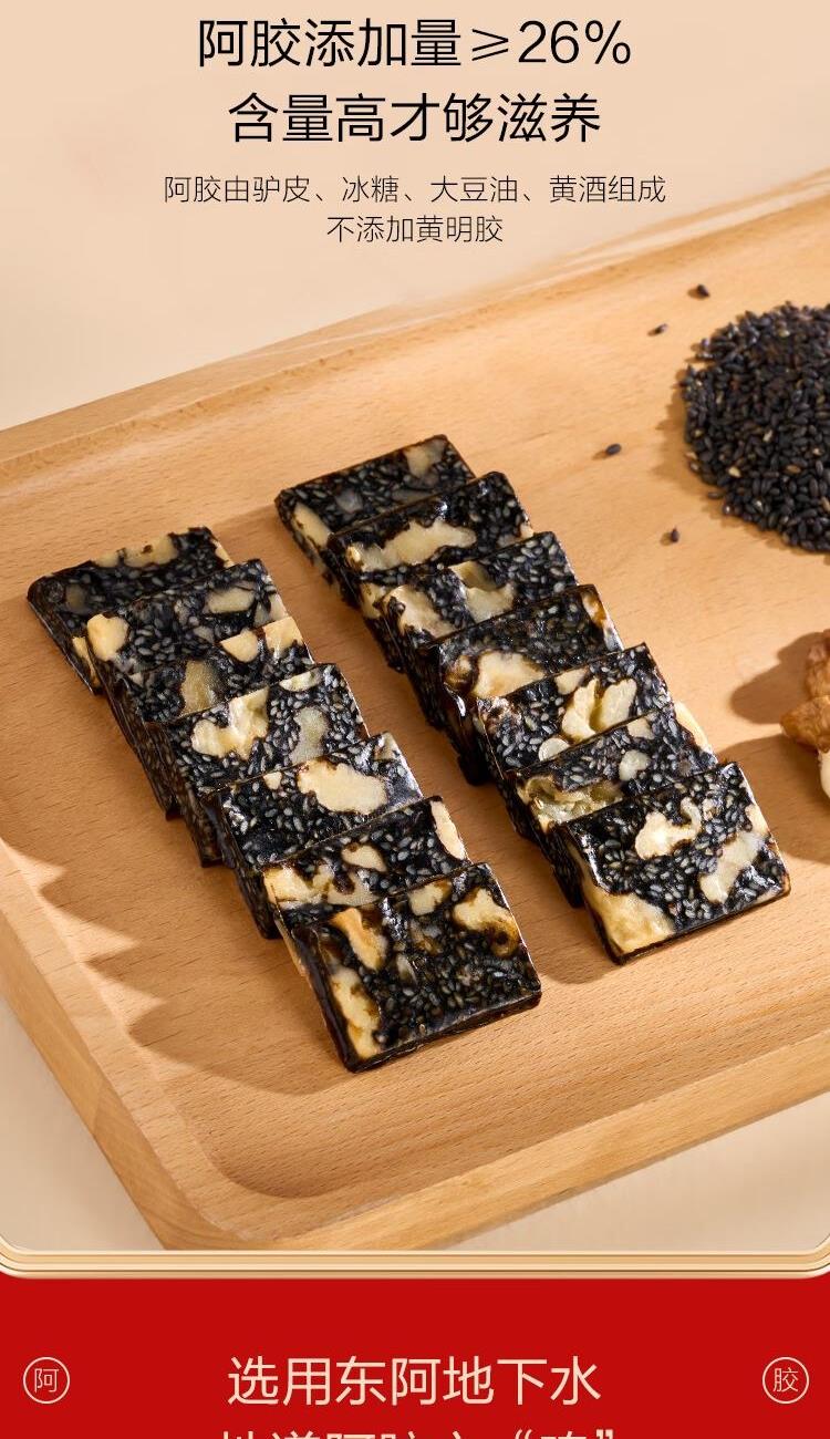 规格:250克(5克*50片)、阿胶添加量≥26% 卖点: 阿胶糕的核心在于阿胶,而优质的阿胶源自道地原料与传统工艺。我们严选山东东阿的上等驴皮,这里的驴皮质地厚实、营养丰富,为阿胶的高品质奠定了坚实基础。东阿独特的地理环境与水质,使得熬制出的阿胶纯度高、杂质少、药效佳,富含多种对人体有益的氨基酸和微量元素,如赖氨酸、精氨酸、组氨酸以及铁、锌、钙等。这些营养成分在补血、滋阴、润燥等方面功效显著,是其他产地阿胶难以比拟的。