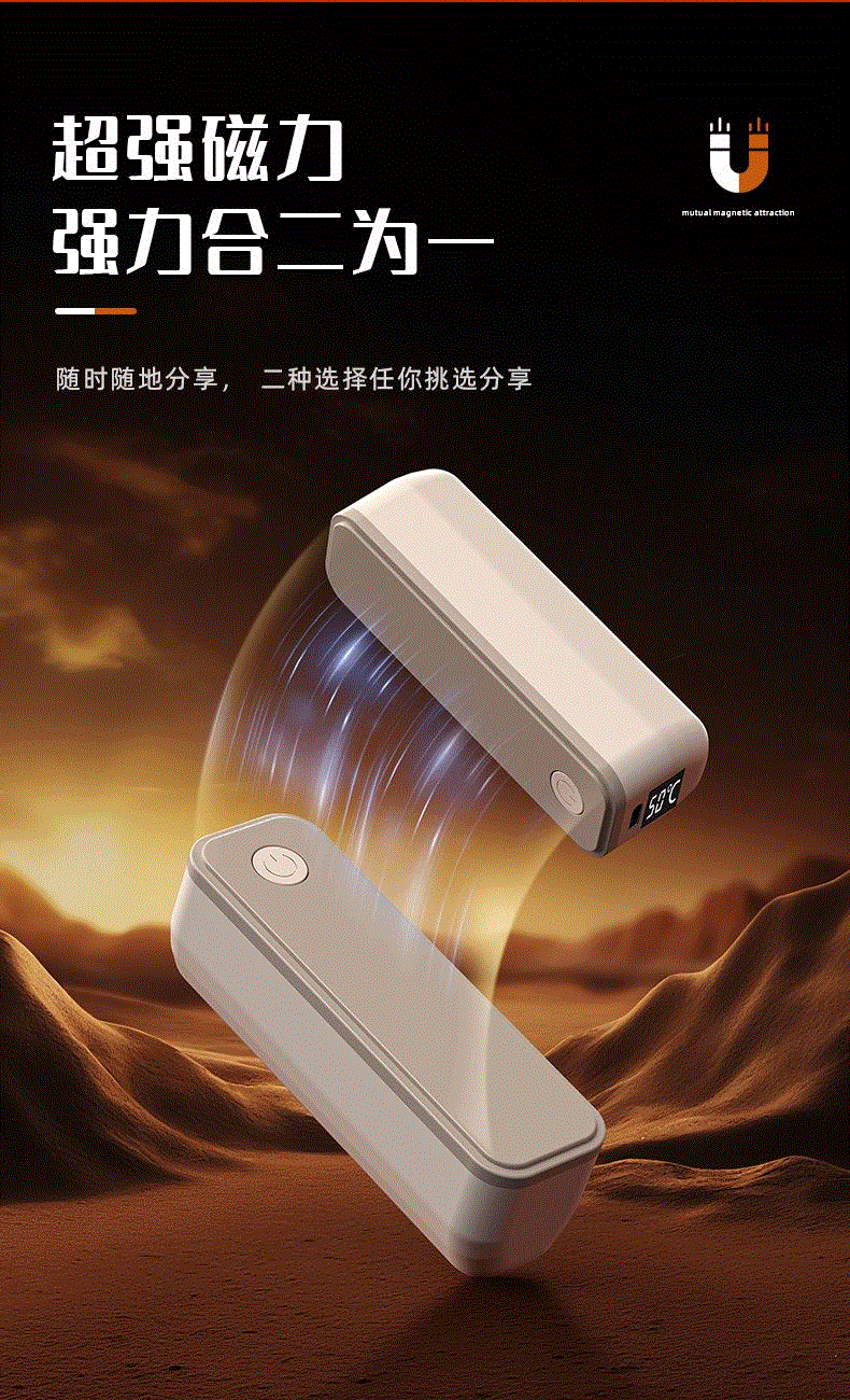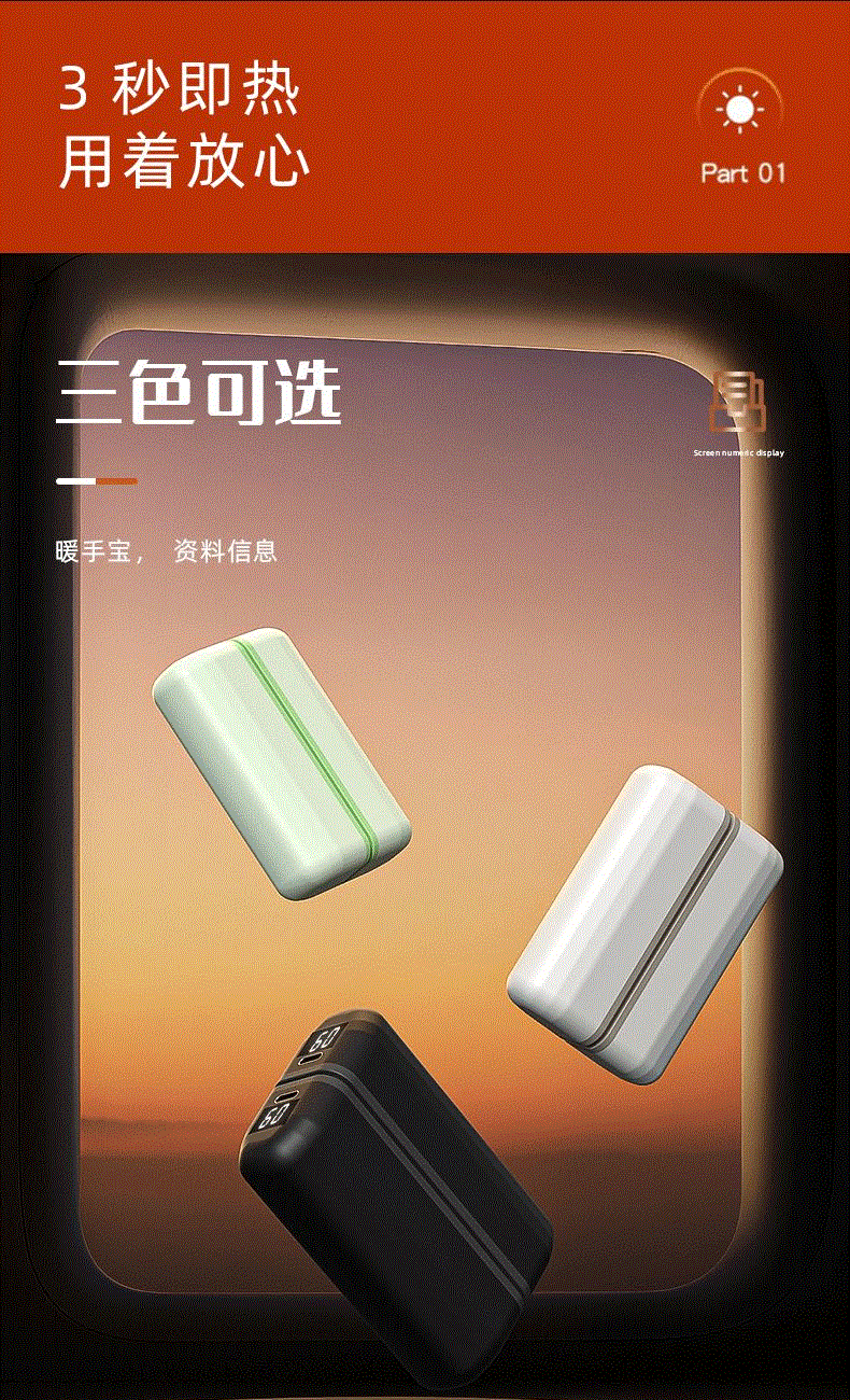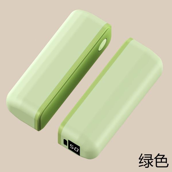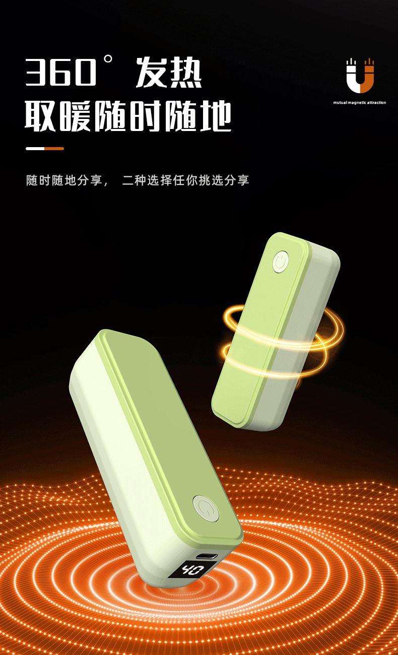 产品材质:铝合金+ABS 产品尺寸:67.2*96.7*30mm 电池容量:5200mAh 档数:三档( 40°-60°) 产品颜色:白色,绿色,黑色 暖手宝功能,温度三档调节,满足你不同时刻的需求。 数显设计,不仅显示温度,也能显示电量,方便及时充电。 双面发热;磁性功能