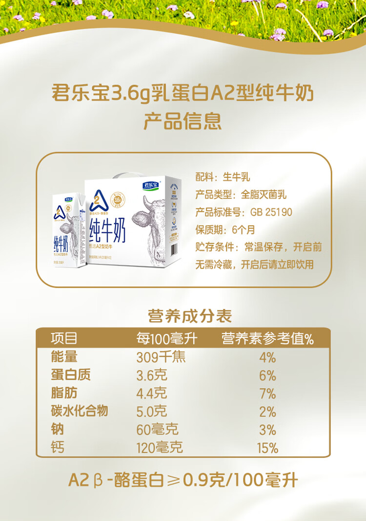 君乐宝原生A2β-酪蛋白纯牛奶200ml*12礼盒装3.6g乳蛋白A2纯牛奶 保质期:6个月