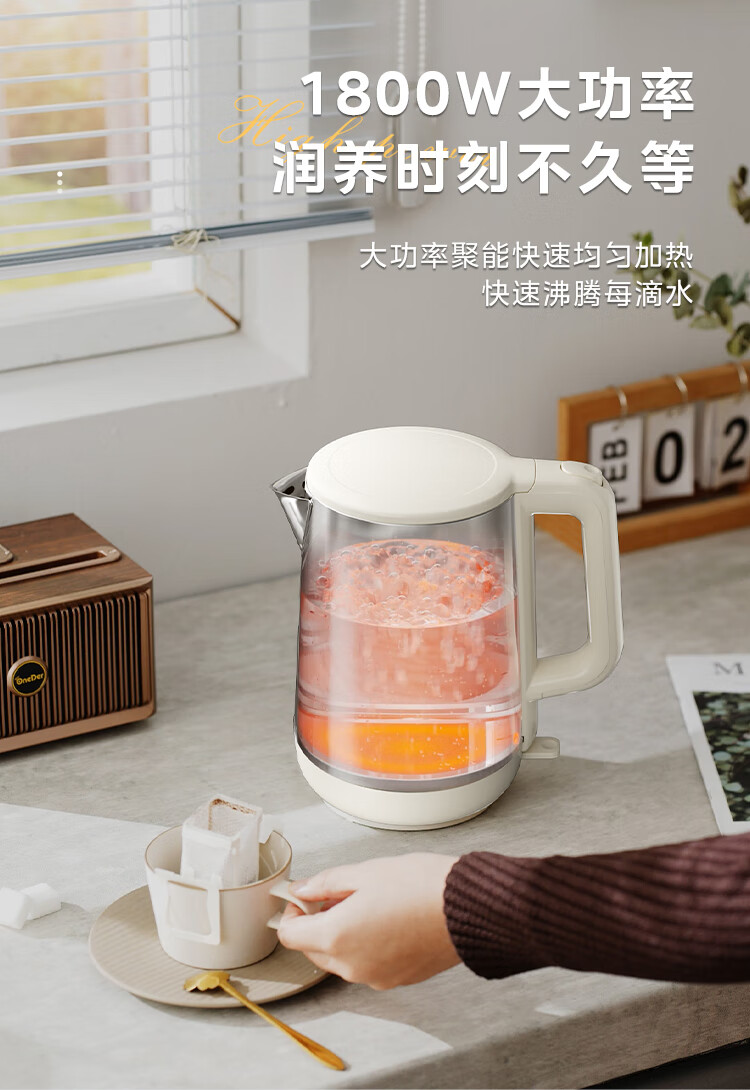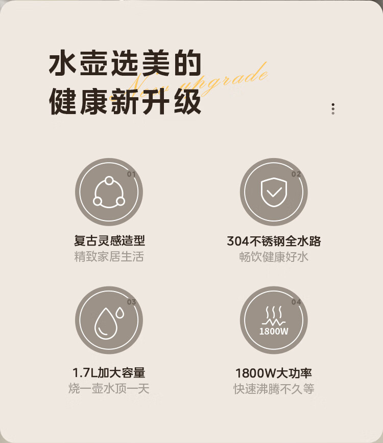 产品尺寸:225 x 210 x 270 mm 包装尺寸:222 x 152 x 221 mm 产品毛重:1.15kg 1.7L大容量 满足更多成员所需 1800W大功率 快速烧水不久等 全水路304食品级不锈钢材质