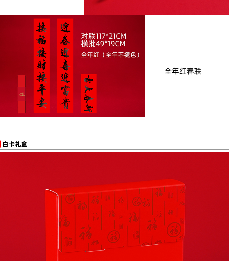 配置:笔记本+金属笔+春联 型号:NF04 材质:PU+金属+纸 尺寸:笔记本210*145mm 春联1170*210mm 金属笔140*10mm 包装:白卡礼盒(225*190*45mm)