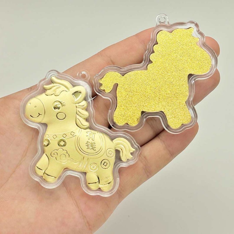 以生肖马为型,铸就圆润灵动之姿,寓意“马到功成”。胸前精雕“有钱”二字,缀以祥云纹饰,融招财吉运于方寸之间,伴您事业腾达,财源滚滚。
