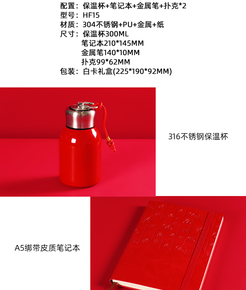 配置:保温杯+笔记本+金属笔+扑克*2 型号:NF15 材质:304不锈钢+PU+金属+纸 尺寸:保温杯300mL 笔记本210*145mm 金属笔140*10mm 扑克99*62mm 包装:白卡礼盒(225*190*92mm)