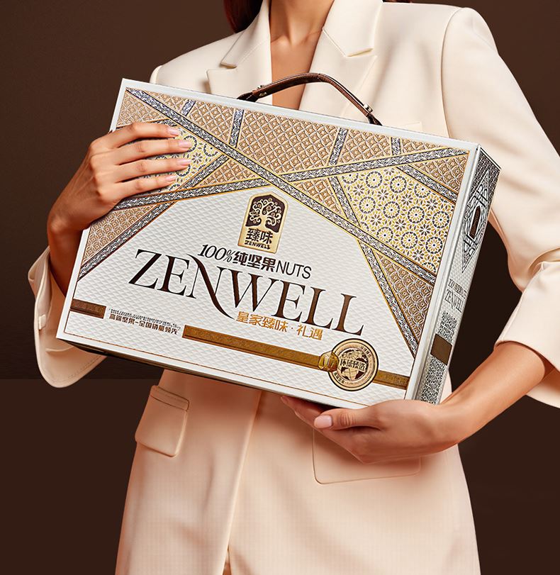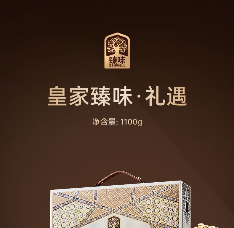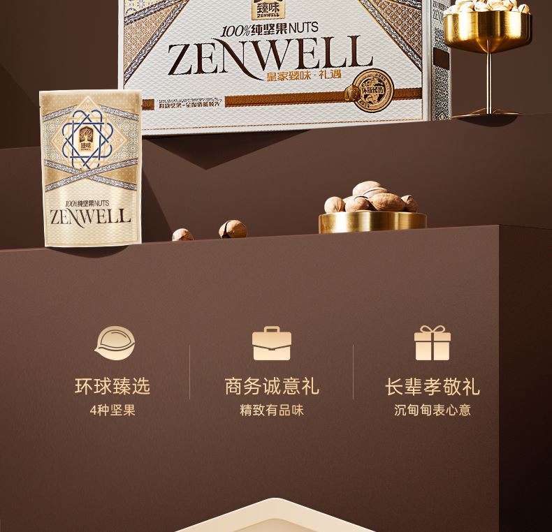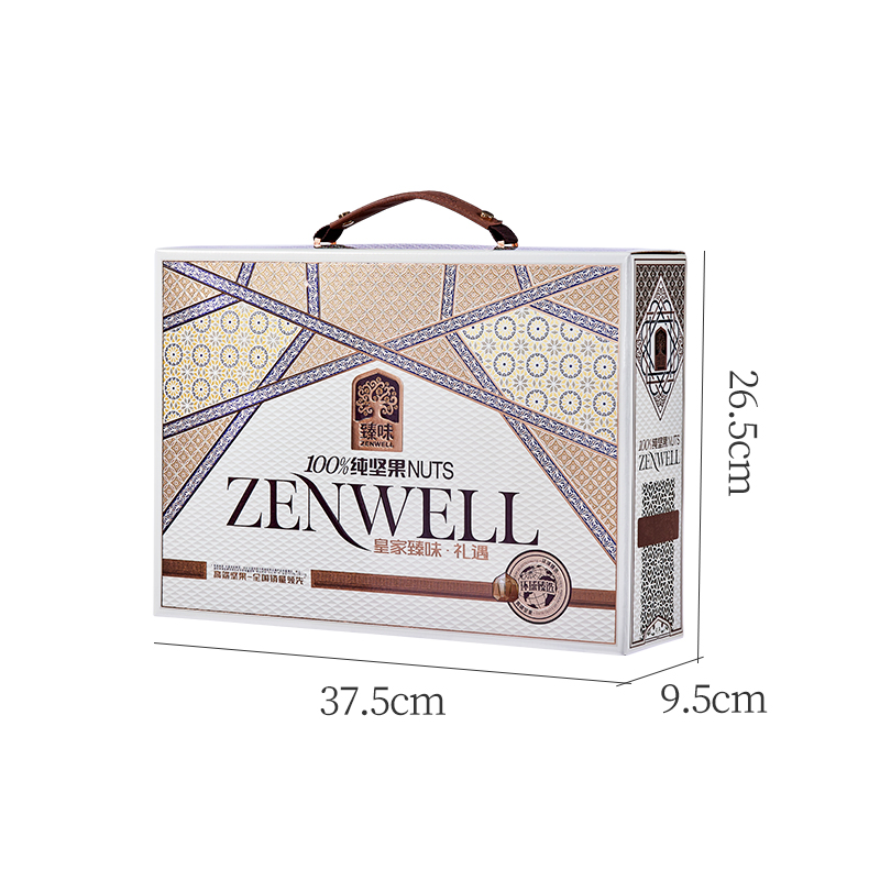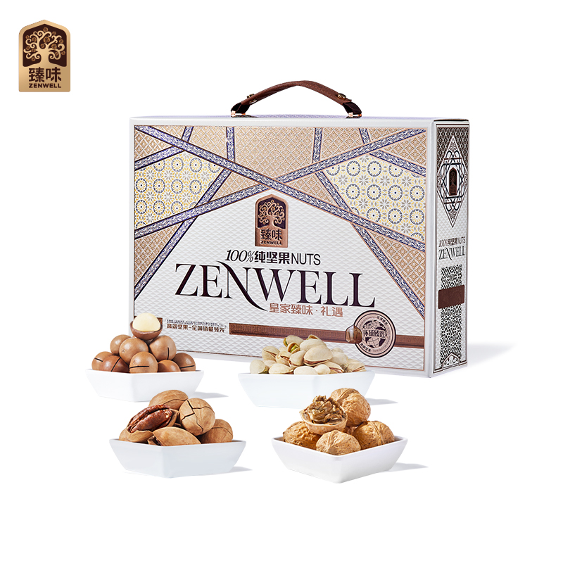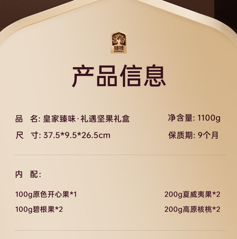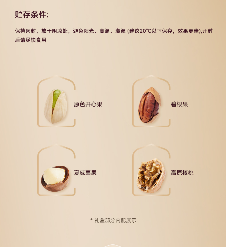 100g原色开心果*1 100g碧根果*1 100g碧根果*1 200g夏威夷果*1 200g夏威夷果*1 200g高原核桃*1 200g高原核桃*1 礼盒以金咖色调为主,精致的几何线条与格纹元素搭配棕色皮质手提,整体呈现出优雅的轻奢质感; 净含量:1100g,内含4种纯坚果,感受食材的本真风味与高品质,送礼更有品味。