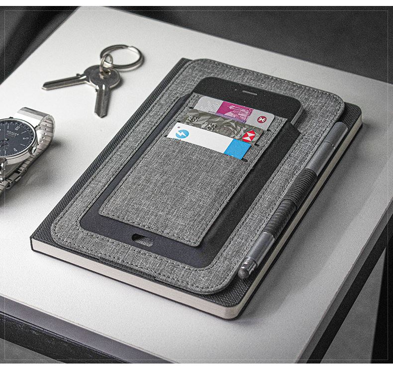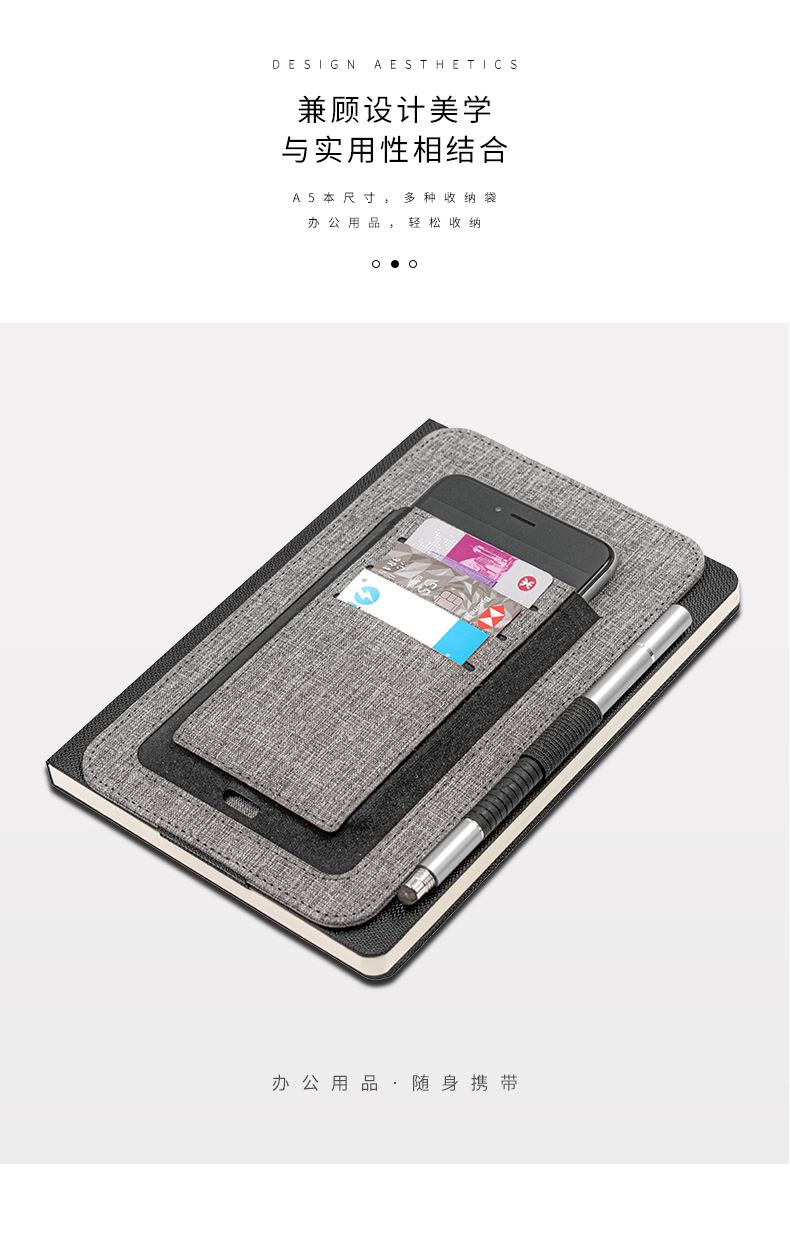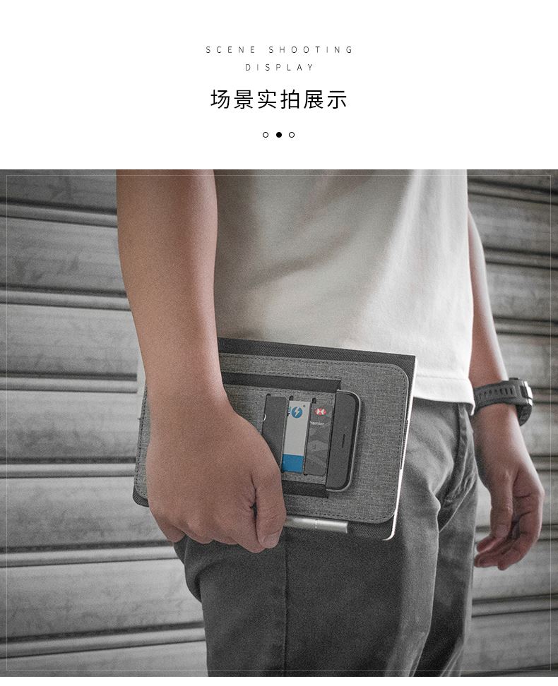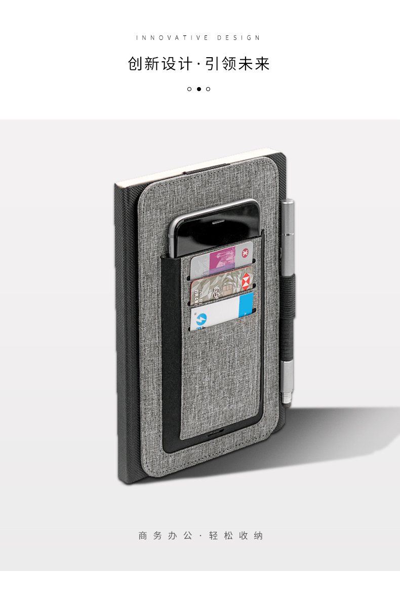 纳, 配有集成卡夹、笔环和手机袋等功能。