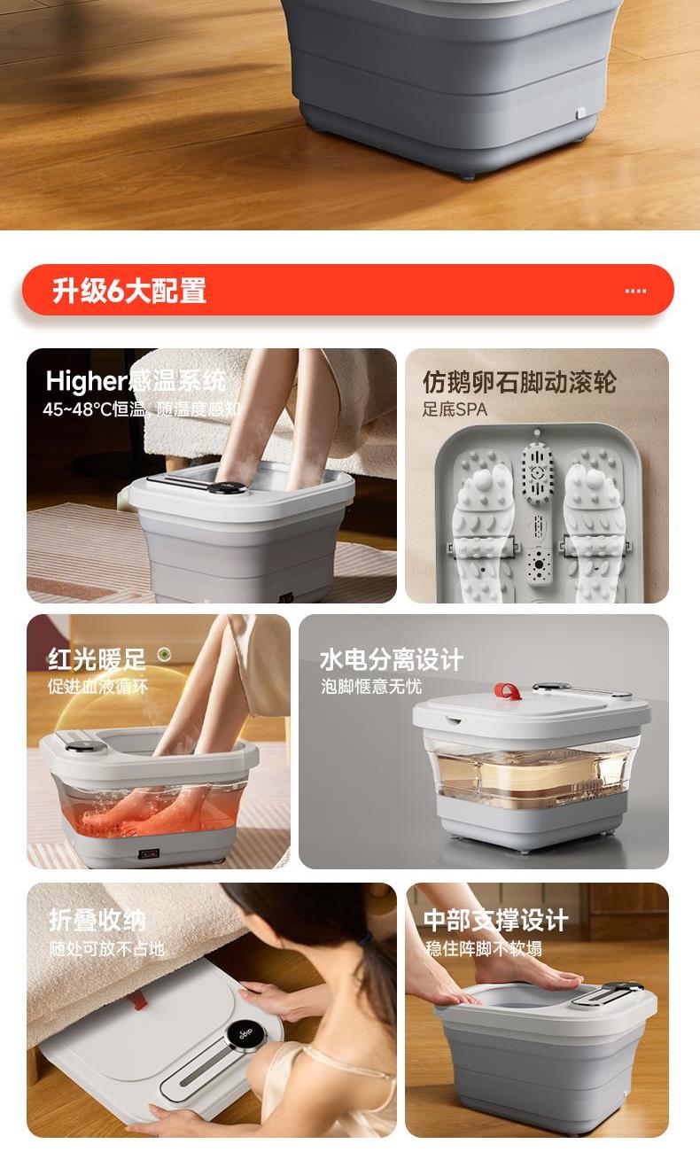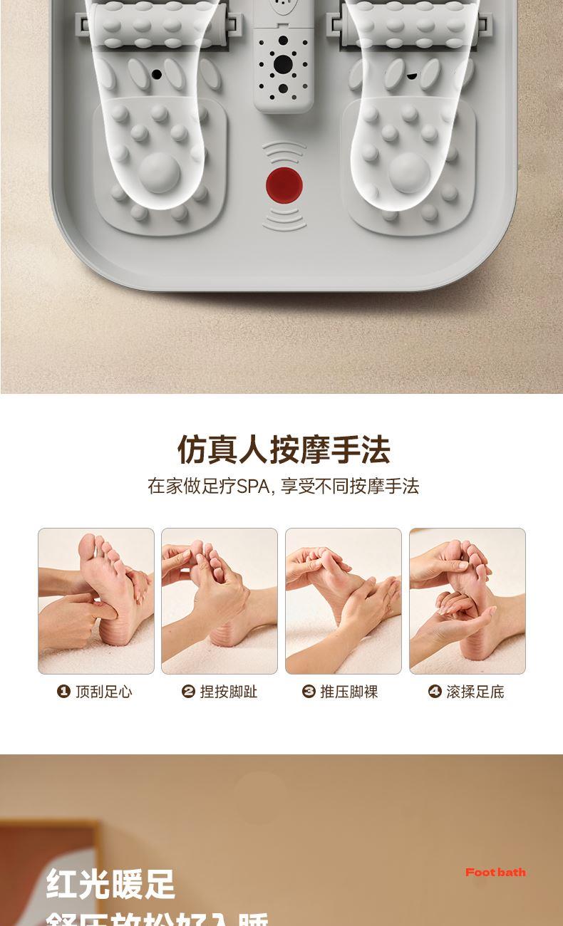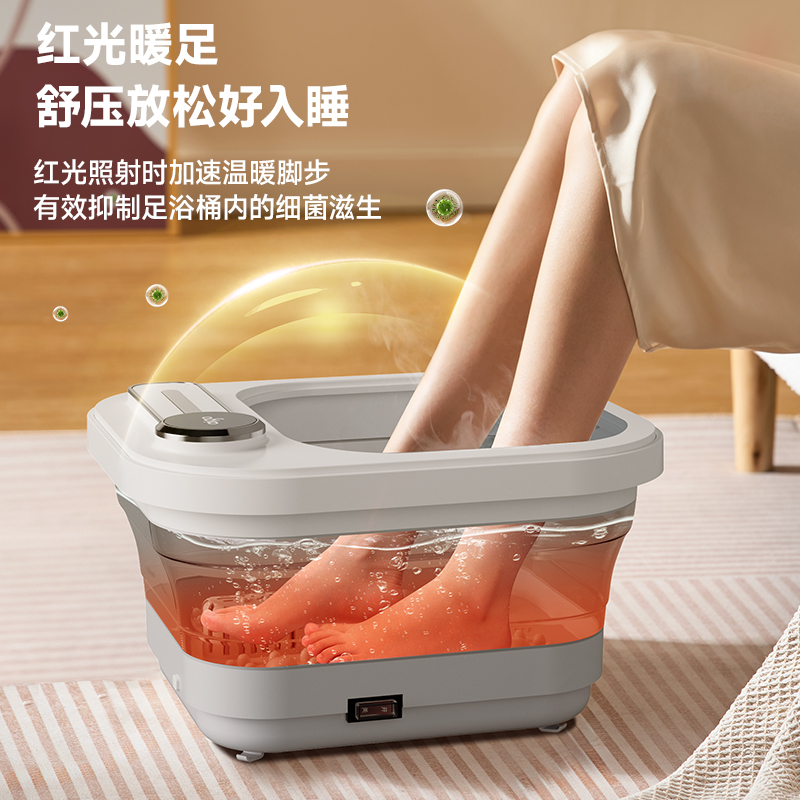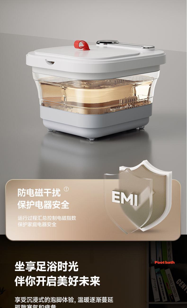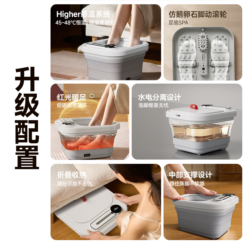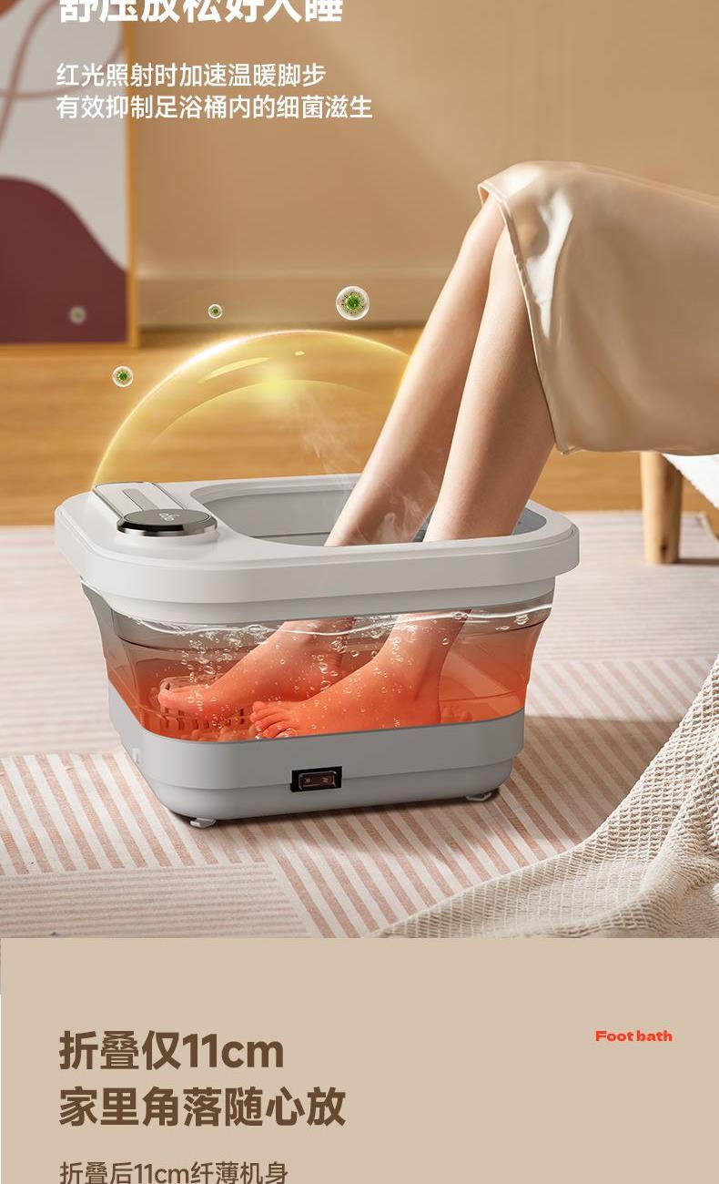 恒温加热、滚轮按摩,仿真人太极揉捏 1秒折叠收纳、底部收线功能,轻巧便携 行业首创带挂壁收纳,壁挂专 利,轻松收纳 喷泉按摩,涌泉冲浪 红光理疗,温暖舒适,促进皮肤健康 水电分离、双重绝缘:PTC热敏电阻加热,三层绝缘 功率:500W 加热温度:45-48℃ 容量:10升 毛重:1.9Kg 净重:1.5Kg 折叠尺寸:37*32*12cm 打开尺寸:37*32*23.5cm 材质:pp+ABS+TPE软性材料 彩盒尺寸:330*140*373mm 外箱尺寸:730*340*390mm