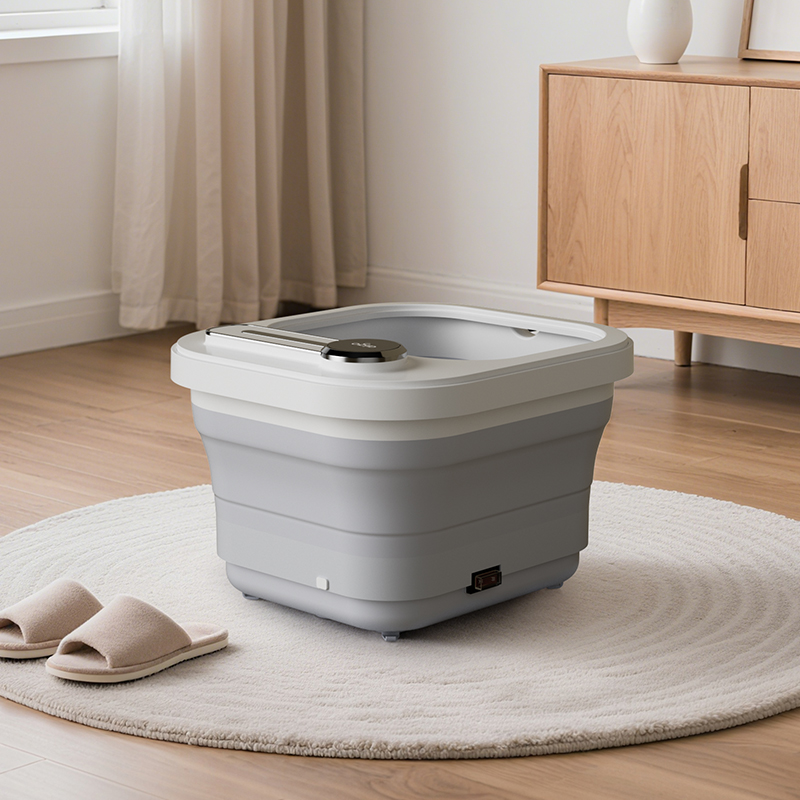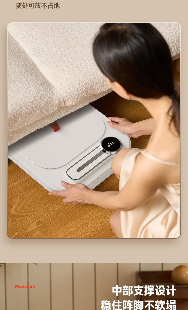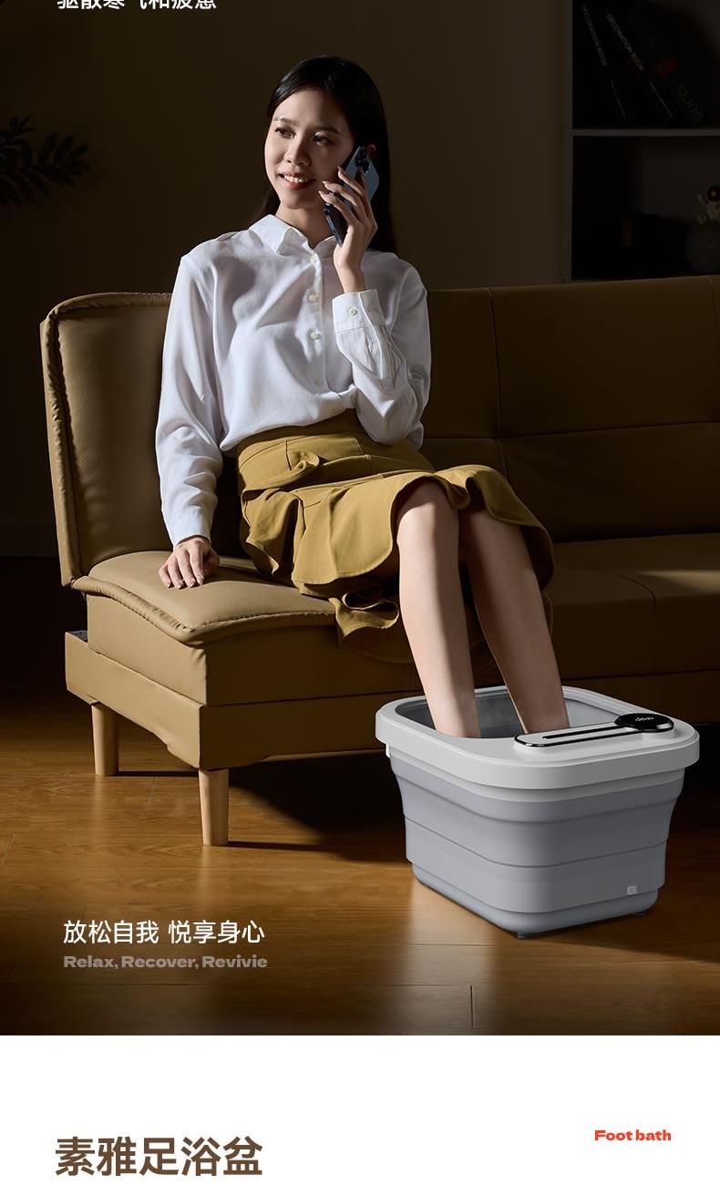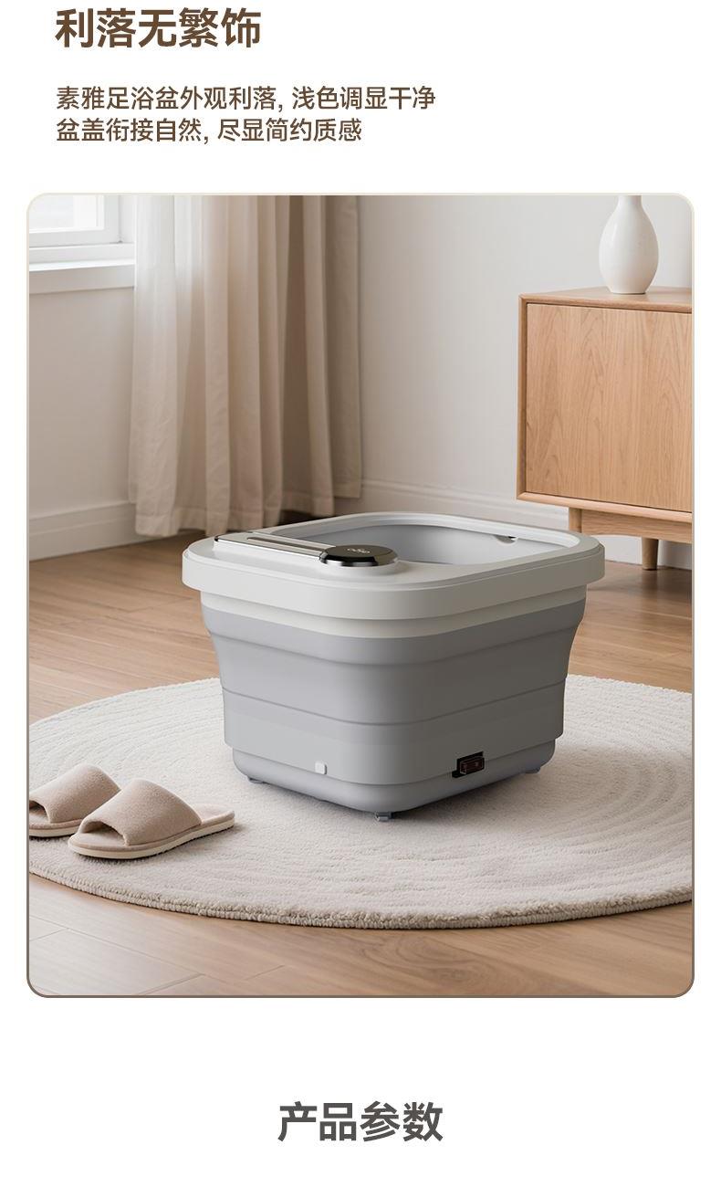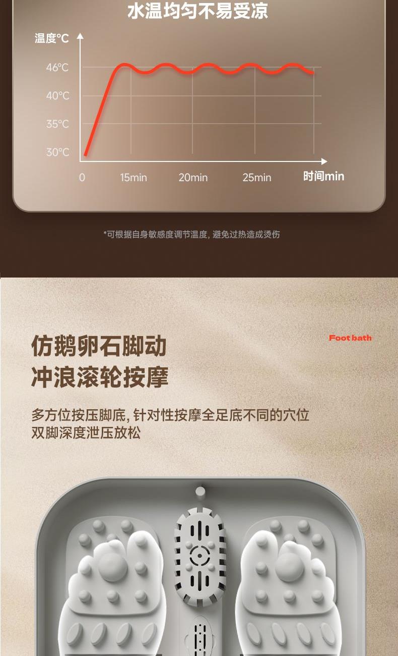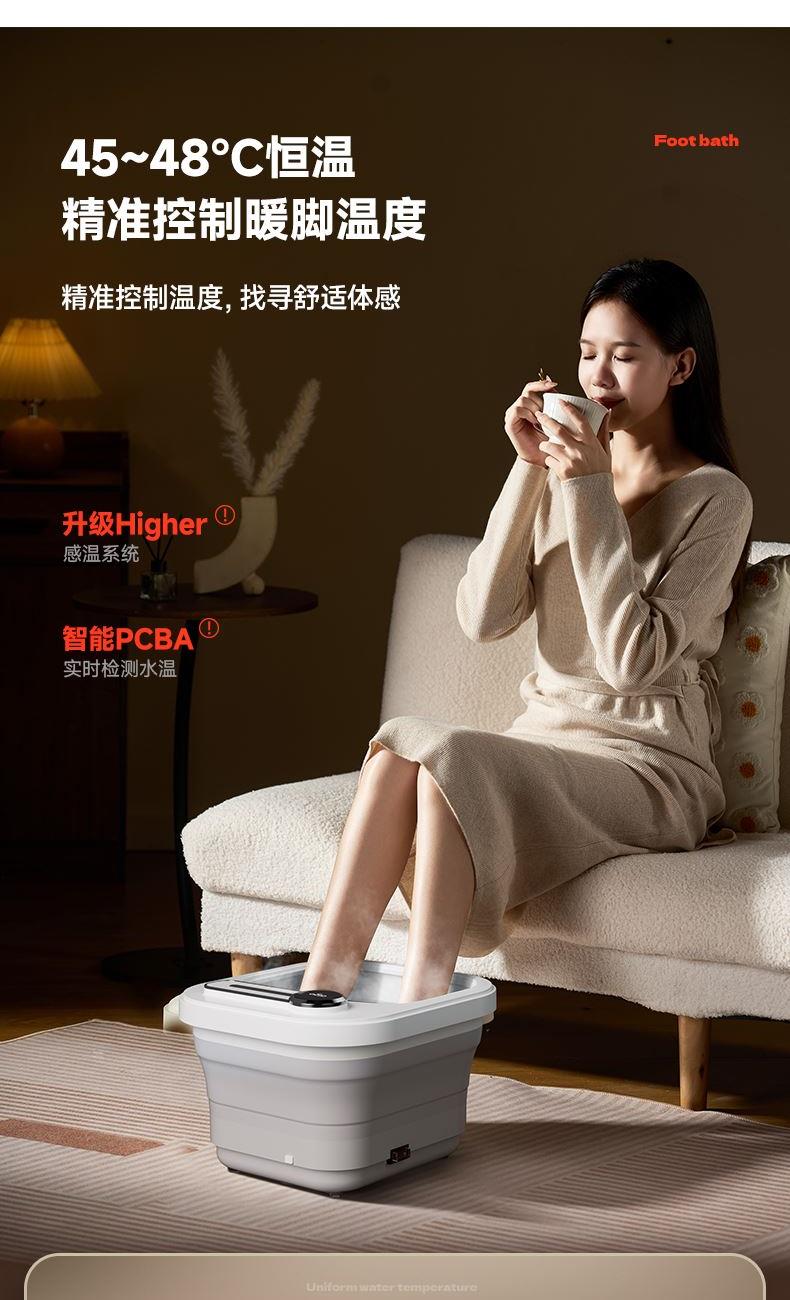 恒温加热、滚轮按摩,仿真人太极揉捏 1秒折叠收纳、底部收线功能,轻巧便携 行业首创带挂壁收纳,壁挂专 利,轻松收纳 喷泉按摩,涌泉冲浪 红光理疗,温暖舒适,促进皮肤健康 水电分离、双重绝缘:PTC热敏电阻加热,三层绝缘 功率:500W 加热温度:45-48℃ 容量:10升 毛重:1.9Kg 净重:1.5Kg 折叠尺寸:37*32*12cm 打开尺寸:37*32*23.5cm 材质:pp+ABS+TPE软性材料 彩盒尺寸:330*140*373mm 外箱尺寸:730*340*390mm
