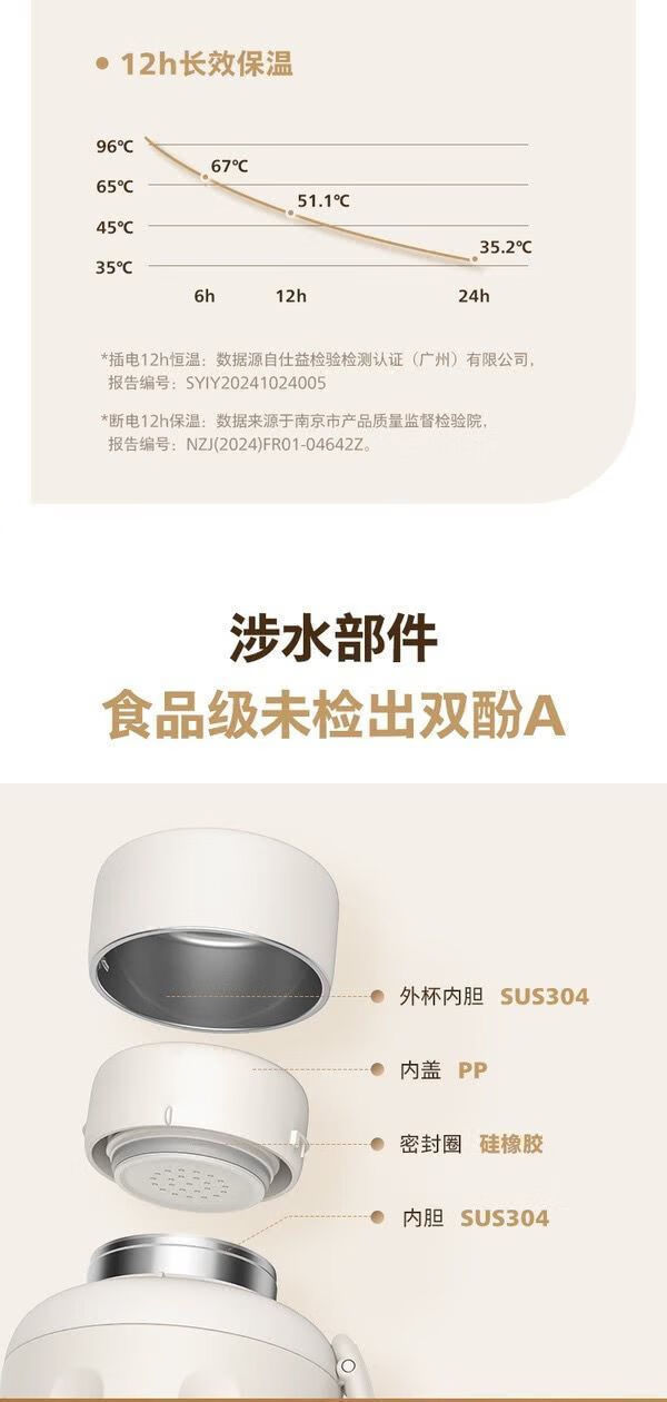 800W大功率 升级容量7杯热饮 1L大容量 4档烧水温度 一杯双盖 12小时长效保温