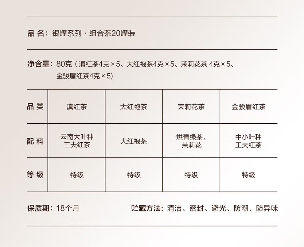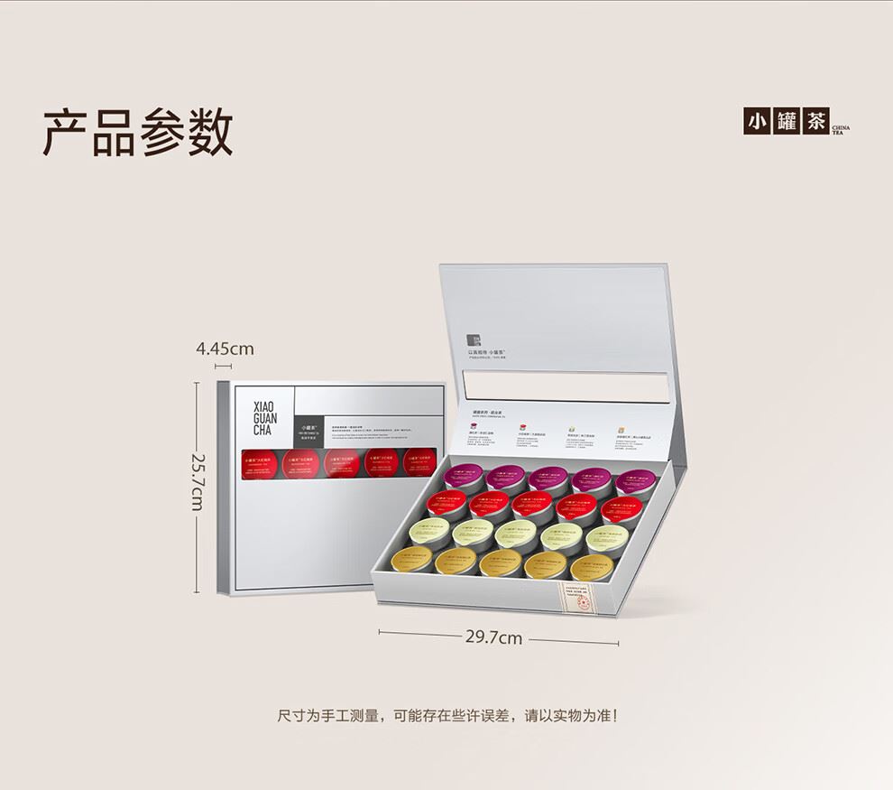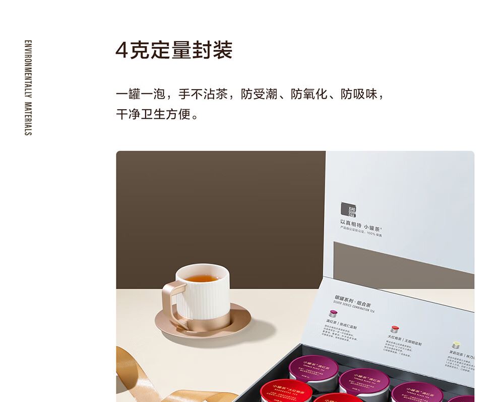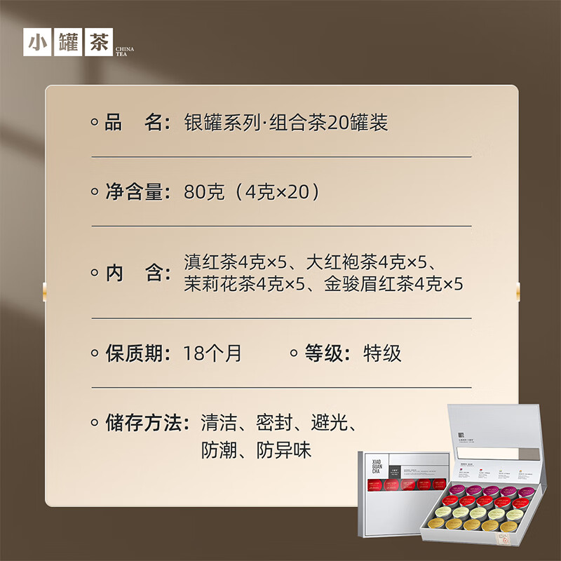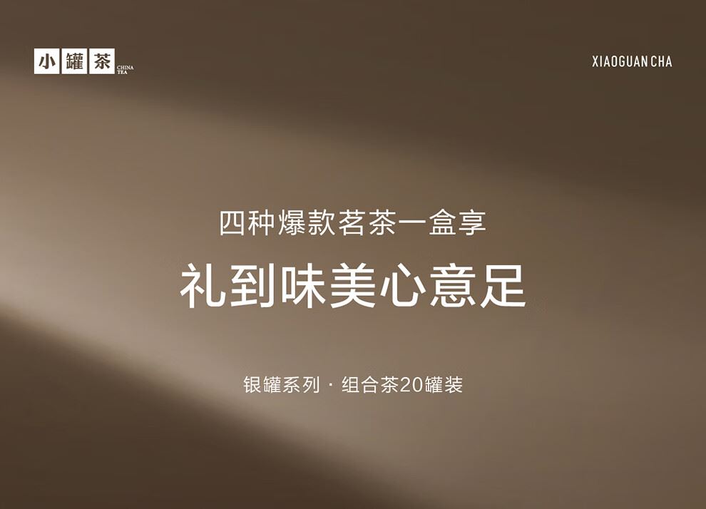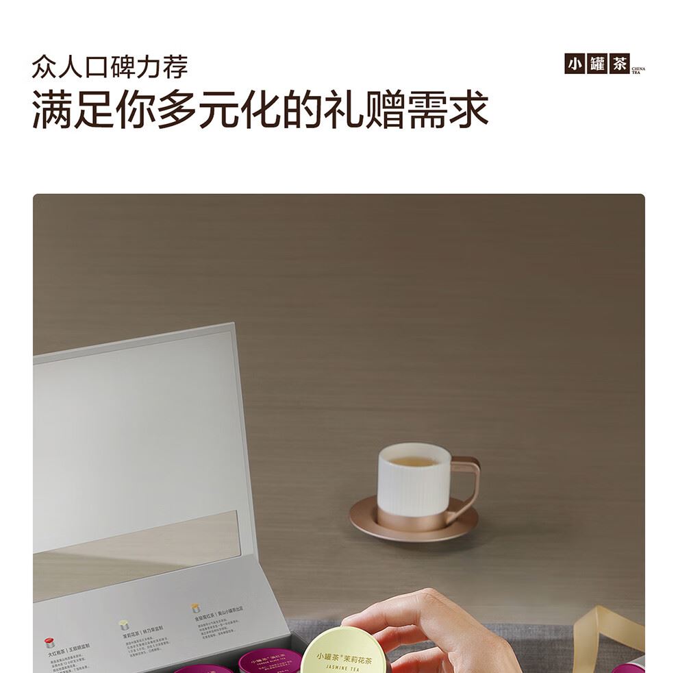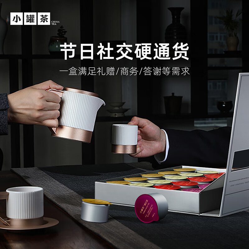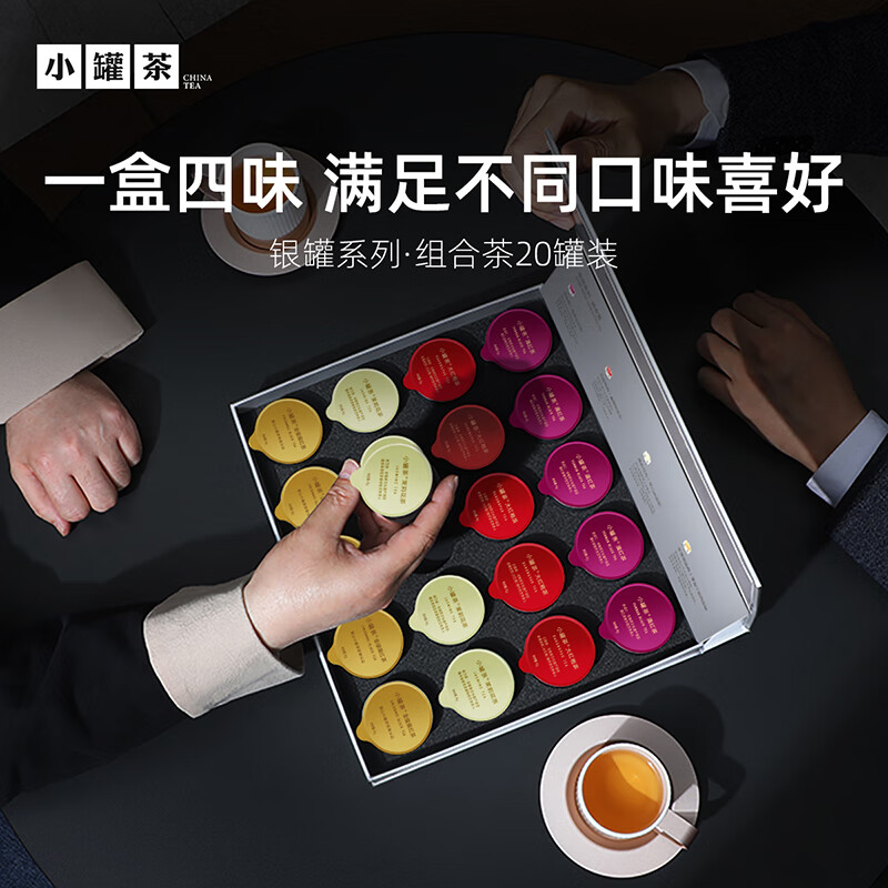 轻奢商务茶叶pinpai-小罐茶 小罐茶全国线下2000+实体门店 小罐茶 x 敢保真(产地保真、年份保真、安全保真) 档次商务送礼就送小罐茶 四种经典茗茶一盒享 礼到味美心意足 科学做茶 让好茶有标准 精致礼盒包装,送礼体面彰显尊贵。20罐独立包装传递十全十美的祝福。一饮一罐,定量封装,手不沾茶,更显品位。 宜礼宜饮 适用多种社交场景传递美好情谊 一盒满足礼赠贵宾、商务会面、重要答谢等需求。 银罐系列·组合茶20罐装