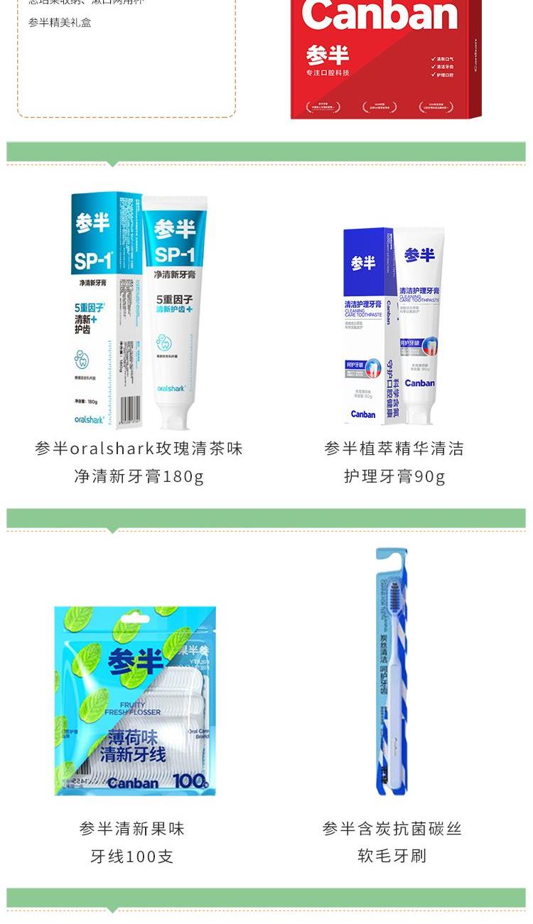 参半oralshark玫瑰清茶味净清新牙膏180g 参半植萃精华清洁护理牙膏90g 参半含炭碳丝软毛牙刷 参半清新果味牙线100支 思珀莱收纳、漱口两用杯 思珀莱精美礼盒