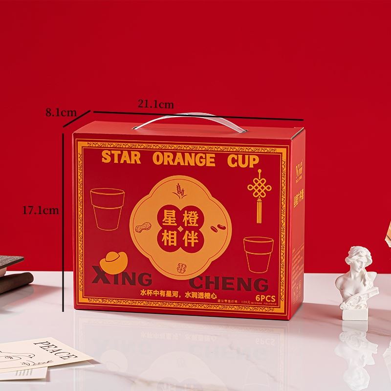 货号:A-XC/L6 星橙六件套(烟灰/橙色) 规格:16套 组合:杯*6(180ml) 产品卖点:星橙玻璃杯,加厚玻璃材质,圆润杯口贴合唇感,饮用顺滑,厚底防滑稳固,放置桌面稳如磐石,「活力橙」与「雅致烟灰」两款配色,橙色如暖阳点亮餐桌,烟灰似墨韵沉淀质感,简约线条勾勒现代美学,适配北欧风、轻奢风等多种家居风格,轻松融入生活场景,一手可握,独饮尽兴、共饮温馨 彩盒尺寸:21.1*8.1*17.1CM 外箱尺寸:44*34.6*36.2CM 重量:16.5KG