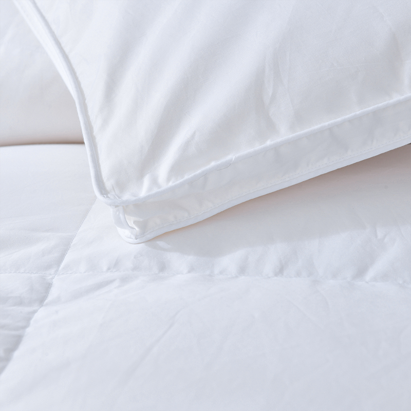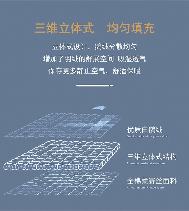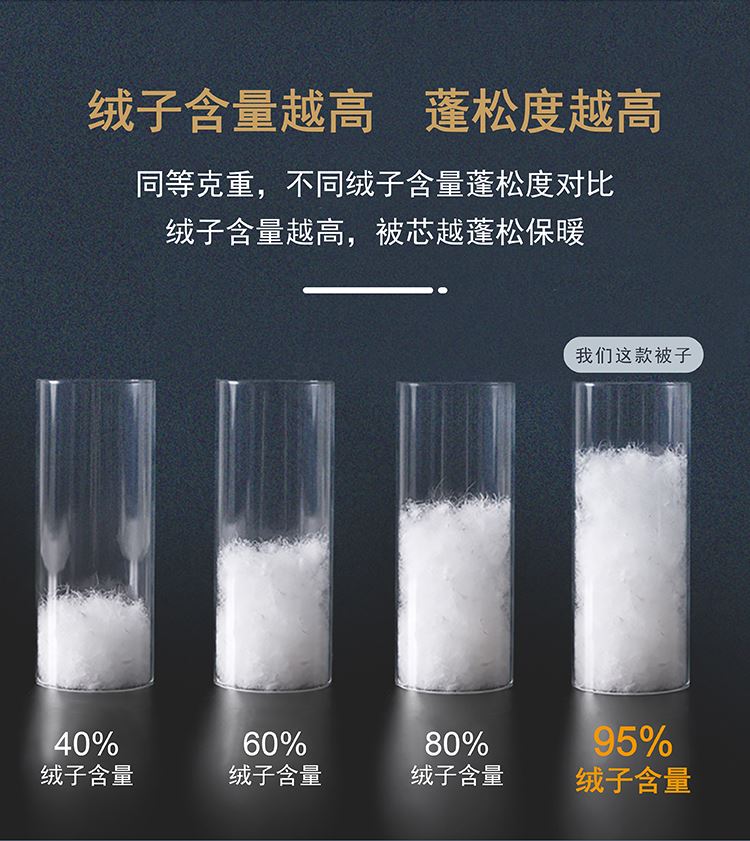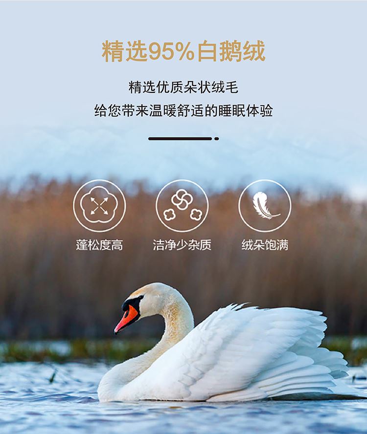 尺寸:200x230cm 填充物:1300g 被重:2700g 【面 料】 糯棉(65%棉+35%防羽棉) 【填充物】95白鹅绒(含绒量95%) 产品特点: 1.精选95%白鹅绒,选用优质朵状绒毛,给您带来温暖舒适的睡眠体验; 2.三维立衬式设计,鹅绒分散均匀,吸湿透气,保存更多的静止空气,舒适保暖;立体边工艺,高品质享受; 3.选用全新糯棉面料,兼具棉柔质感的同时,超细密防钻绒,更富光泽与柔软感,翻身静音无烦恼。