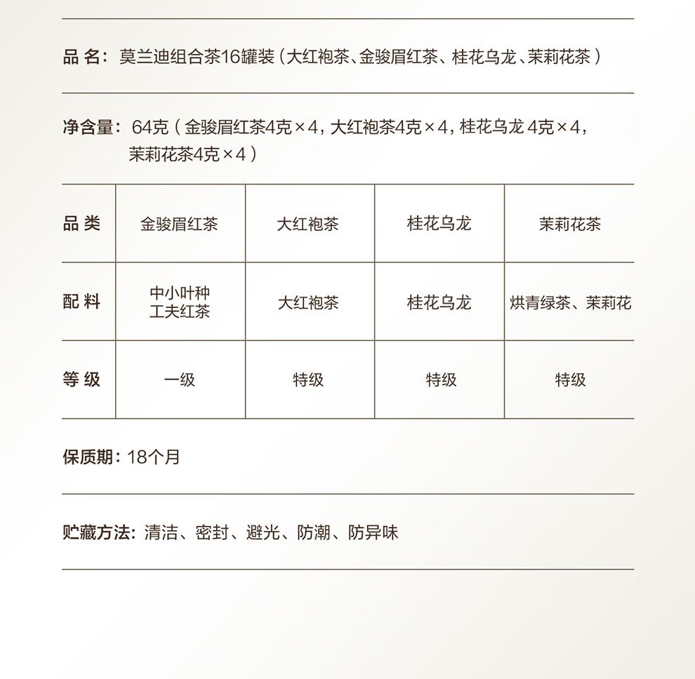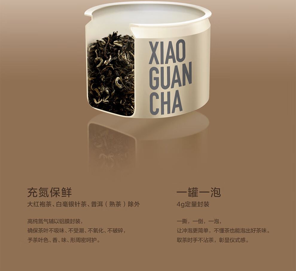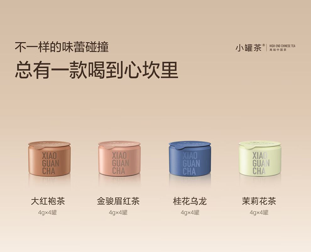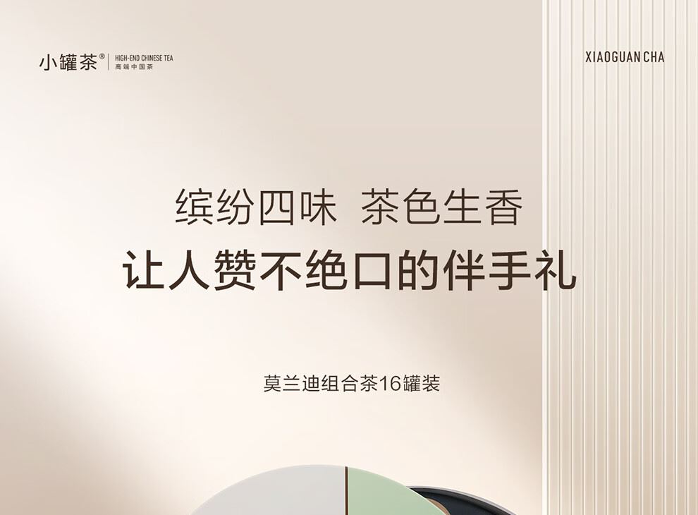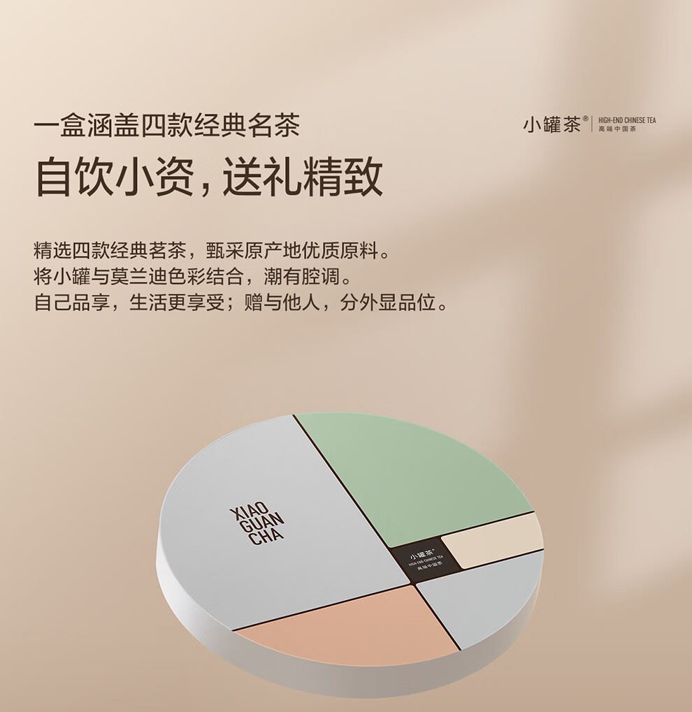 轻奢商务茶叶pin牌-小罐茶 小罐茶全国线下2000+实体门店 小罐茶 x 敢保真(产地保真、年份保真、安全保真) 档次商务送礼就送小罐茶 缤纷四味 茶色生香 让人赞不绝口的伴手礼 莫兰迪组合口味茶16罐装 不一样的味蕾碰撞 总有一款喝到心坎里 净含量:64克(金骏眉红茶4克x4,大红袍茶4克x4,桂花乌龙茶4克x4,茉莉花茶4克x4) 一盒涵盖四款经典名茶 自饮小资,送礼精致 精选四款经典茗茶,甄采原产地优质原料。 将小罐与莫兰迪色彩结合,潮有腔调。 自己品享,生活更享受;赠与他人,分外显品位。