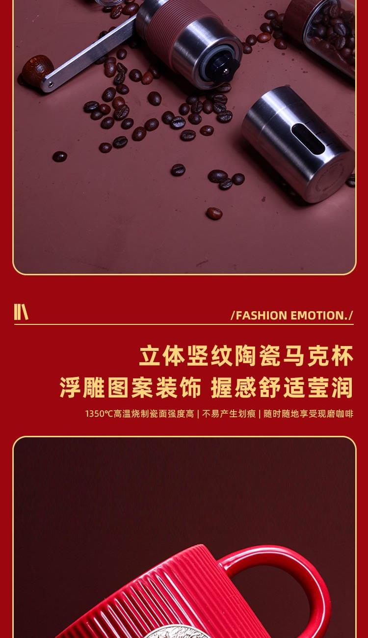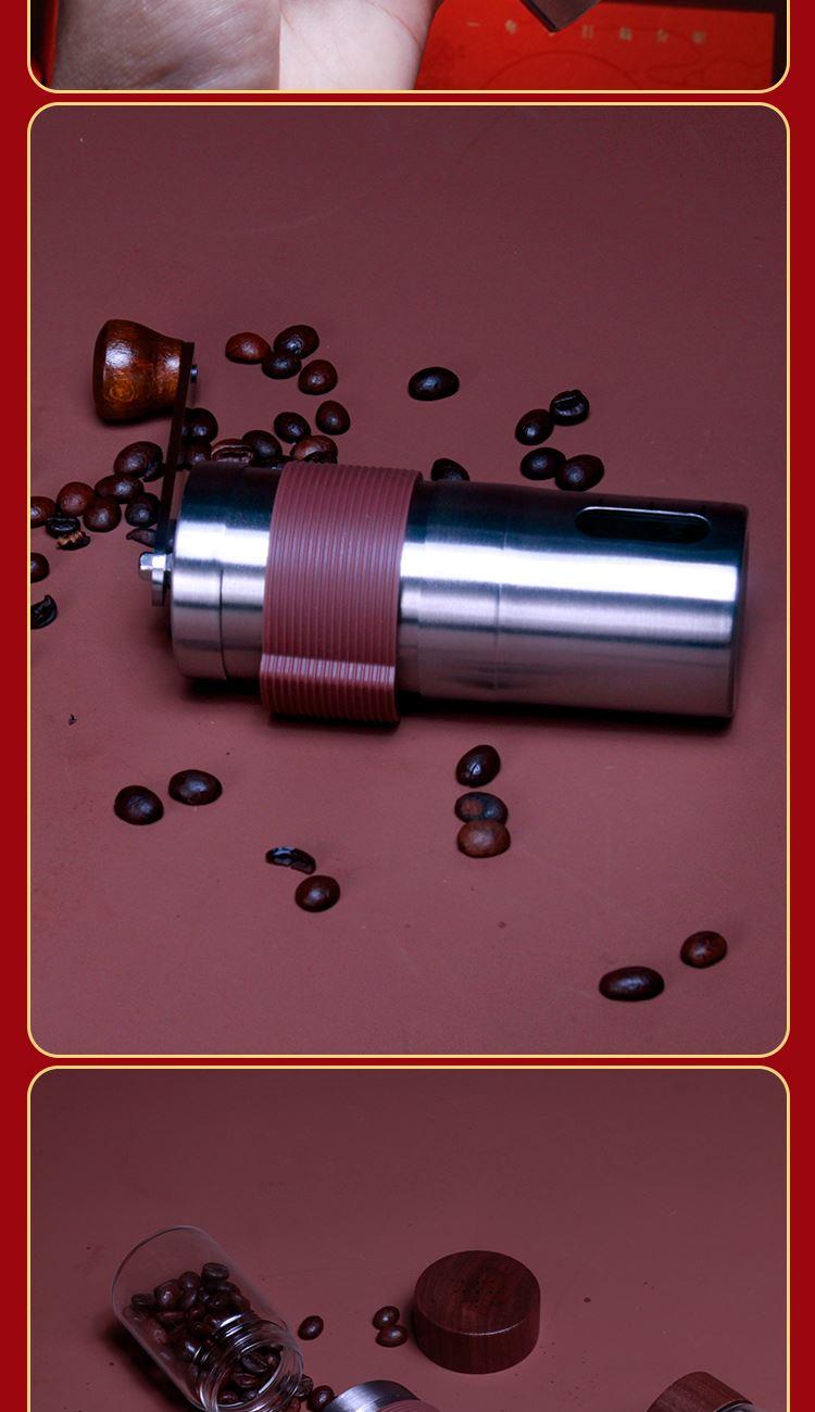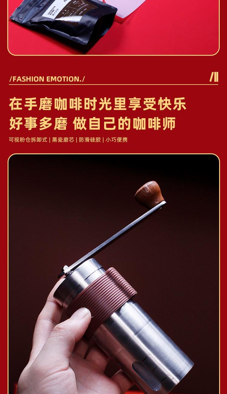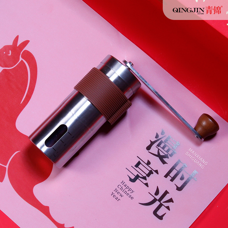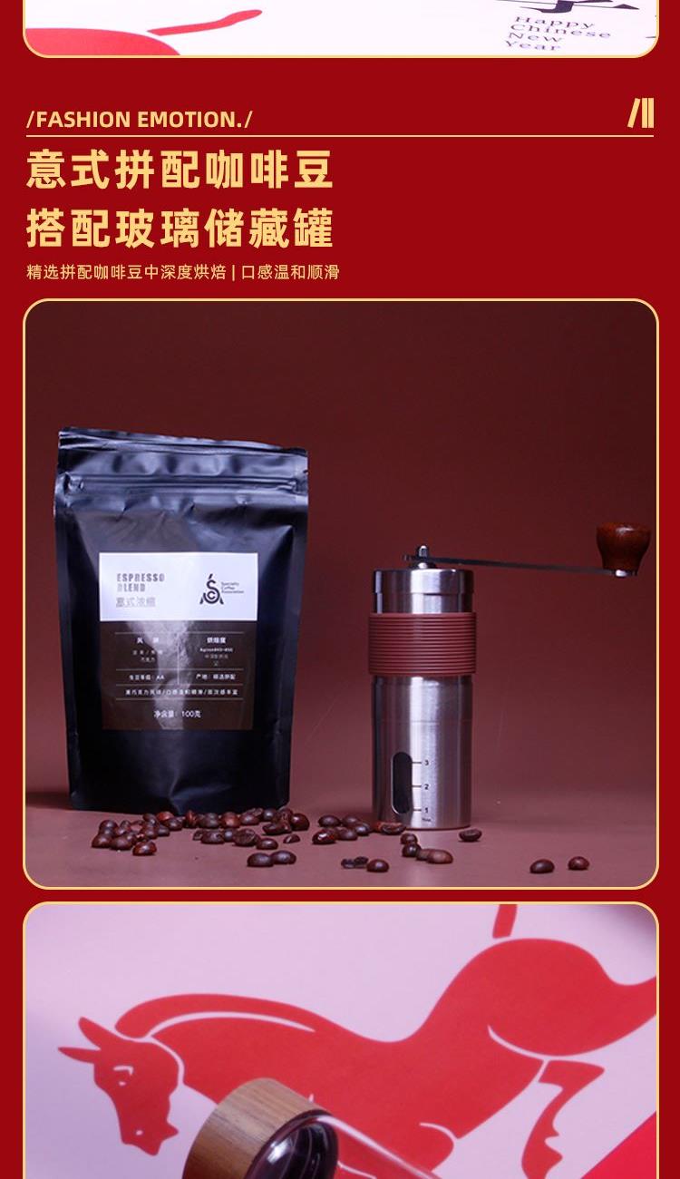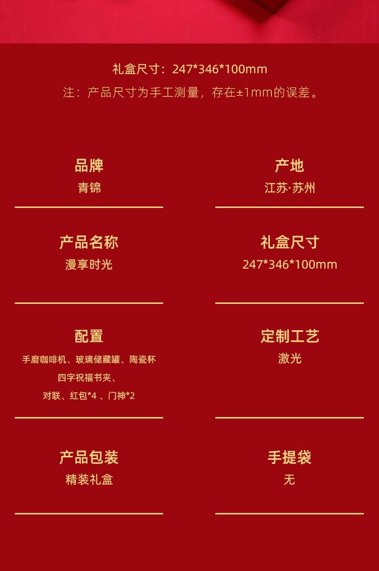 手磨咖啡机*1 意式拼配咖啡豆*1袋(100克) 玻璃保鲜便携豆罐*1 红色咖啡杯*1说明书*1 对联*1-红包*4 门神*2 精装礼盒手提袋*1