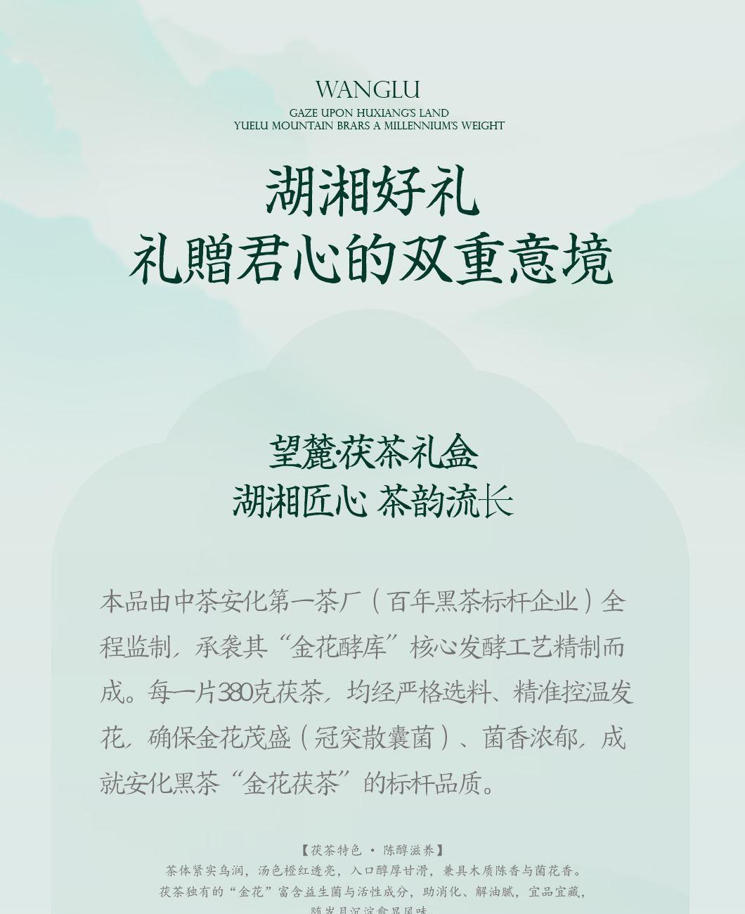 「望麓」以湖湘山水为砚,文化精魂为墨,为商务礼赠注入一份可触摸、可品饮的人文温度。让人在赠与间,传递敬意与远见。 内容清单 手筑茯茶 380gx1块 实木摆件湘绣x1 包装材质:精装礼盒 保质期:可长期保存 单盒外包装尺寸:380*270*75mm 单盒重量:约1700g 储存条件:避光、通风、阴凉干燥