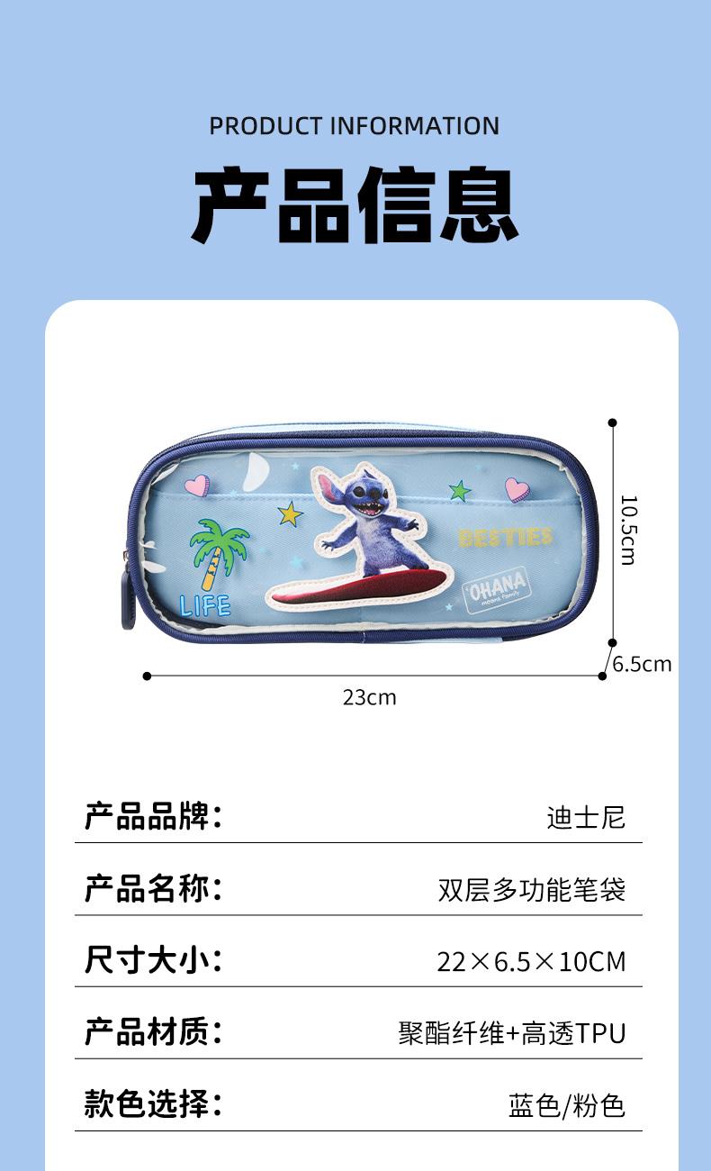材质:聚酯纤维+高透TPU 尺寸:22*6.5*10.5CM 卖点: ①萌趣又实用双层多功能笔袋 ②两层大容量文具轻松收纳,分层设计,方便收纳 ③贴心小细节让您体验感拉满 ④精美可爱卡通图案、透明视窗设计、流畅顺滑拉链
