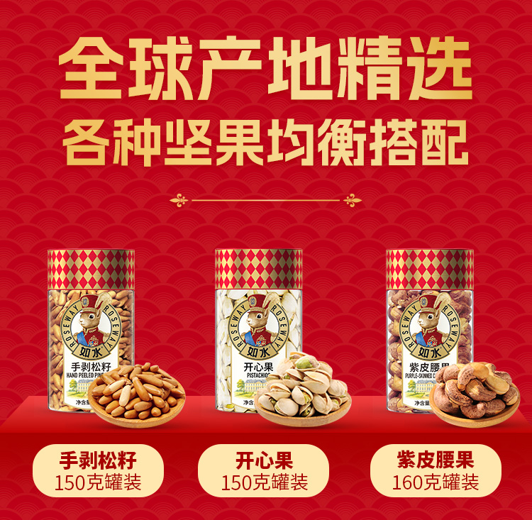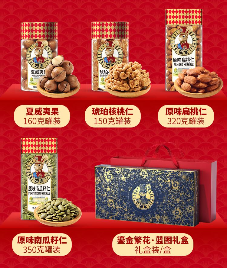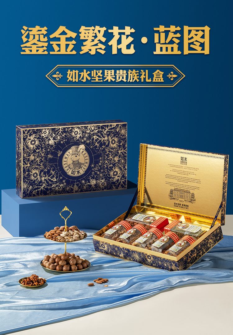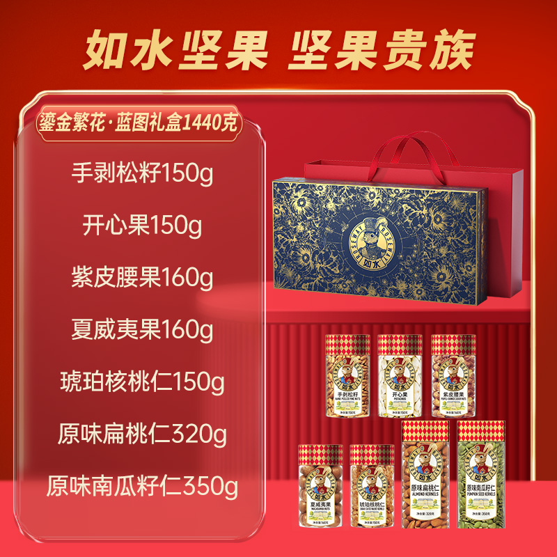 如水鎏金繁花·蓝图礼盒 净含量:1440g 如水手剥松籽150g 如水开心果150g 如水紫皮腰果160g 如水夏威夷果160g 如水琥珀核桃仁150g 如水原味扁桃仁320g 如水原味南瓜籽仁350g