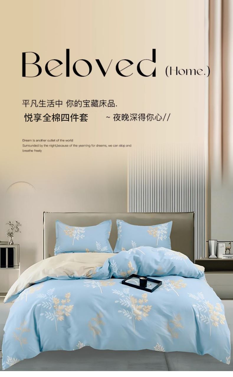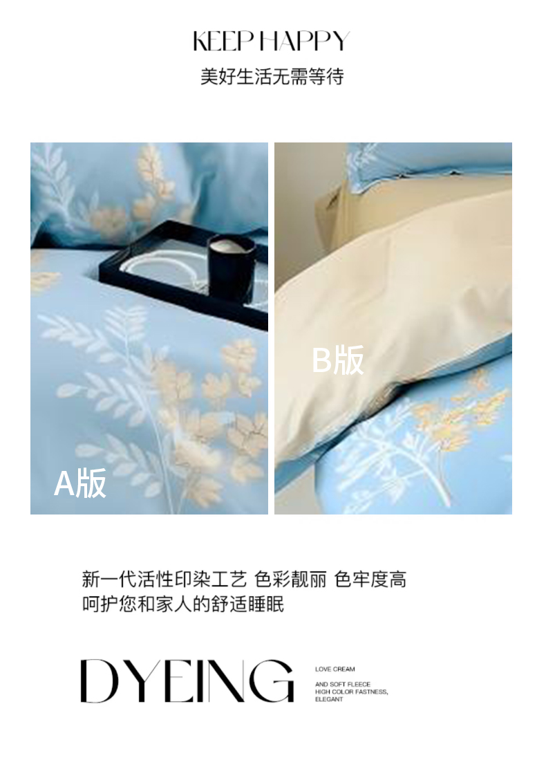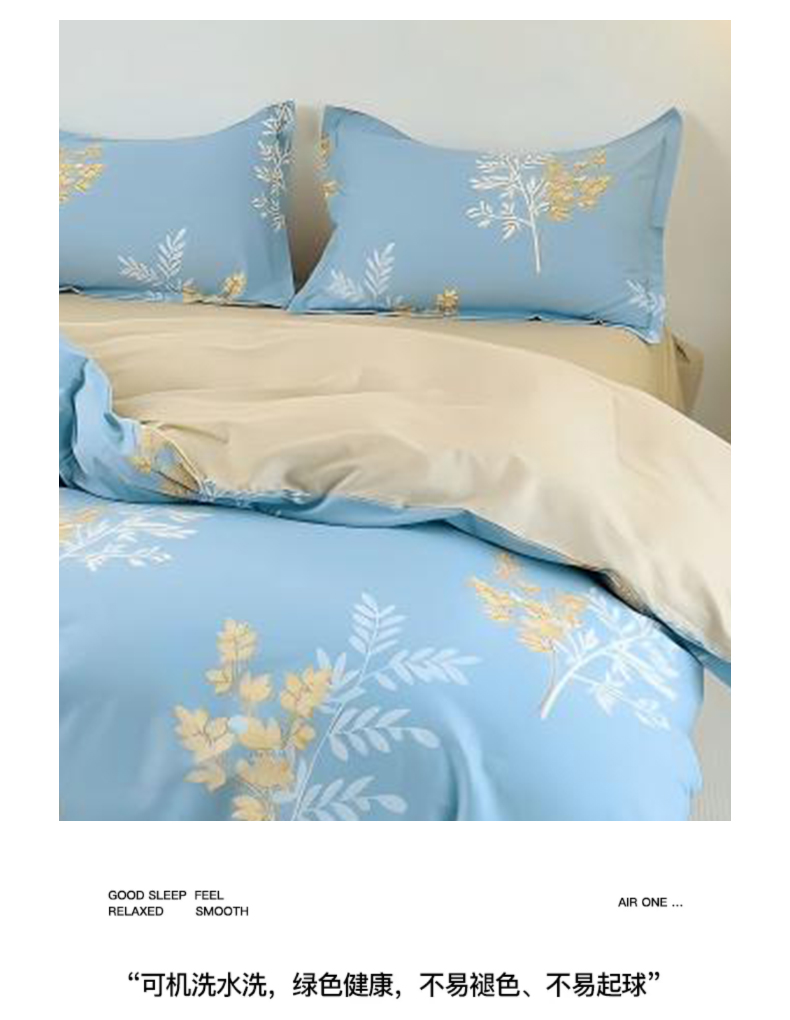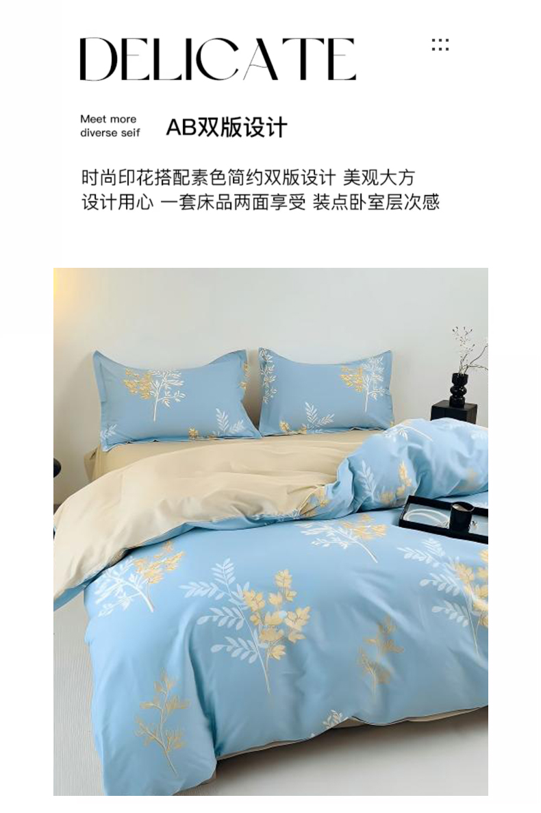 2.生态活性印染,图案色牢度高,久洗仍保持鲜艳如新。AB版双面设计巧妙融合现代美学,轻松匹配各种卧室装修风格。