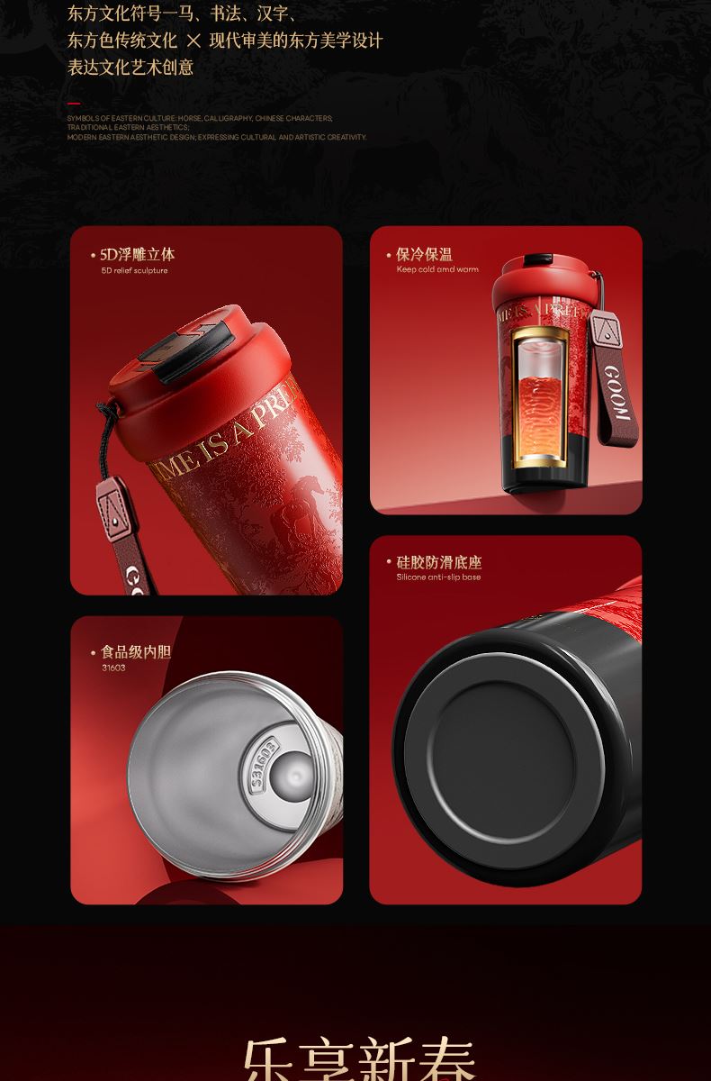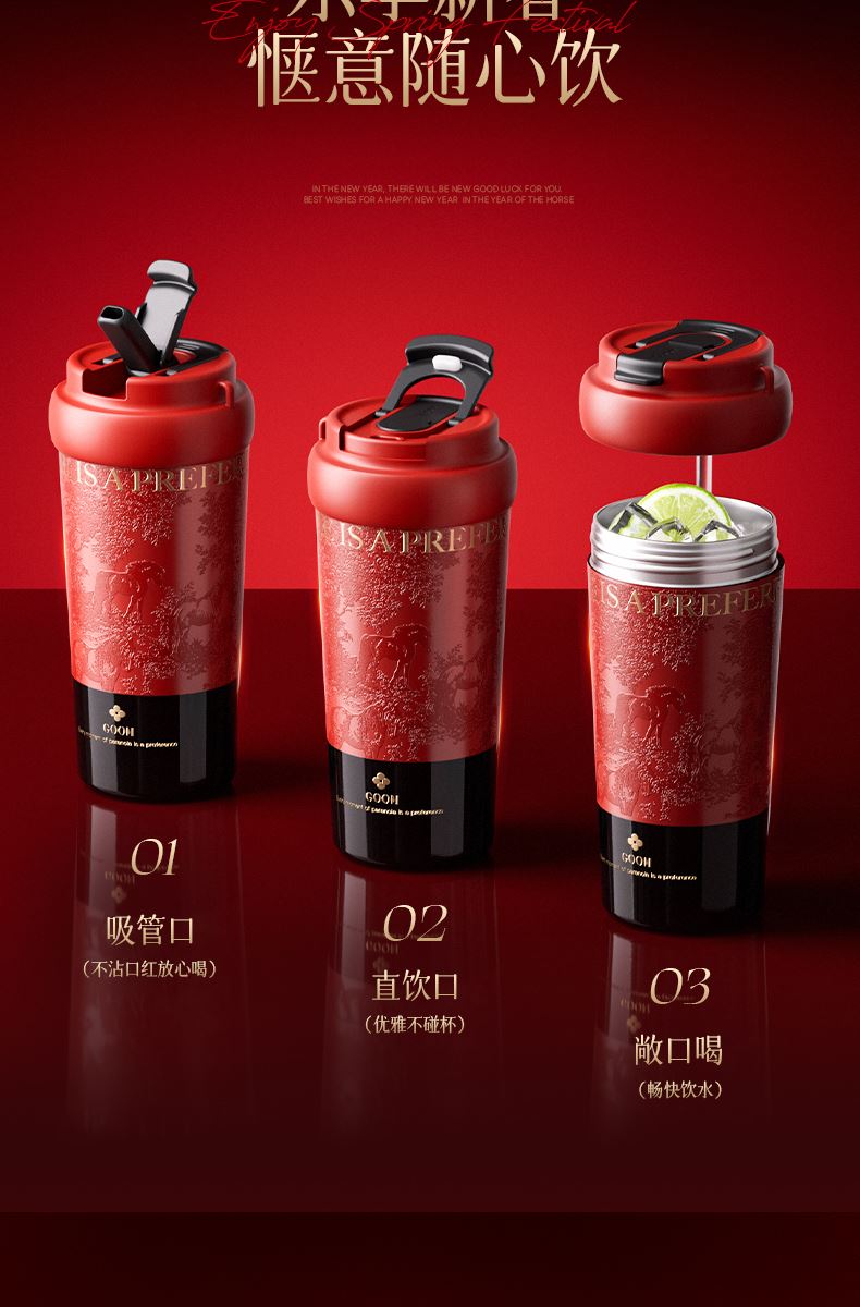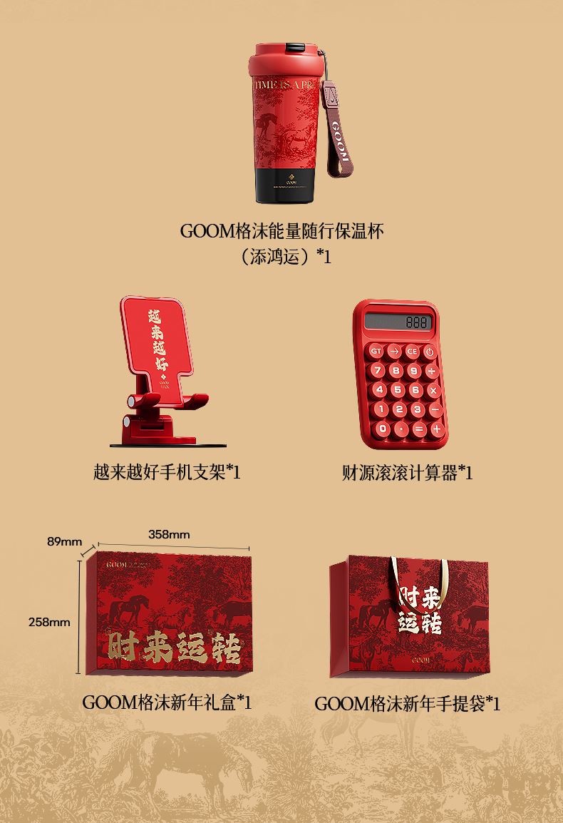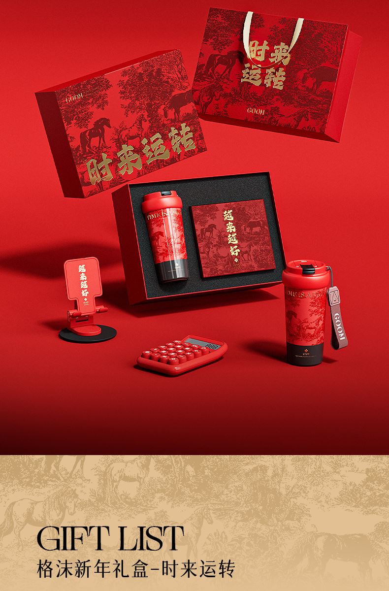 颜 色:红色 配 置: 格沫能量随行保温杯(添鸿运)*1 越来越好手机支架*1 财源滚滚计算器*1 1、一杯三饮:敞口(可挂耳&拉花)、直饮口(小口防呛)、吸管口(唇妆不花)2、越来越好手机支架为你添助力,伴你生活每一天 3、财源滚滚计算器让你财气多多,烦恼归零 4、新春限定礼盒,把福气转回家