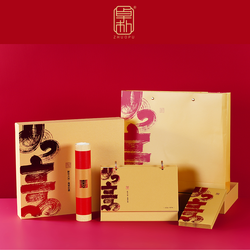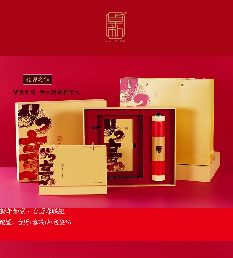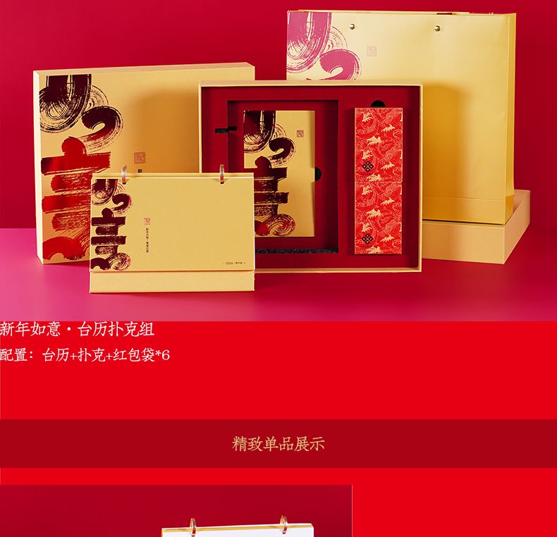 配置:台历+春联+红包袋*6 材质:珠光金纸+白卡+合金 尺寸:台历210*150mm 春联1180*210mm 红包袋170*90mm 包装:珠光金礼盒(302*262*53mm)+手提袋