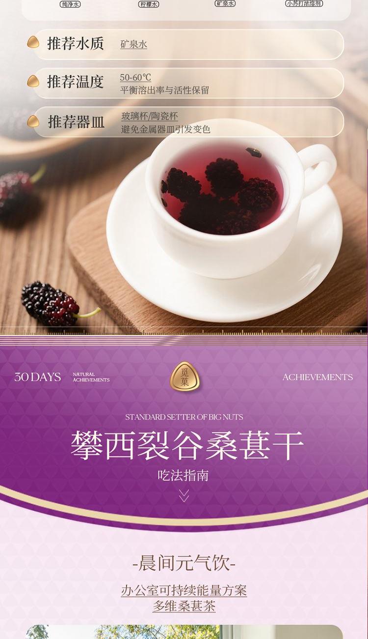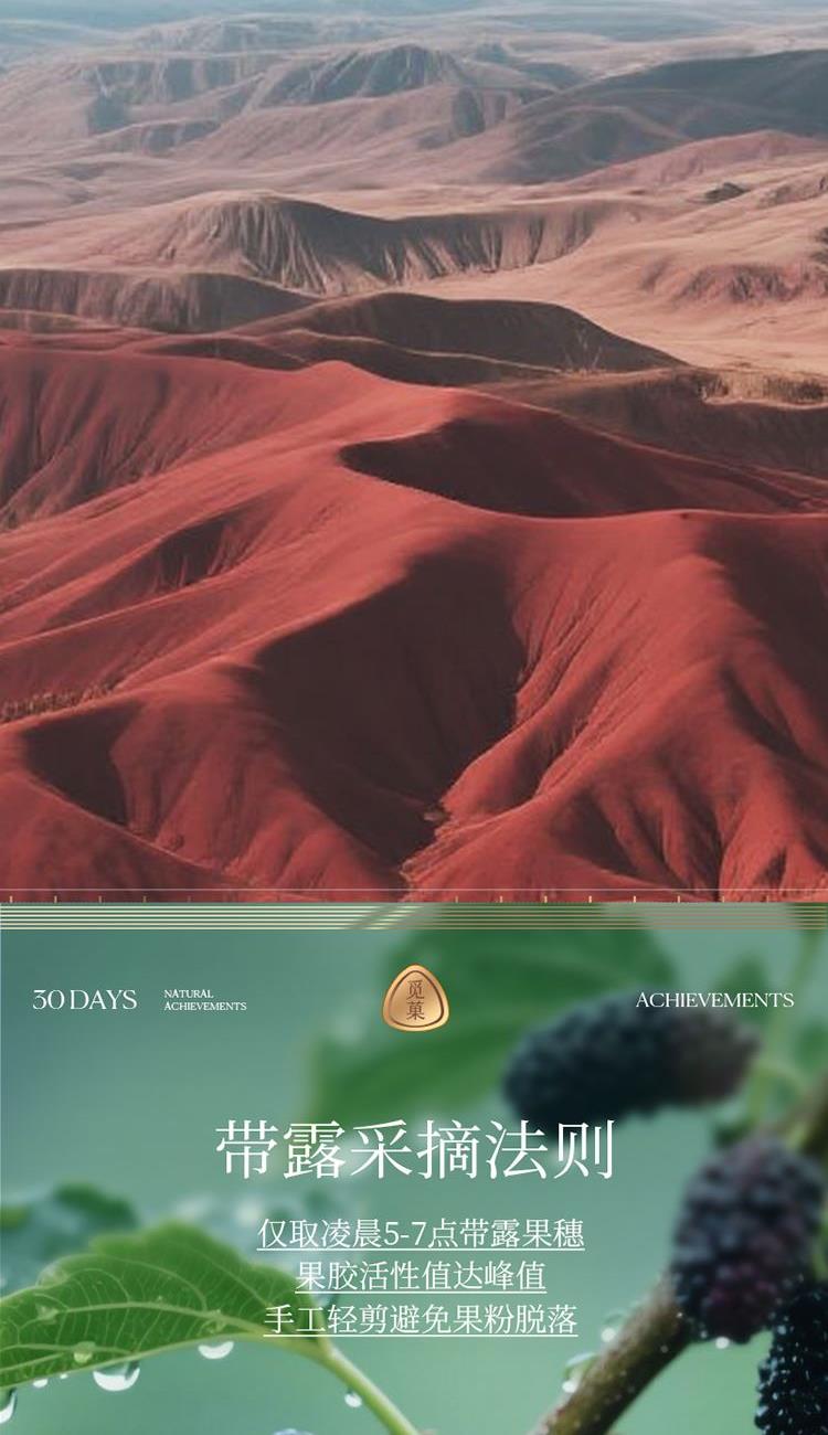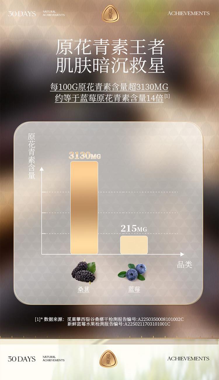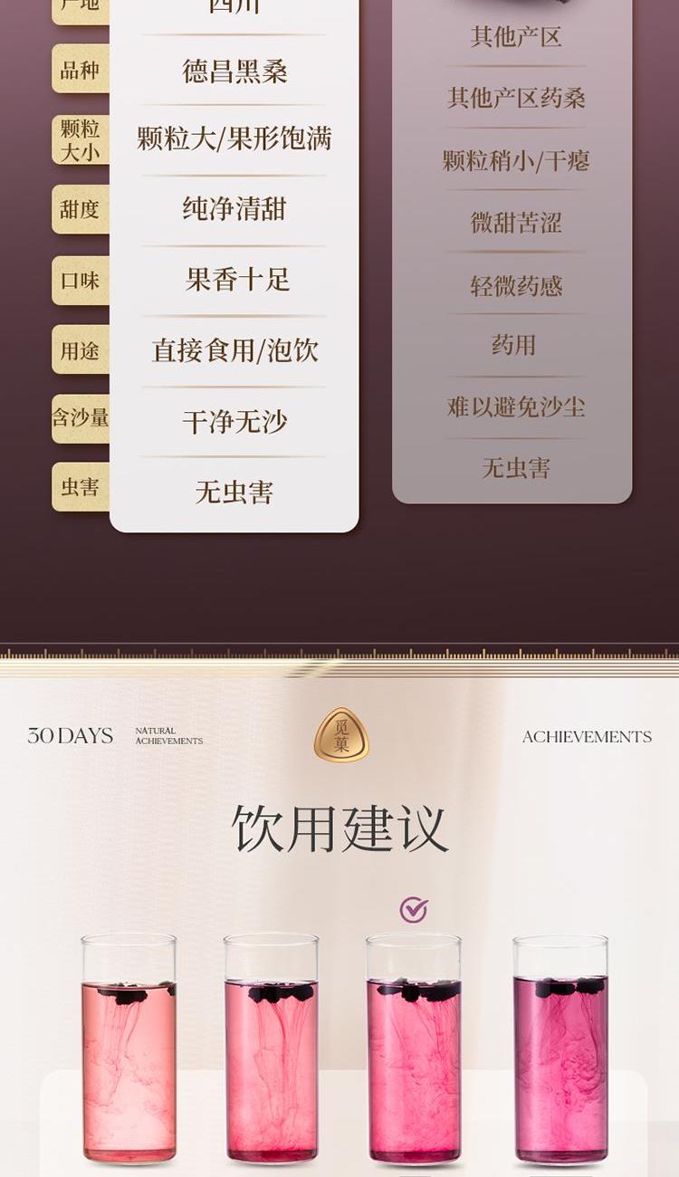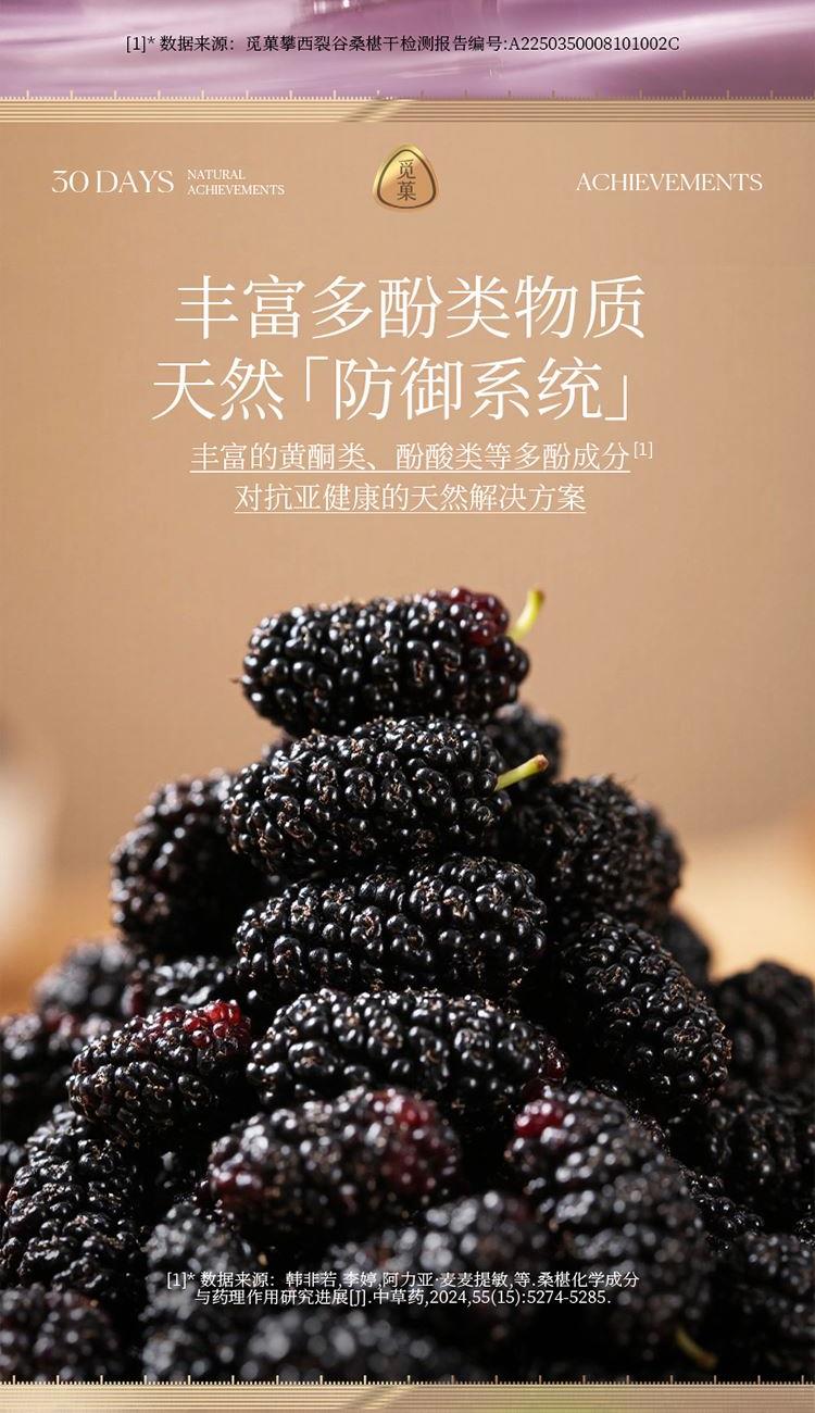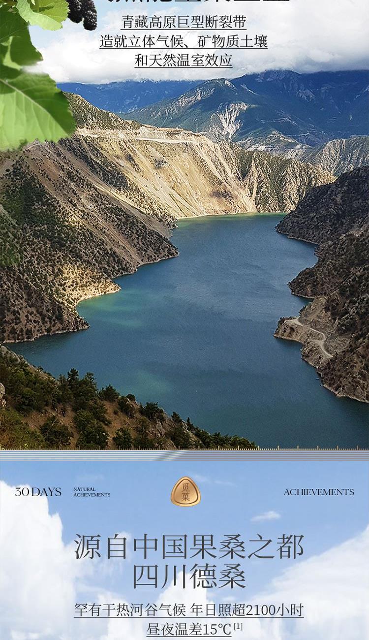 高贵品质 源自果桑之都四川德桑 罕有干热河谷气候 成就高贵品质 营养丰富 丰富多酚类物质 打造天然「防御系统」 丰富的多酚成分 对抗亚健康的天然解决方案 焕颜肌肤 肌肤暗沉救星 每100G原花青素含量 约等于蓝莓的14倍