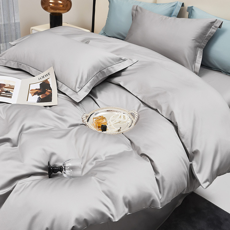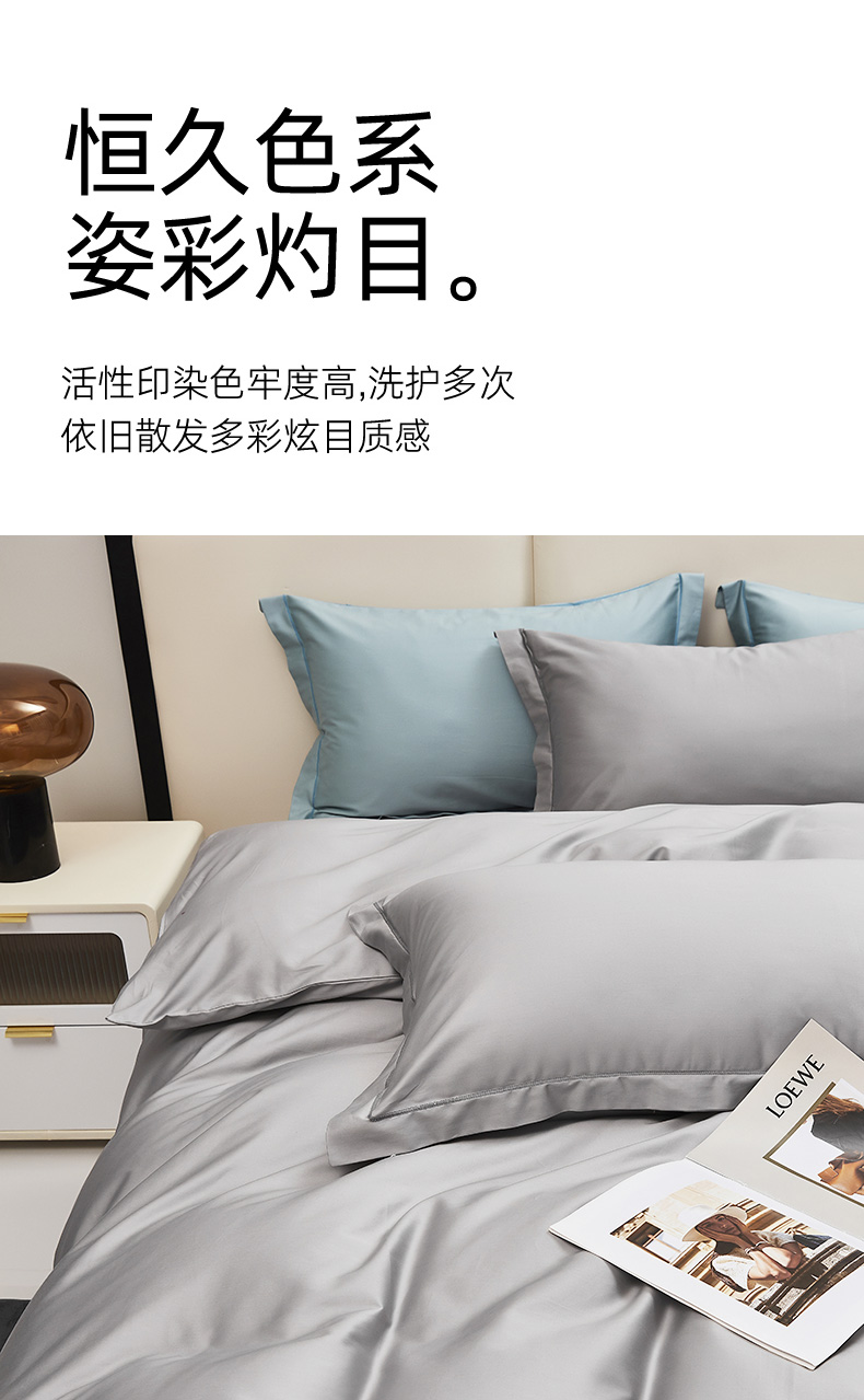 被套:200*230cm 床单:230*245cm 枕套:48*74cm*2 面料:长绒棉 执行标准:GB/T22796-2021 安全类别:GB18401-2010 A类 1.采用高支高密纺织工艺,面料更加紧密细腻,触感柔软舒适,透气性佳,带来奢华的睡眠体验。 2.活性印染:使用环保活性染料,色牢度高,不易褪色,安全无毒,呵护您的健康睡眠。