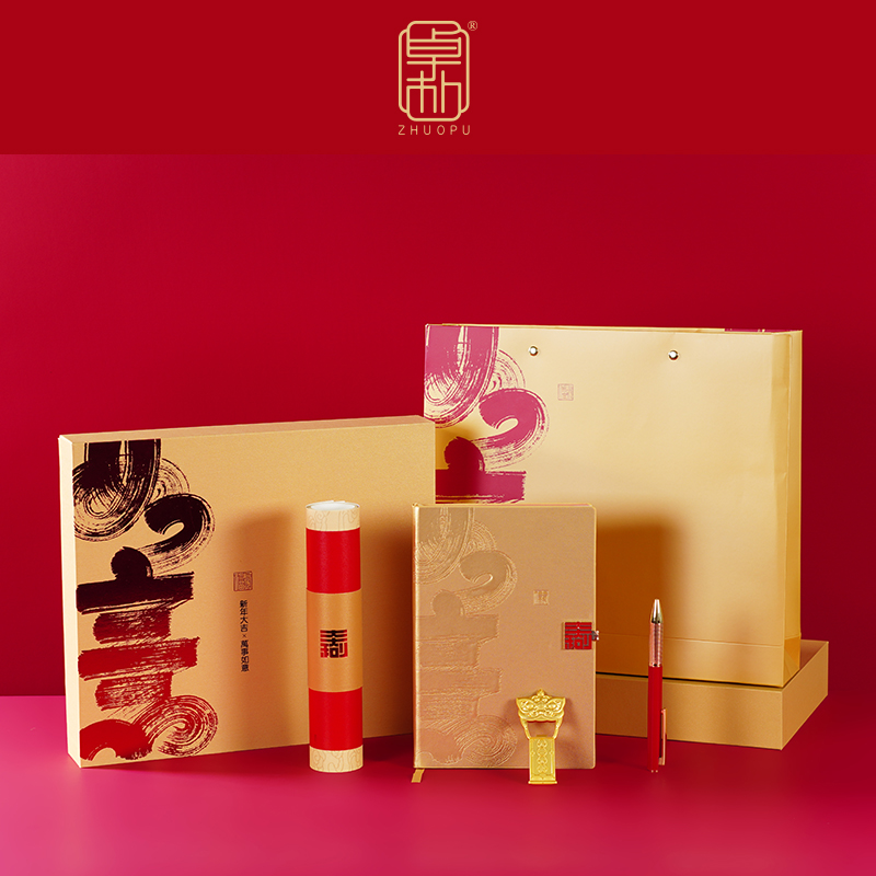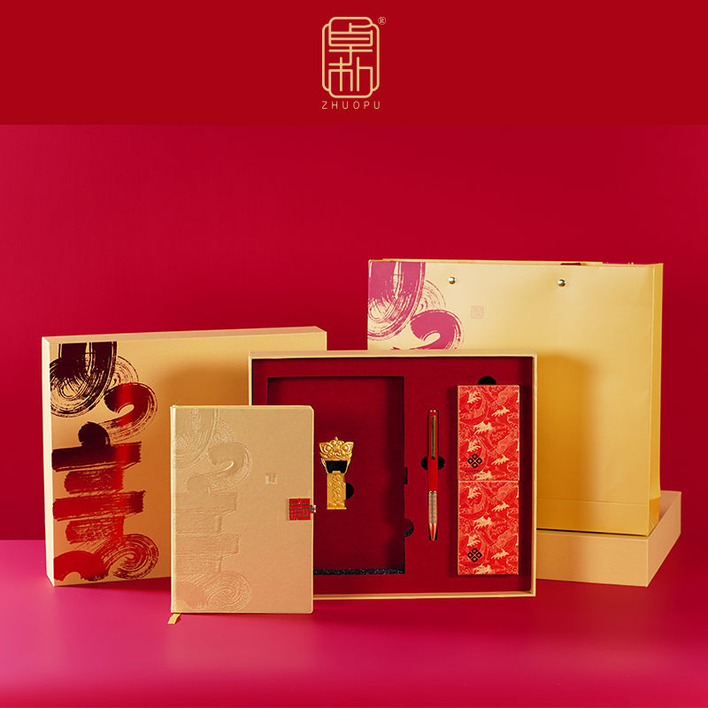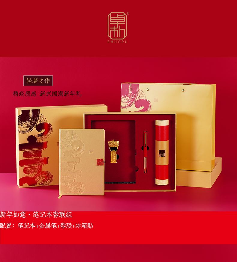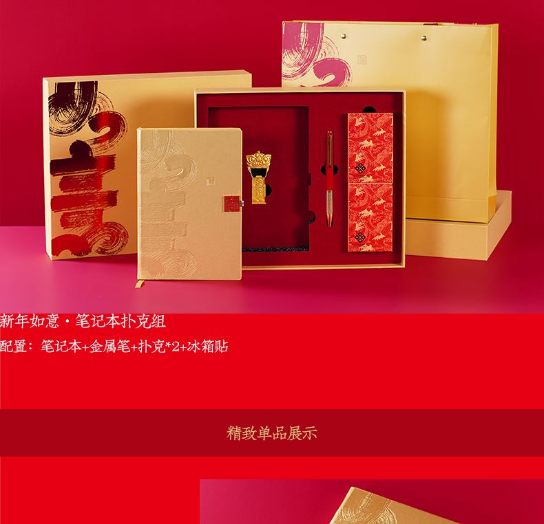 配置:笔记本+笔+春联+冰箱贴 材质:珠光金纸+白卡+合金+珠光皮 尺寸:笔记本145*210mm 签字笔138*11mm 春联1180*210mm 冰箱贴80*40mm 包装:珠光金礼盒(358*262*53mm)+手提袋