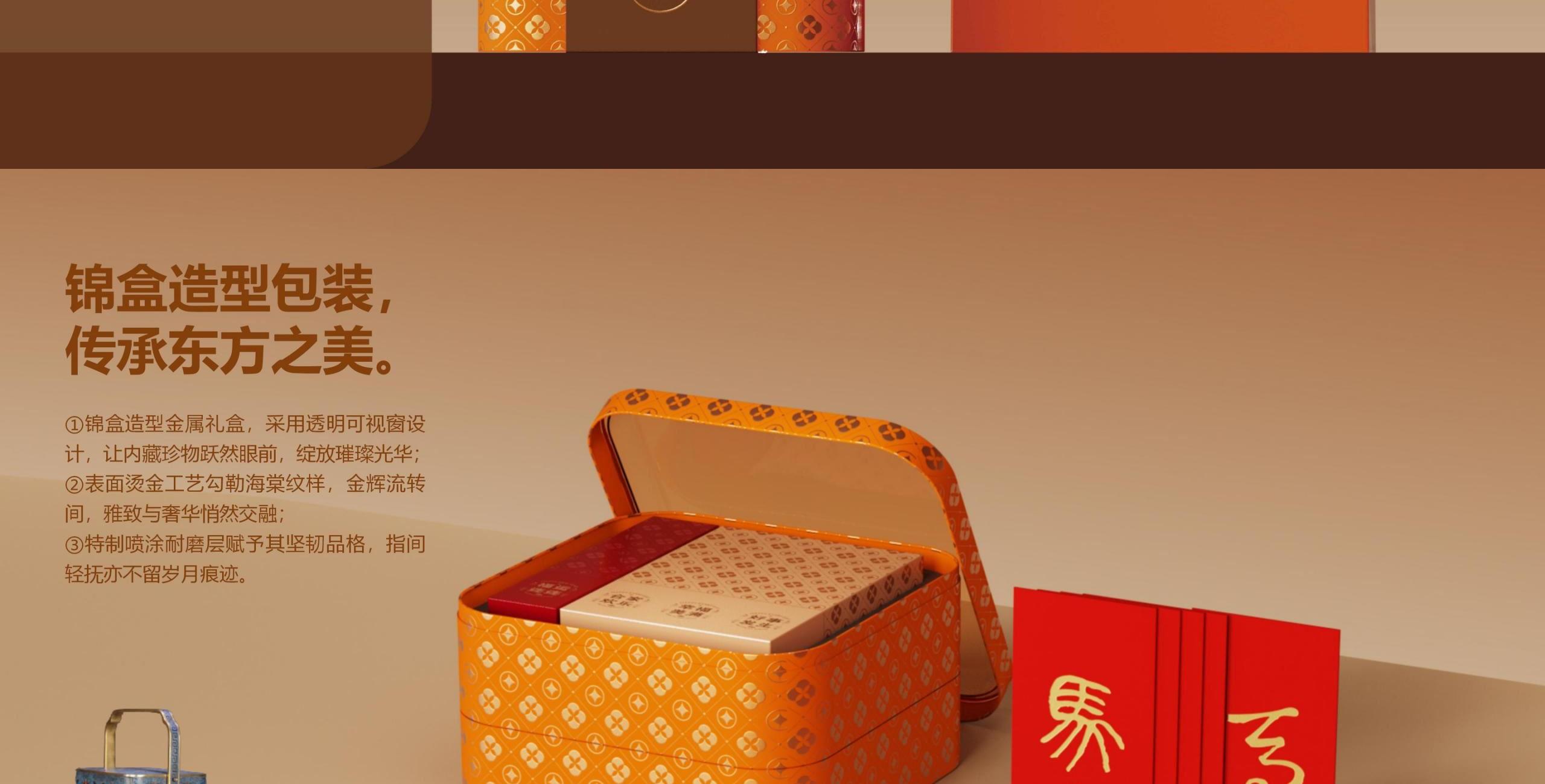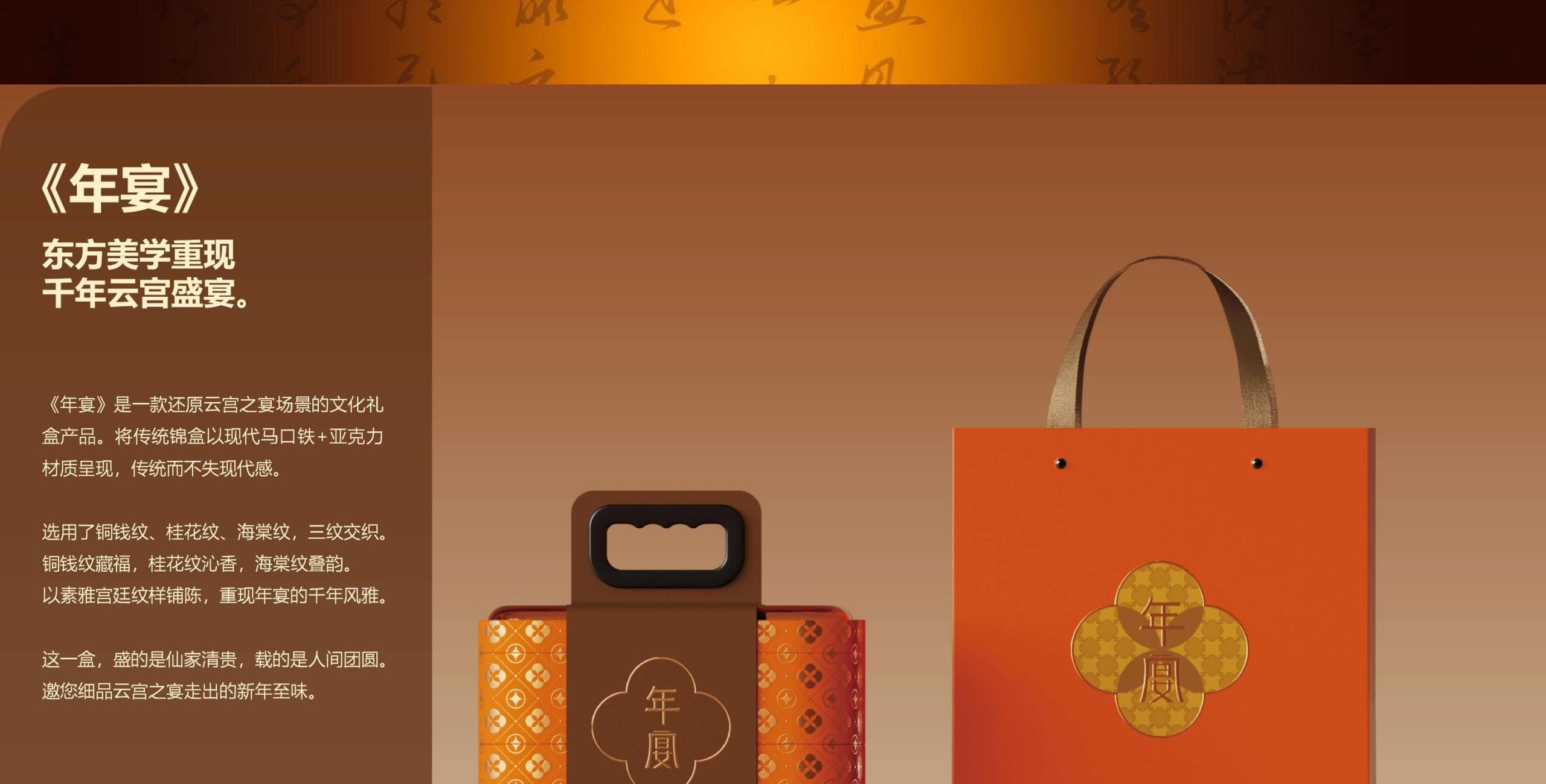 设计理念:《年宴》是一款还原云宫之宴场景的文化礼盒产品。将传统锦盒以现代马口铁+亚克力材质呈现,传统而不失现代感。