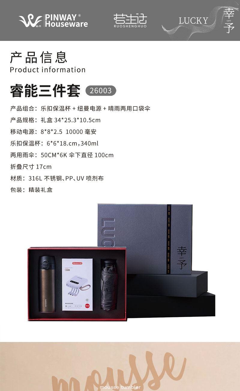 产品组合:乐扣保温杯+纽曼电源+晴雨两用口袋伞 产品规格:礼盒34*25.3*10.5cm 移动电源:8*8*2.5 10000毫安 乐扣保温杯:6*6*18.cm,340ml 两用雨伞: 50CM*6K 伞下直径100cm 折叠尺寸17cm 材质:316L不锈钢、PP、UV喷剂布 包装:精装礼盒