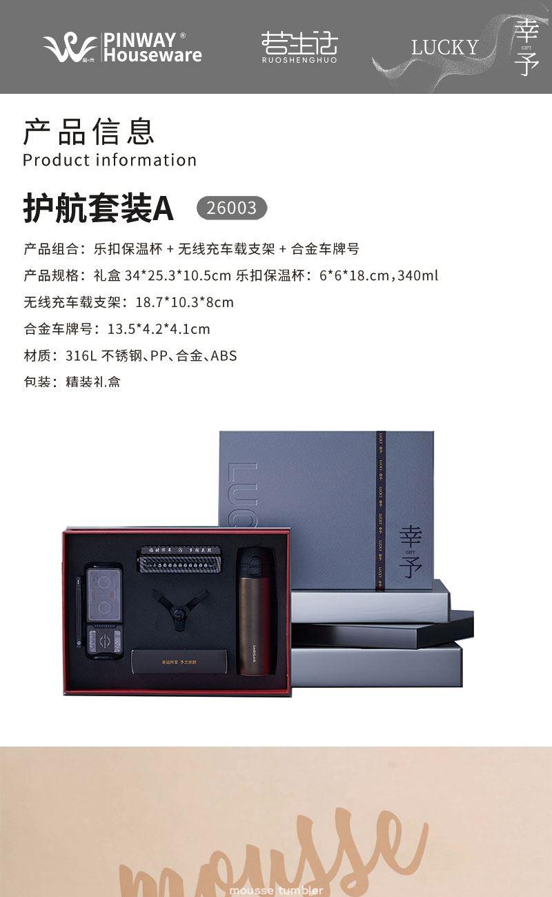 产品组合:乐扣保温杯+无线充车载支架+ 合金车牌号 产品规格:礼盒34*25.3*10.5cm 乐扣保温杯:6*6*18.cm,340ml 无线充车载支架:18.7*10.3*8cm 合金车牌号:13.5*4.2*4.1cm 材质:316L不锈钢、PP、合金、ABS 包装:精装礼盒