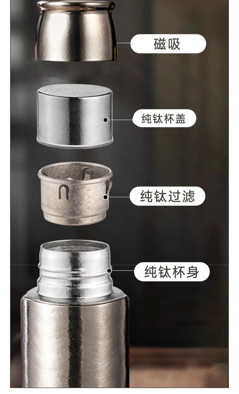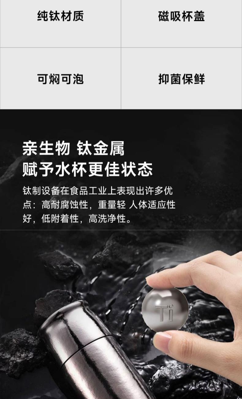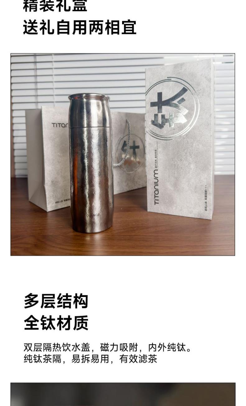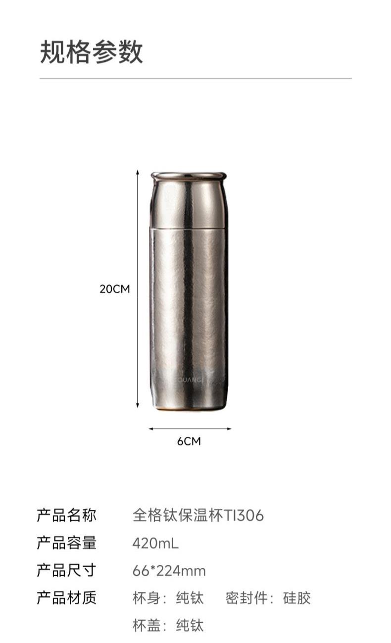 颜色:银色 容量:420mL 材质:内胆、外壳、杯盖、茶漏:钛TA1 , 塑料件:PP;密封件:硅橡胶 配置:纯钛茶滤 工艺:本色结晶 产品尺寸:φ70*26mm 包装:礼盒,260*130*90mm 1、轻奢礼盒装(含手提袋) 2、420ml,纯钛材质,磁吸杯盖,一盖两用