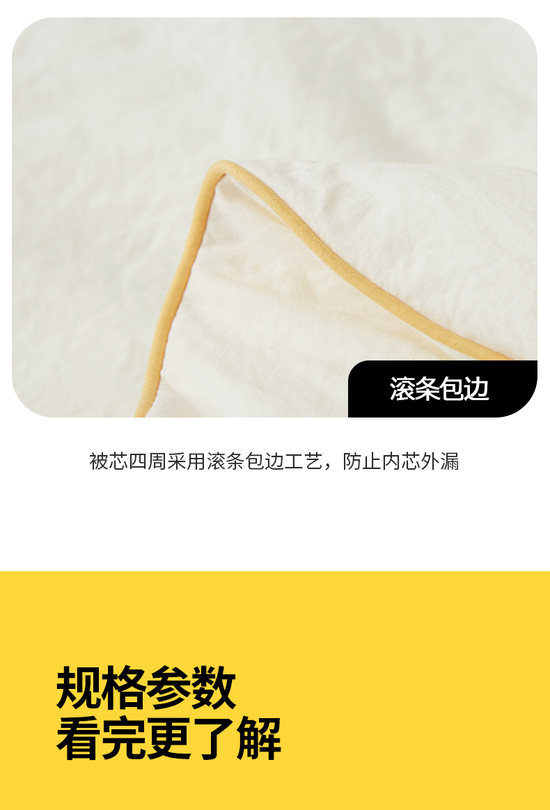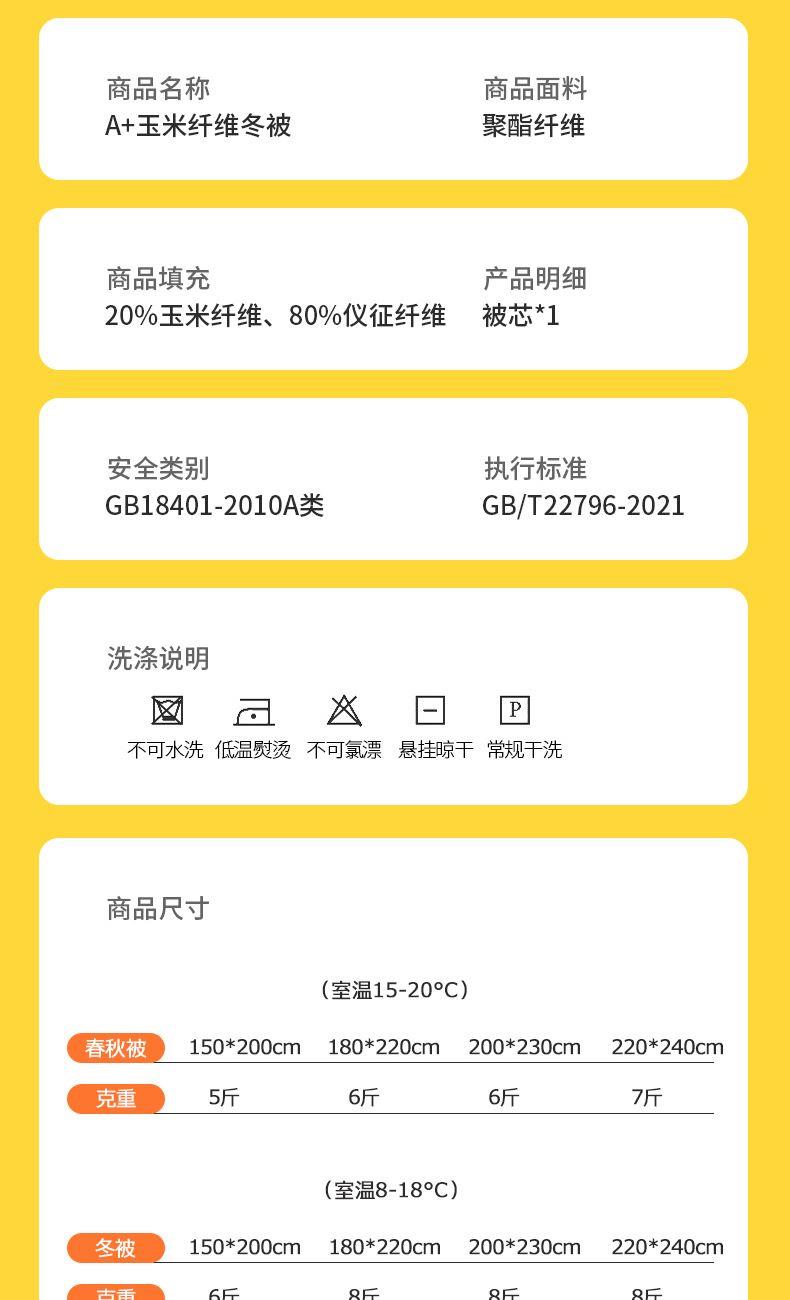 规 格:150*200cm 4斤 花 型:米黄色 面 料: 碳素磨毛面料(聚酯纤维) 填充物:20%玉米纤维80%仪征纤维 工 艺: 定位绗缝 面料采用A类碳素双面磨毛面料,经过水洗定型的!无甲醛,无漂染,无芳香胺染料,保持其原始的状态,达到A类婴儿可用级别,配合纯天然的整张玉米纤维填充。玉米纤维又称聚乳酸纤维,是以玉米淀粉作为原料,经过一系列的生物,手感更像云朵一样柔软,贴身!让你体验前所未有的云朵般轻盈,保暖,好睡眠。