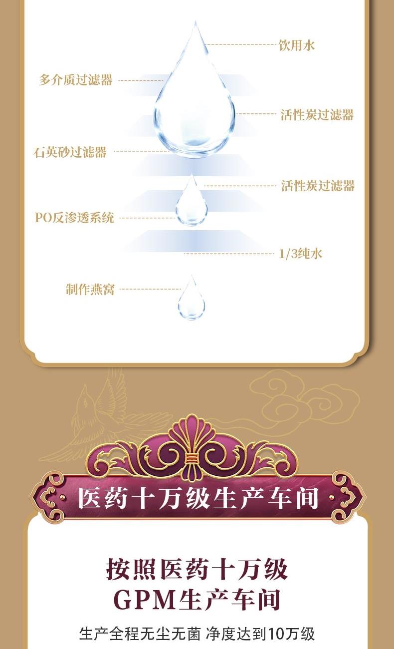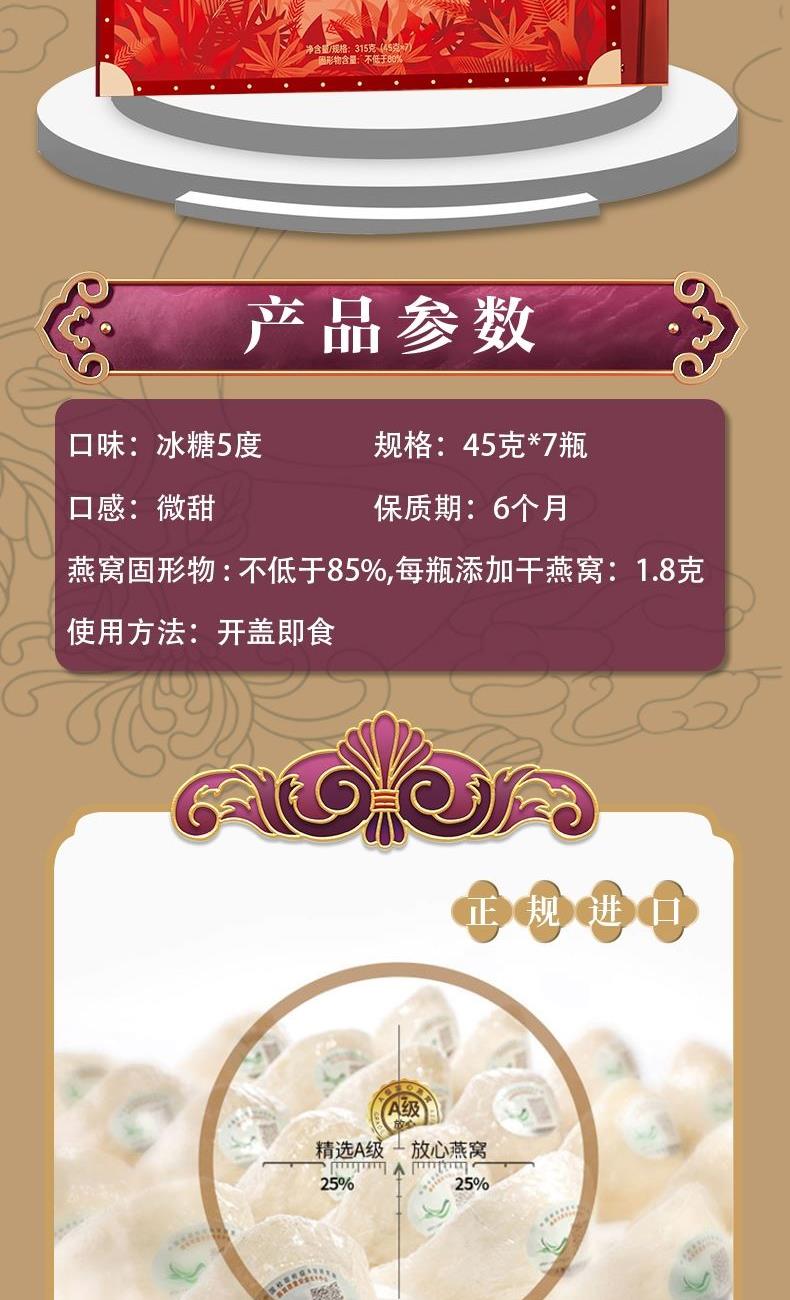 规格:315克(45克*7瓶)、燕窝固形物不低于85%、每瓶添加干燕窝:1.8克 卖点:鲜炖燕窝作为一款便捷、新鲜且保留燕窝本真营养的滋补品,凭借其独特的优势深受消费者喜爱,核心卖点:新鲜现炖,营养锁鲜“鲜” 字当头,拒绝久存:区别于传统干燕窝需自行泡发、炖煮的繁琐,鲜炖燕窝采用 “现订现炖” 或 “短保质期” 模式,以纯净水搭配燕窝隔水鲜炖,不添加防腐剂、增稠剂等成分,保留燕窝的天然营养(如燕窝酸、水溶性蛋白质)和嫩滑口感。