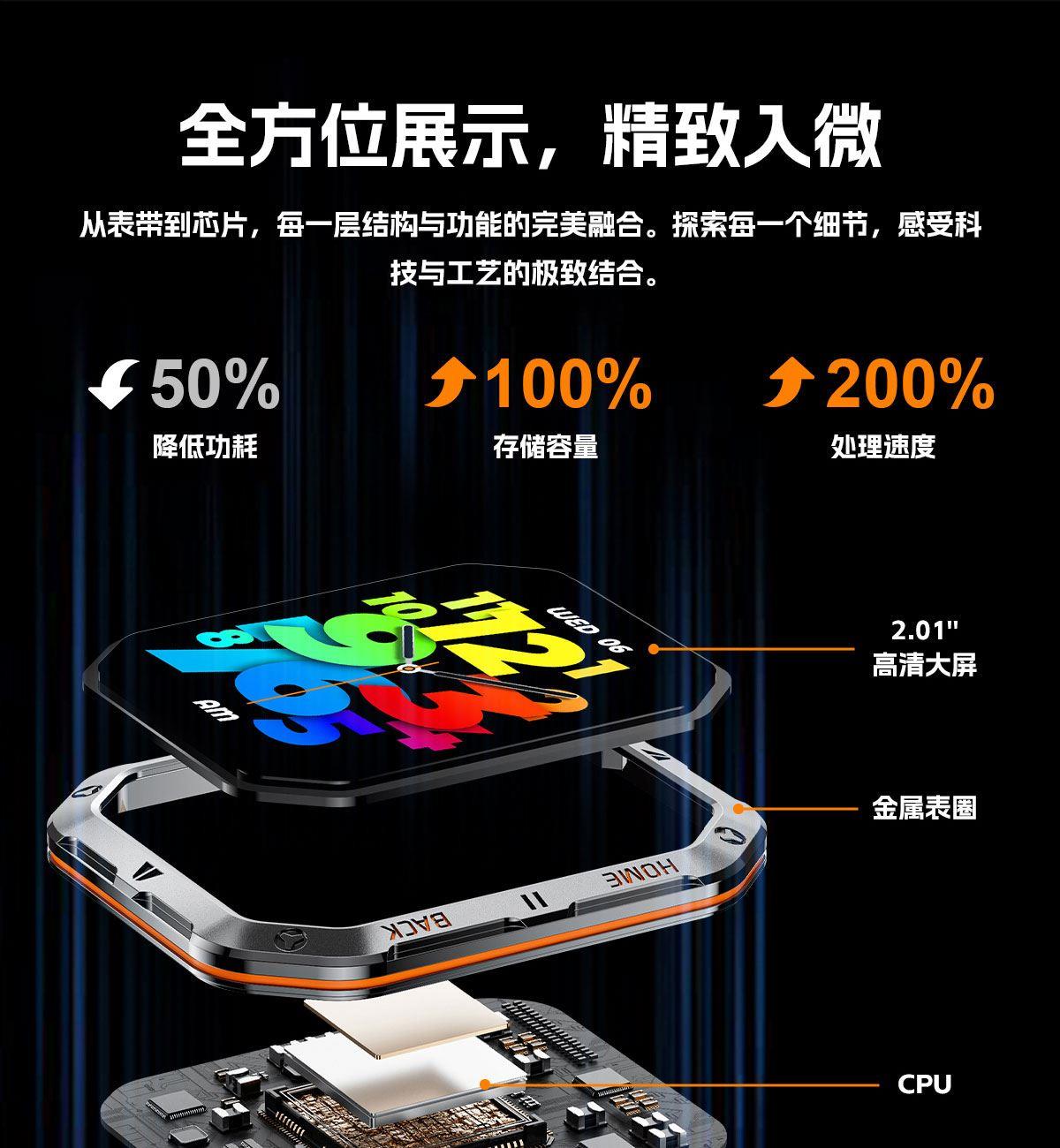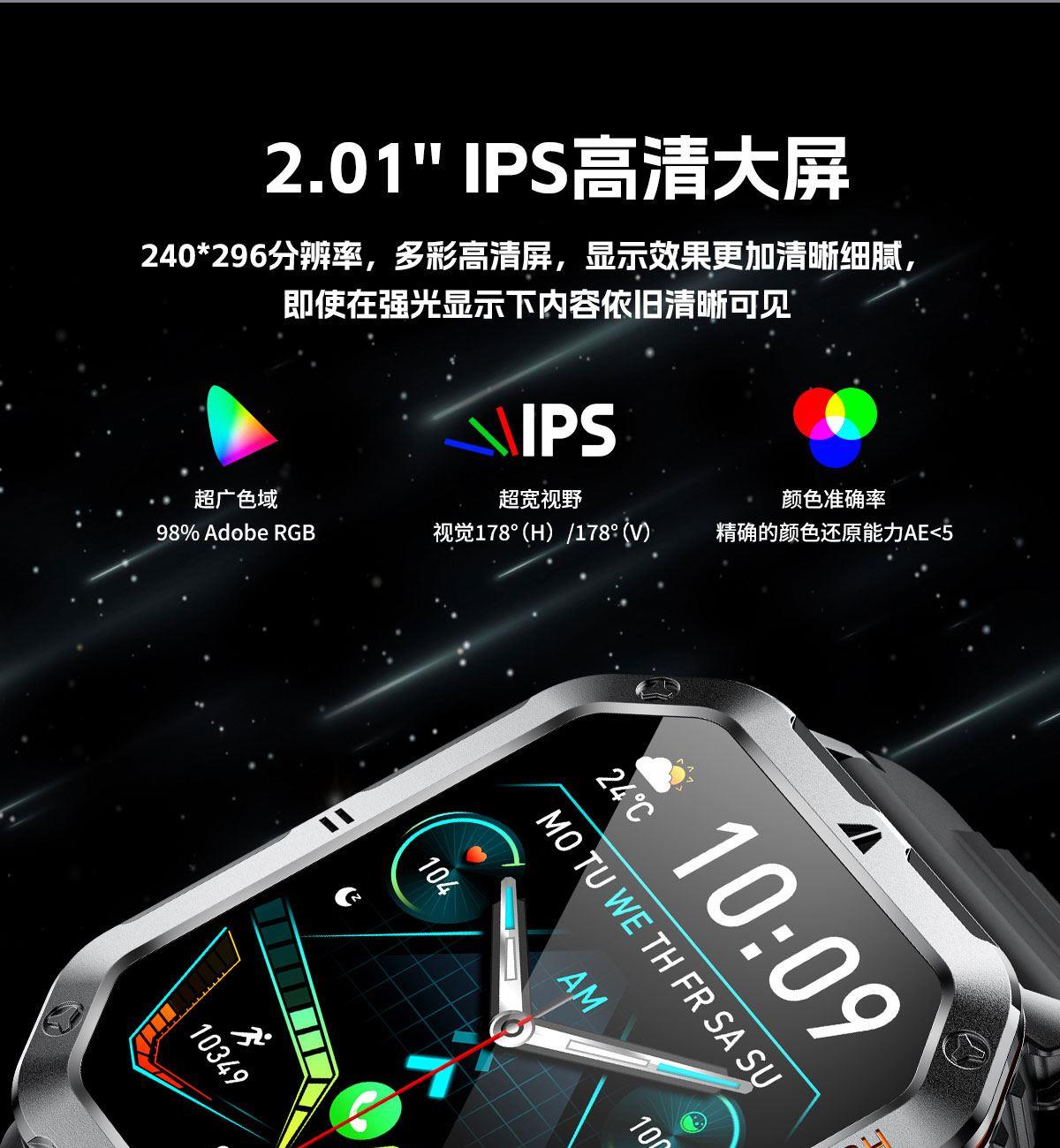 CPU:中科5681 屏幕尺寸:2.01 inch IPS彩屏、240*296 使用时间:3-5天 充电方式:磁吸式 电池容量:1000mAh 智能手表尺寸(mm):49.3*41.8*13mm,表带总长255mm,宽22mm 产品材质:锌合金+ABS防火材料 产品净重:45g 裸机 APP: FitCloudPro 防水等级:IP67 产品清单:手表+充电线+说明书+包装盒 2.01 inch IPS彩屏、240*296、表盘市场、扫码连接、多套UI菜单、语音通话、OTA升级、计步、卡路里、运动模式、抬手亮屏、睡眠监测、来电提醒、消息提醒、久坐提醒、闹钟提醒、秒表、表盘切换、3D动态表盘、音乐播放、呼吸训练、整点测量、心率、血压、血氧、计算器、自定义表盘、亮度调节、天气、独立闹钟、运动轨迹、游戏等新功能