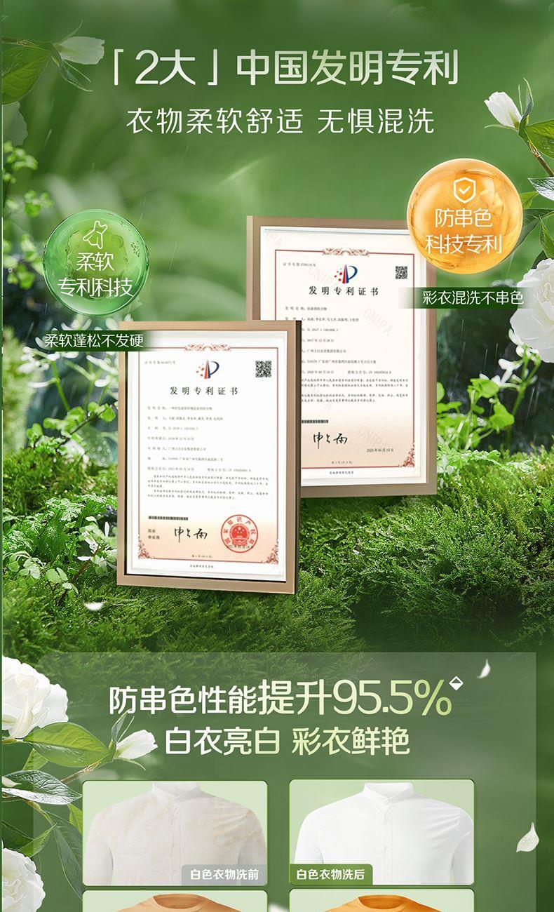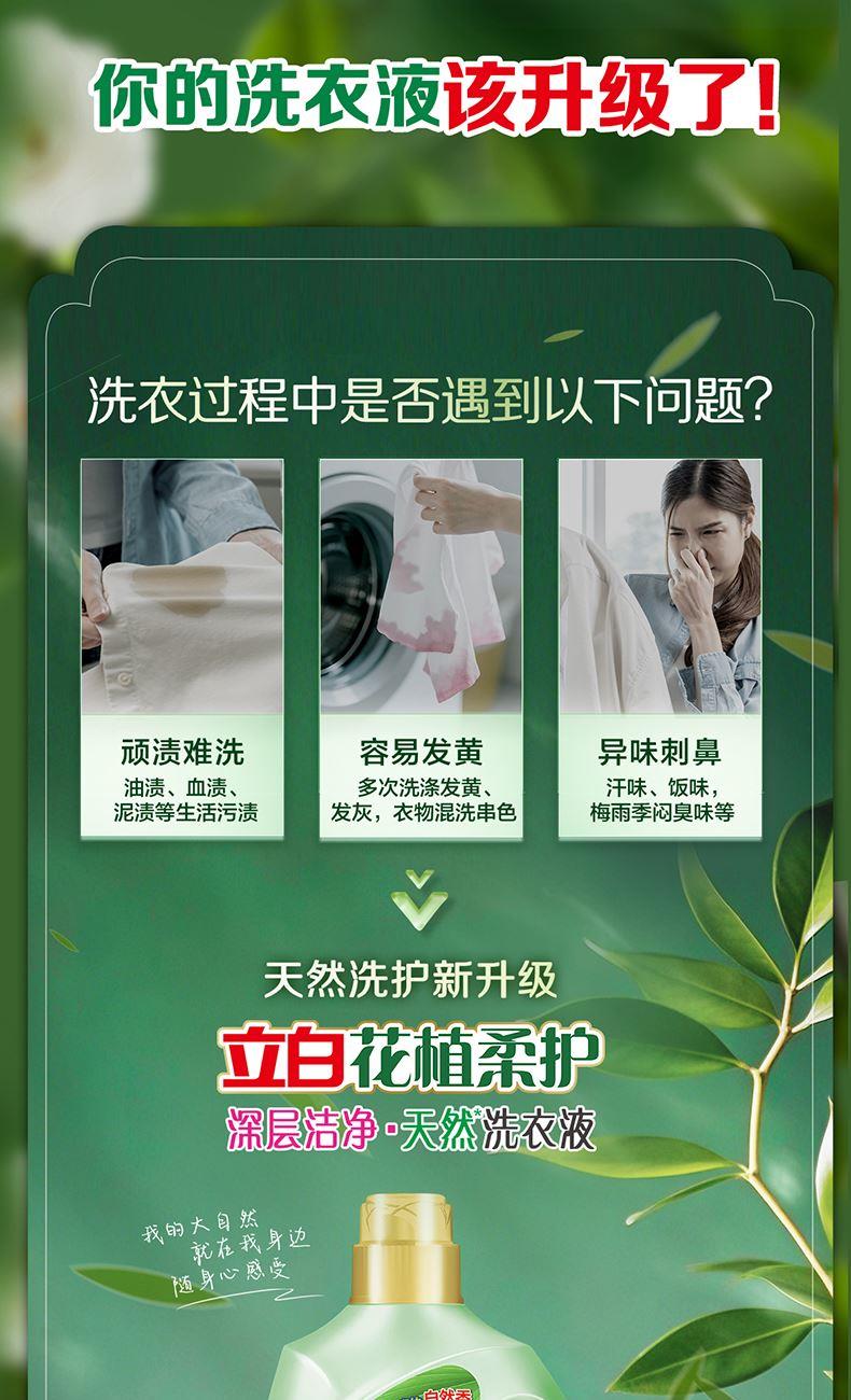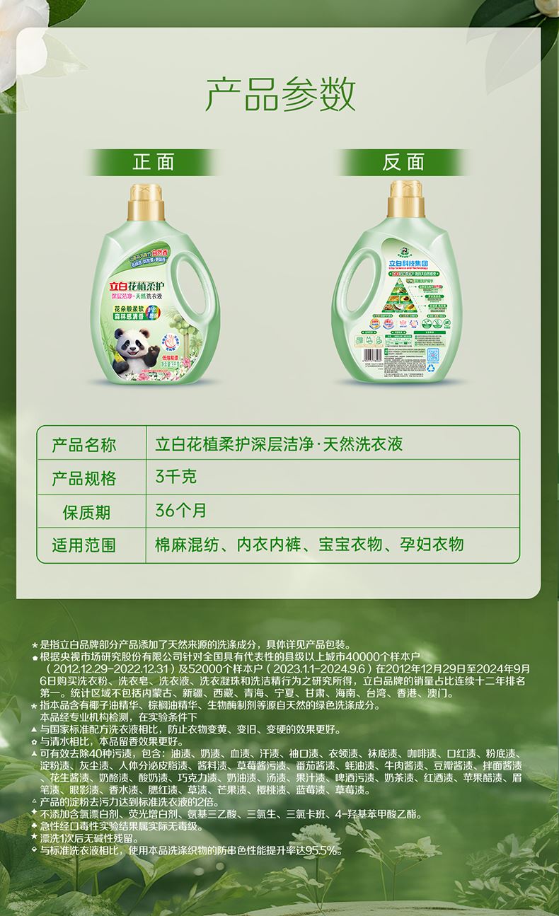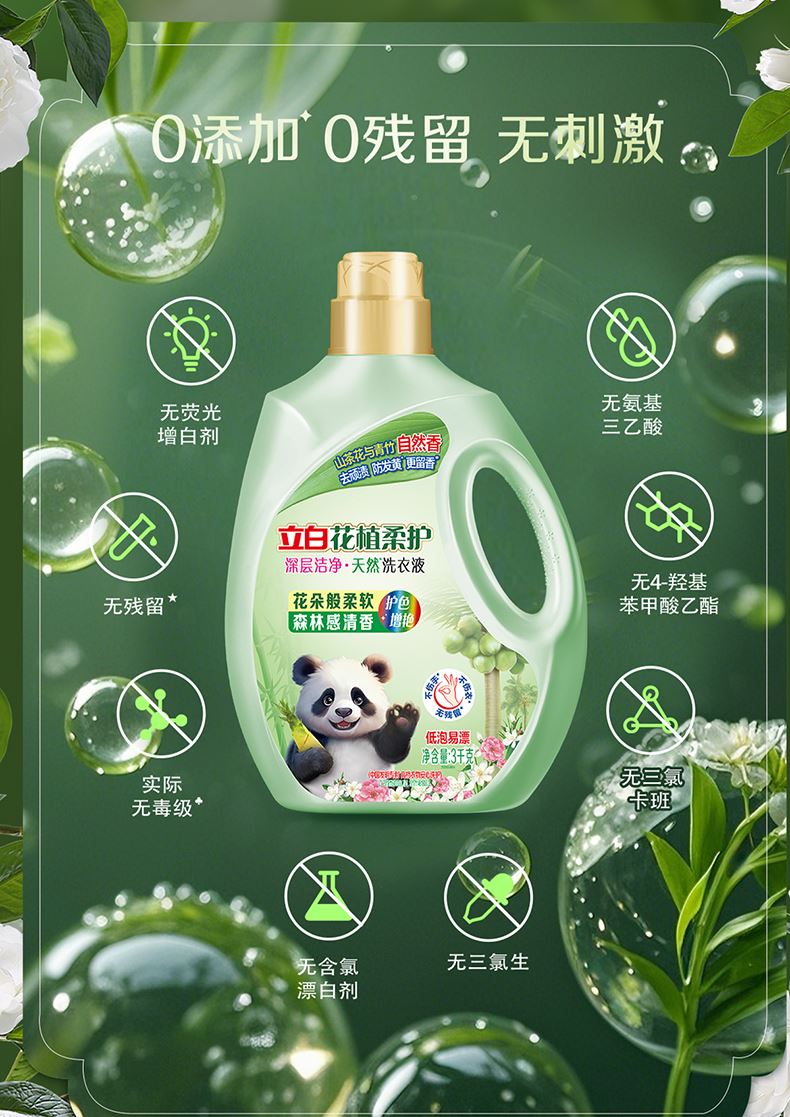 保质期限:3年 主要成分:表面活性剂、防串色剂、抗再沉积剂、着色剂、香精、防腐剂、柔软因子、天然来源成分(天然椰子油精华、棕榈油精华、天然酵素、烷基糖苷APG、山茶花精粹、牛油果提取物、柠檬香茅提取物) 产品功效:洁净更柔软 防发黄变 适用范围:棉麻混纺、内衣内裤、宝宝衣物、孕妇衣物