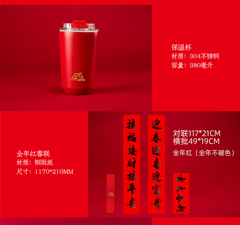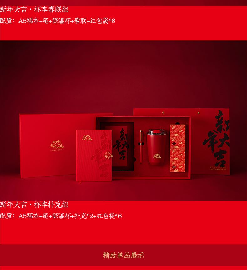 配置:A5福本+笔+保温杯+春联+红包袋*6 材质:五金+特级白芯+PU+不锈钢 尺寸:福本145*215mm 笔12.5*138mm 保温杯380ml 红包袋95*175mm 春联210*1180mm 包装:礼盒(400*268*95mm)+手提袋