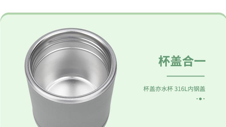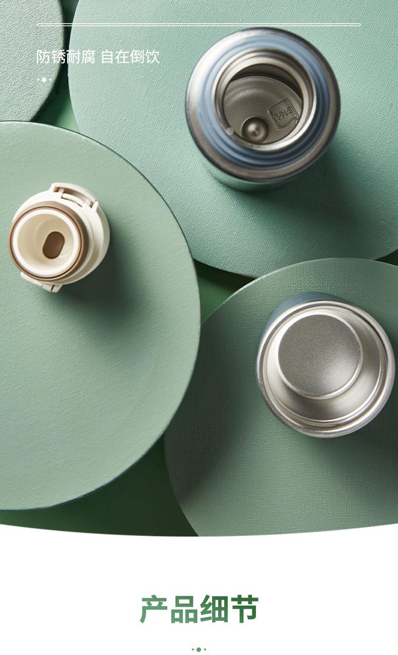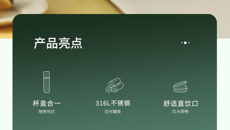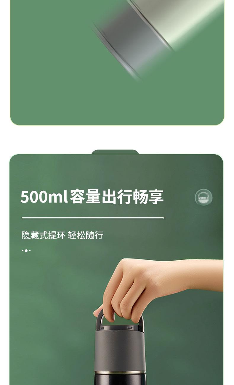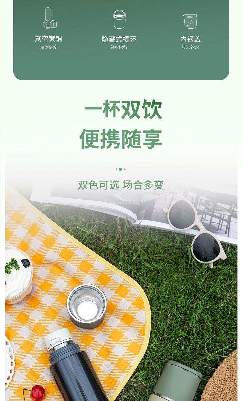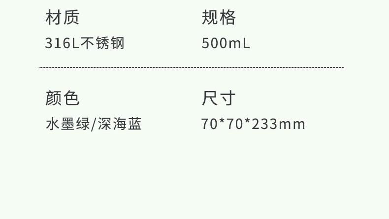 容量 500ml 材质 316L不锈钢、硅橡胶 规格参数 代发在库颜色:深海蓝/水墨绿 商品毛重(kg):0.529 功能卖点 1、316L不锈钢内胆及内盖,饮用健康; 2、一杯双饮,杯盖合一,随享热饮; 3、舒适直饮口,饮水顺畅; 4、真空镀铜,保温保冷; 5、隐藏式提环,轻松随行; 6、内钢盖,安心饮水。