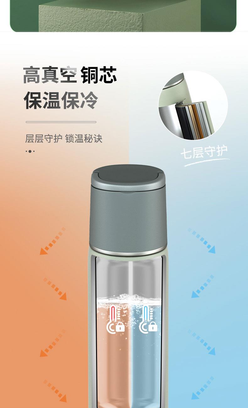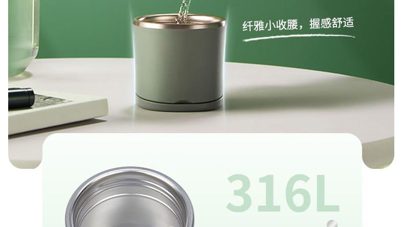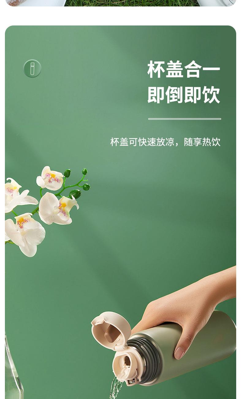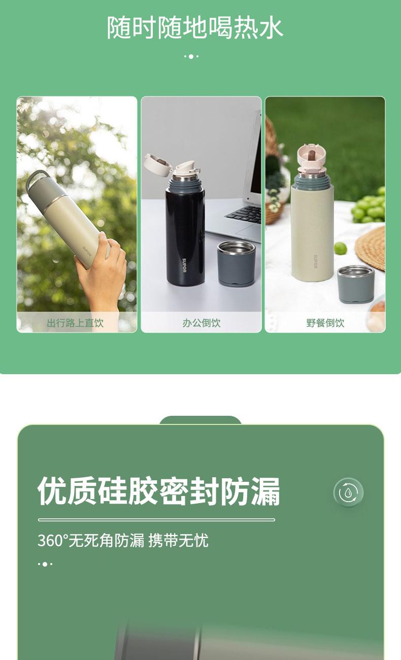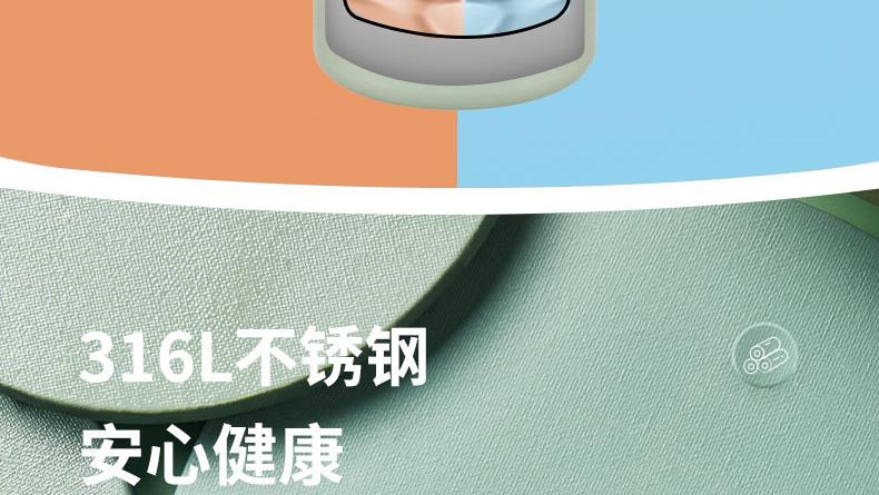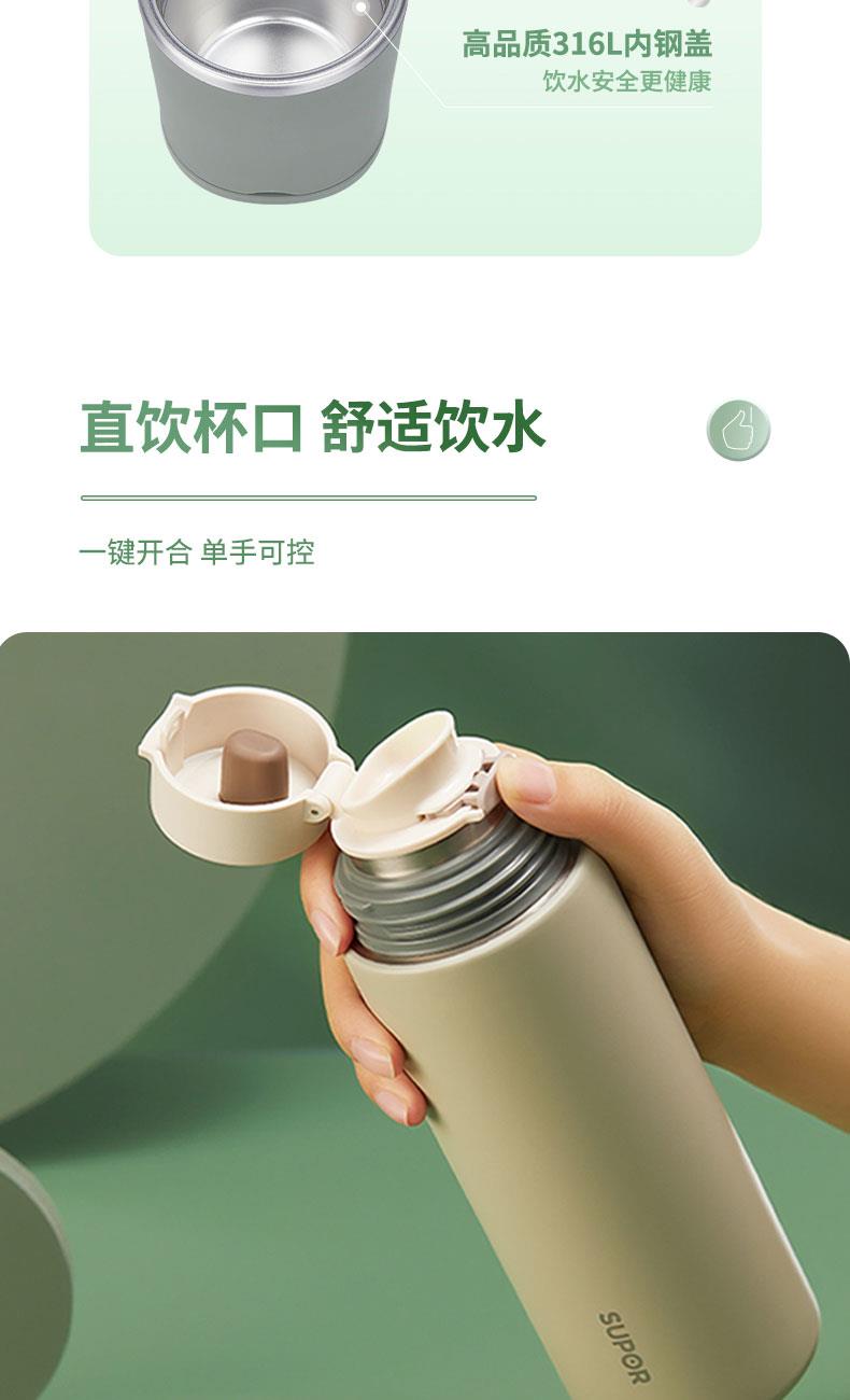 容量 500ml 材质 316L不锈钢、硅橡胶 规格参数 代发在库颜色:深海蓝/水墨绿 商品毛重(kg):0.529 功能卖点 1、316L不锈钢内胆及内盖,饮用健康; 2、一杯双饮,杯盖合一,随享热饮; 3、舒适直饮口,饮水顺畅; 4、真空镀铜,保温保冷; 5、隐藏式提环,轻松随行; 6、内钢盖,安心饮水。
