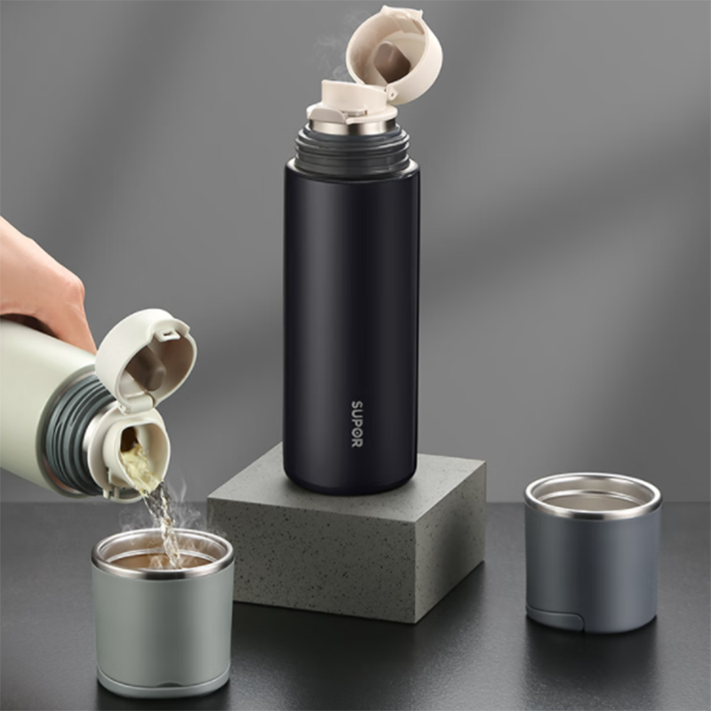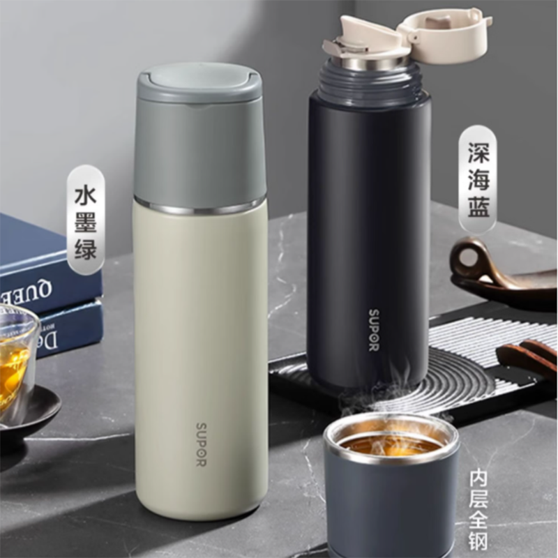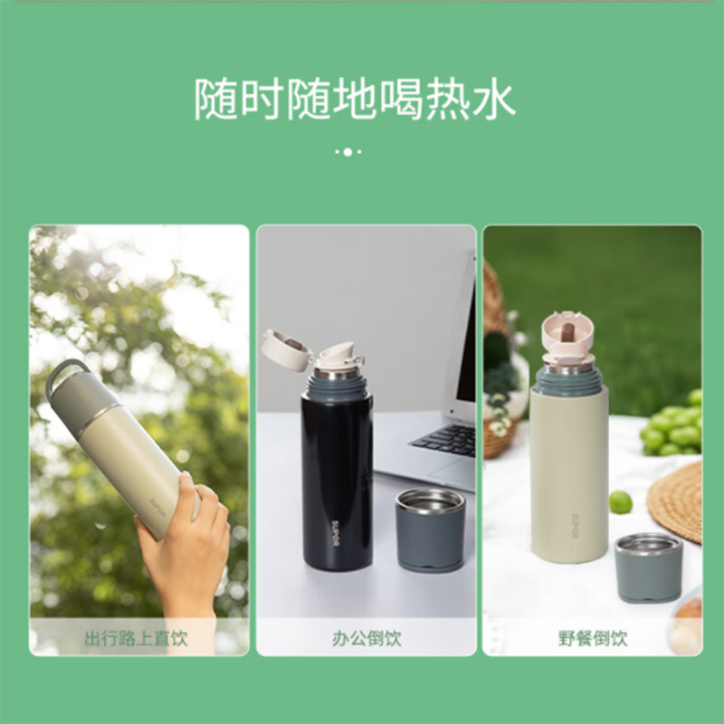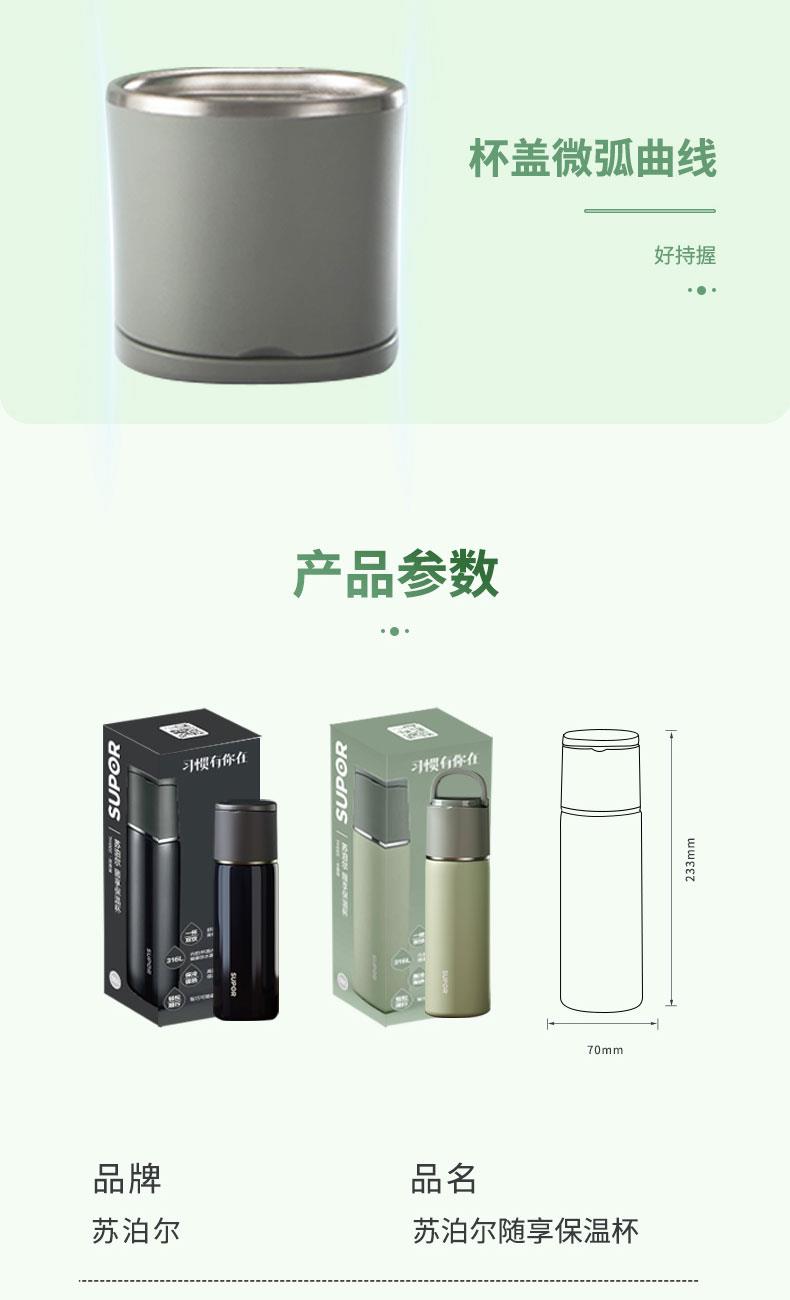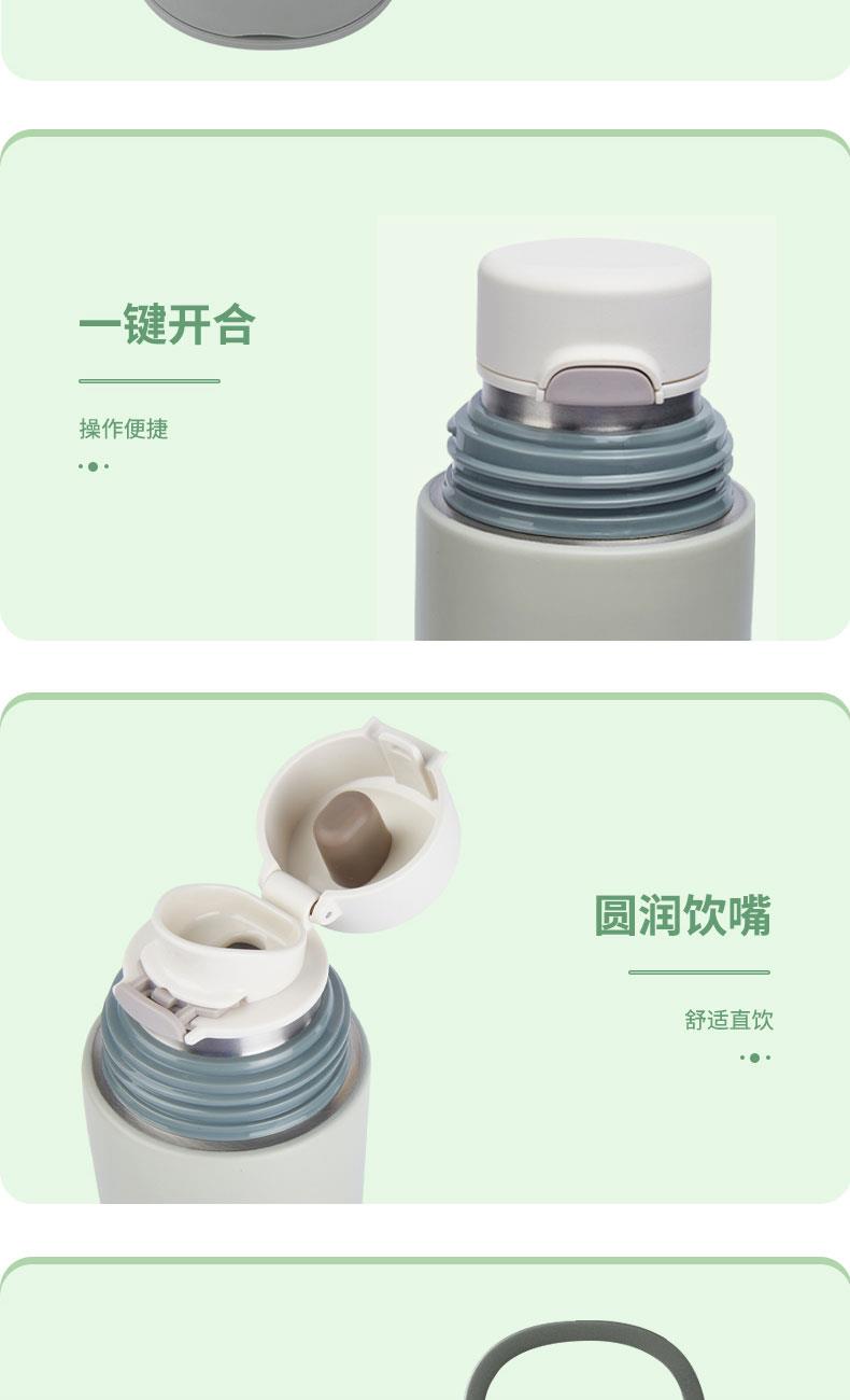 容量 500ml 材质 316L不锈钢、硅橡胶 规格参数 代发在库颜色:深海蓝/水墨绿 商品毛重(kg):0.529 功能卖点 1、316L不锈钢内胆及内盖,饮用健康; 2、一杯双饮,杯盖合一,随享热饮; 3、舒适直饮口,饮水顺畅; 4、真空镀铜,保温保冷; 5、隐藏式提环,轻松随行; 6、内钢盖,安心饮水。