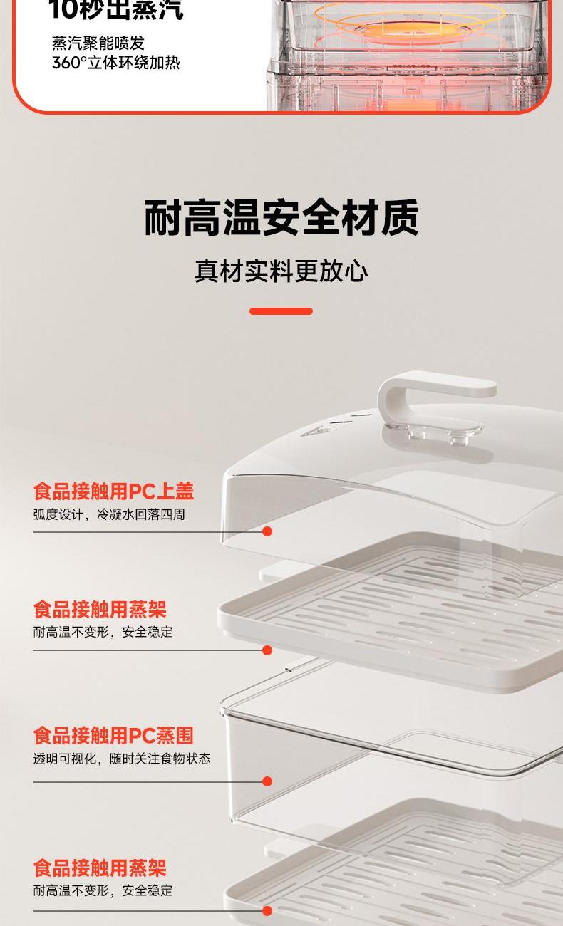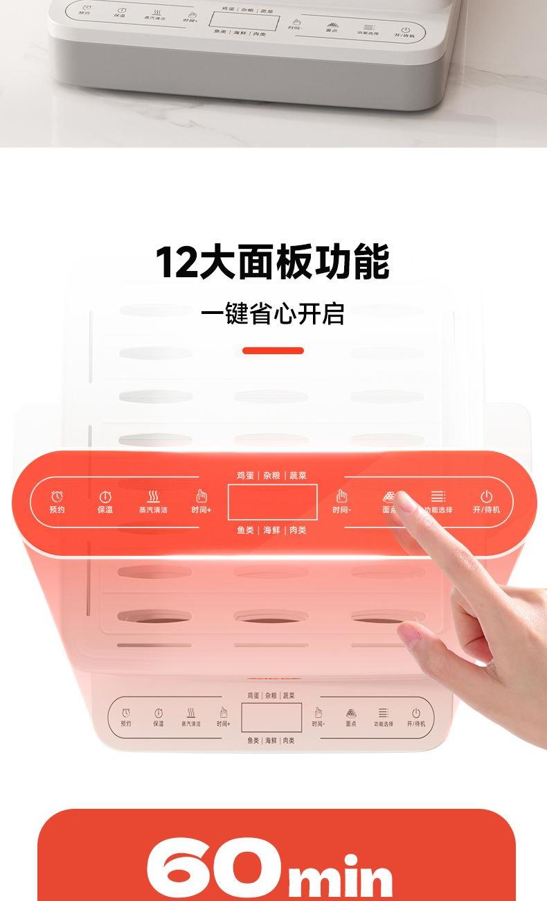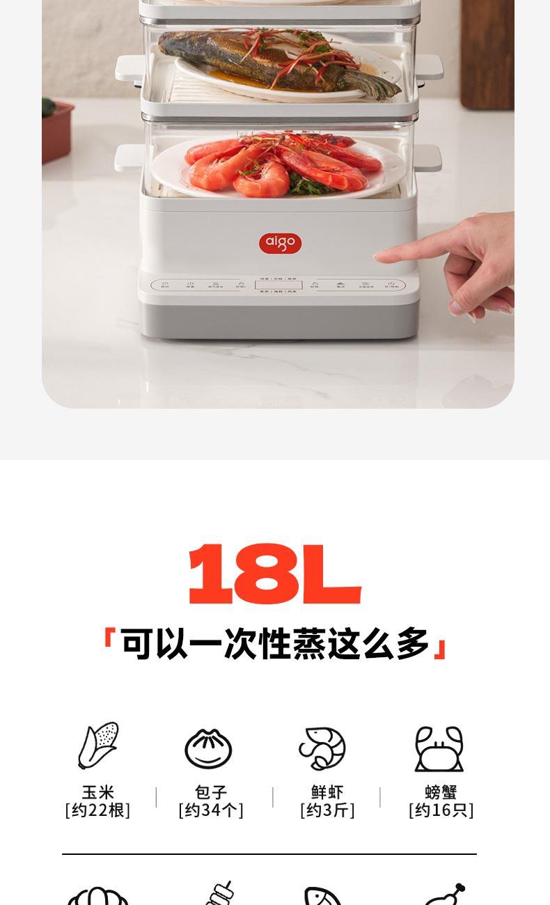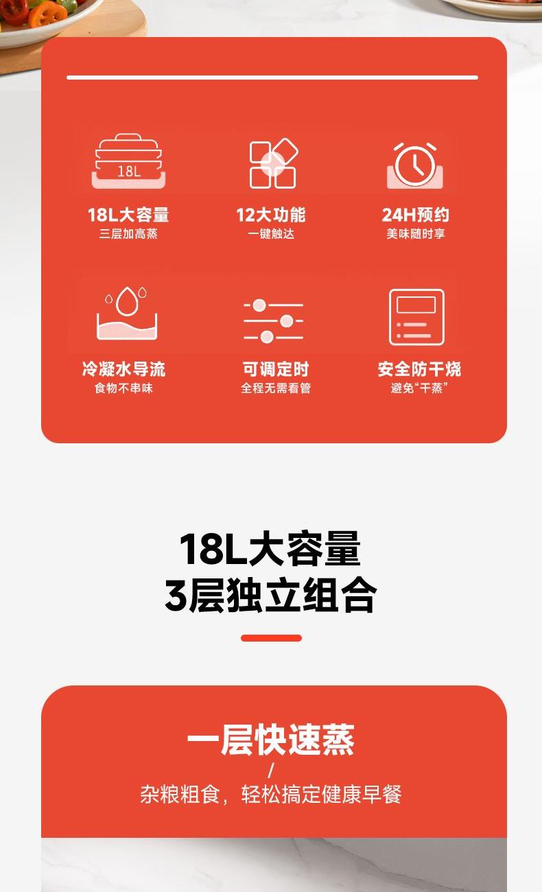 18L大容量,满足全家蒸煮需要 三层空间自由分配,满足更多烹饪需求 800W大功率立体蒸汽环流,均匀加热加热食材,呵护您的用餐安全 多种面板功能选择,预约、保温、定时、消毒样样精通 蒸汽除 菌功能,可对餐具高温消毒,让您吃得更安心、更放心 分体式设计,让清洁更简单 额定电压:220V 额定功率:800W 容量:18L 产品净含量:2.48kg 产品尺寸:306mm*308mm*410mm