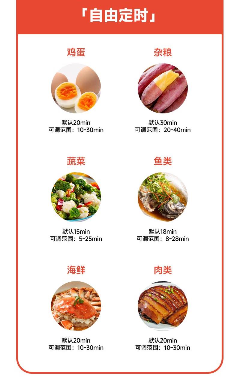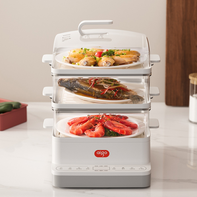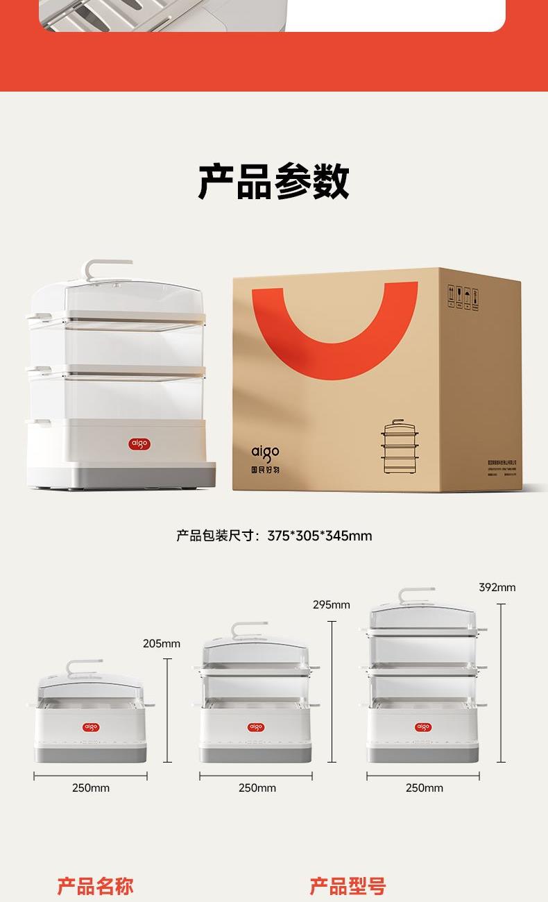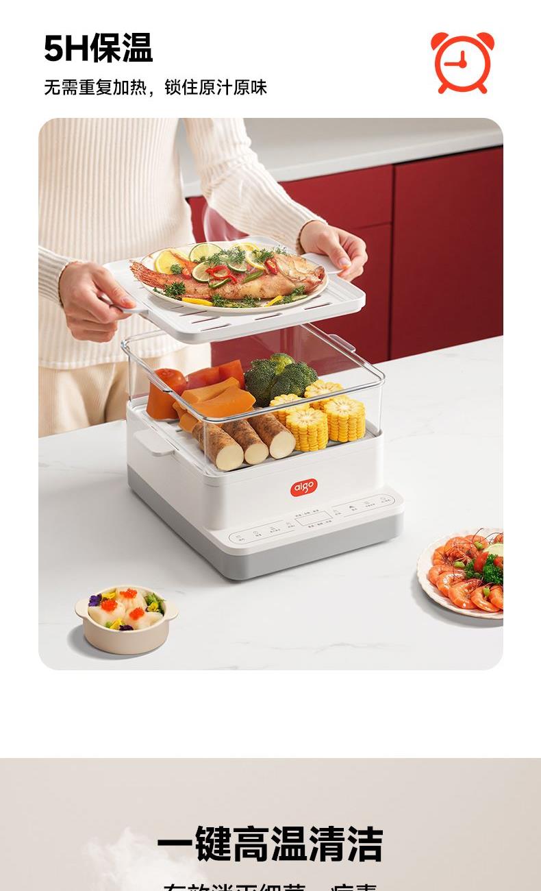 18L大容量,满足全家蒸煮需要 三层空间自由分配,满足更多烹饪需求 800W大功率立体蒸汽环流,均匀加热加热食材,呵护您的用餐安全 多种面板功能选择,预约、保温、定时、消毒样样精通 蒸汽除 菌功能,可对餐具高温消毒,让您吃得更安心、更放心 分体式设计,让清洁更简单 额定电压:220V 额定功率:800W 容量:18L 产品净含量:2.48kg 产品尺寸:306mm*308mm*410mm