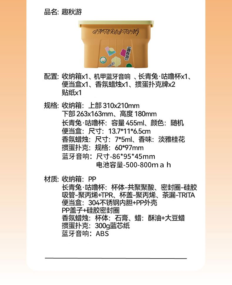 礼盒配置:收纳箱x、机甲蓝牙音响x1、便当盒x1、 咕噜杯(三色随机)x1、 香氛蜡烛x1、 掼蛋扑克牌x2、掼蛋技巧纸x1、贴纸x1 产品规格:收纳箱-上部-310x210mm 下部-263x163mm 高度-180mm 咕噜杯-165mmx90mmx90mm() 机甲蓝牙音响-86x95x45mm 便当盒-137*11*65mm 香氛蜡烛-7*5ml 掼蛋扑克-60*97mm