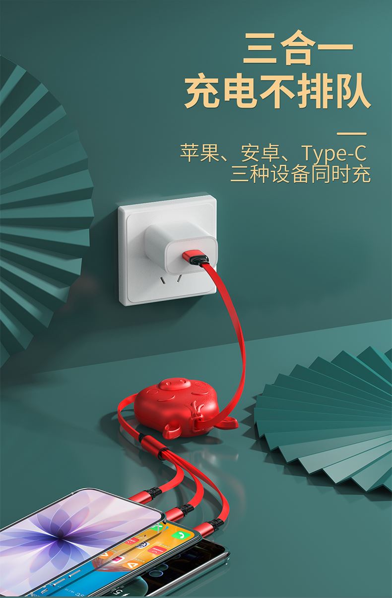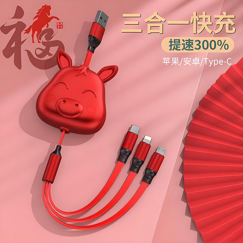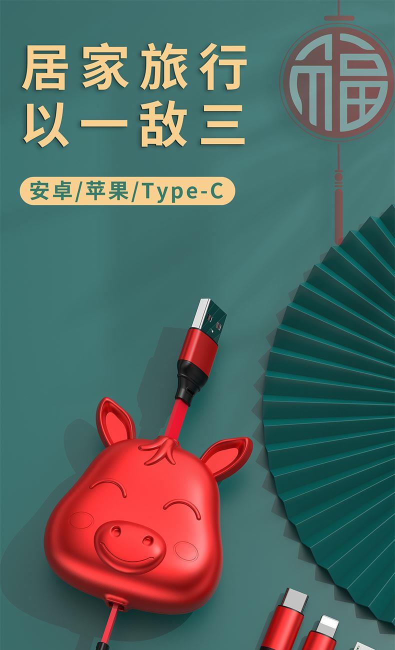 66W超级快充,充电更快 马年元素造型,一体成型充电头 三种接口满足各种手机 1.2米长度设计,使用方便 编织线耐磨耐用,不易折断