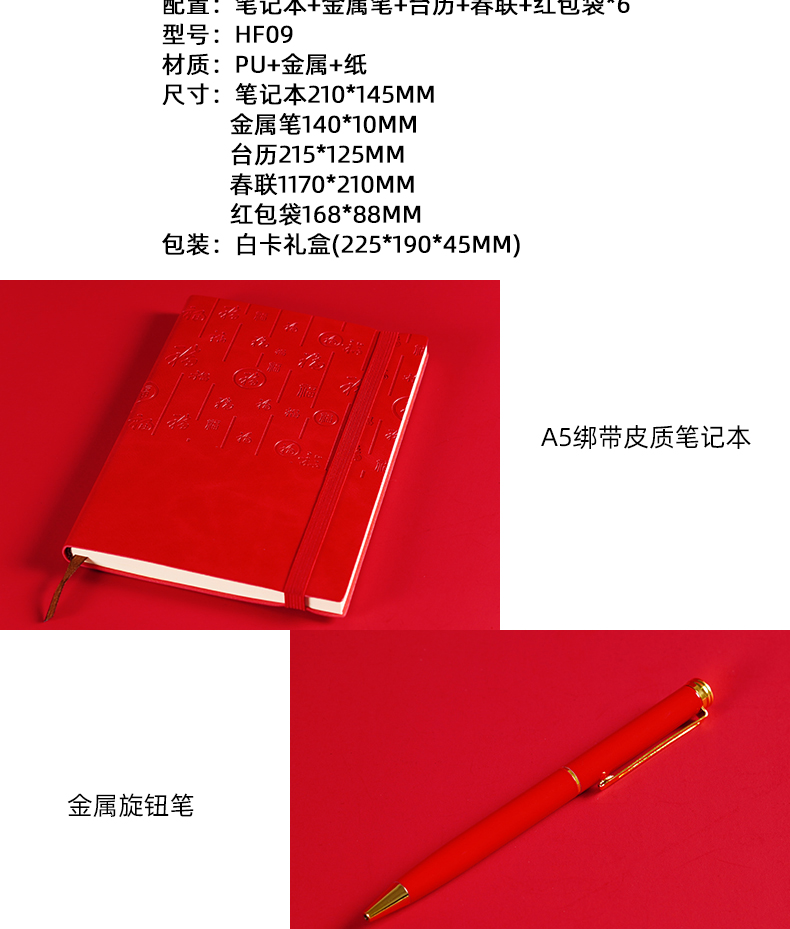 配置:笔记本+金属笔+台历+春联+红包袋*6 型号:NF09 材质:PU+金属+纸 尺寸:笔记本210*145mm 金属笔140*10mm 台历215*125mm 春联1170*210mm 红包袋168*88mm 包装:白卡礼盒(225*190*45mm)
