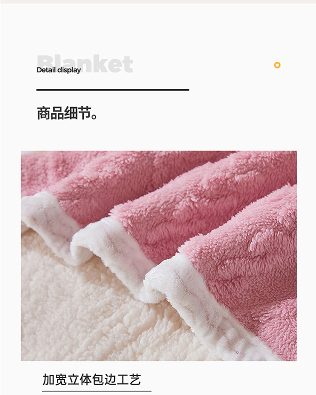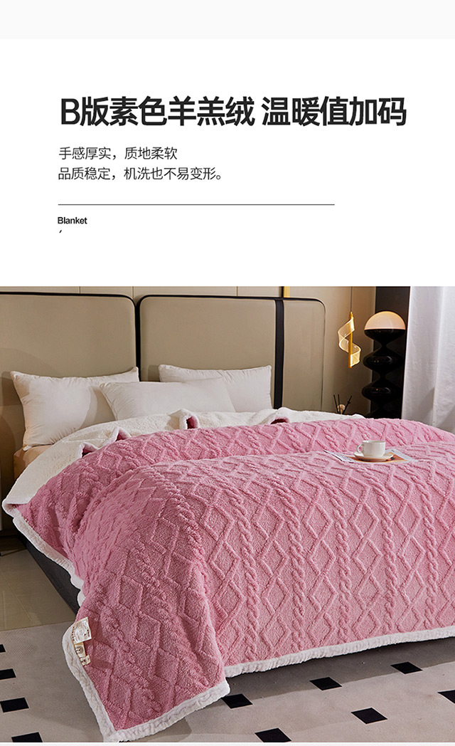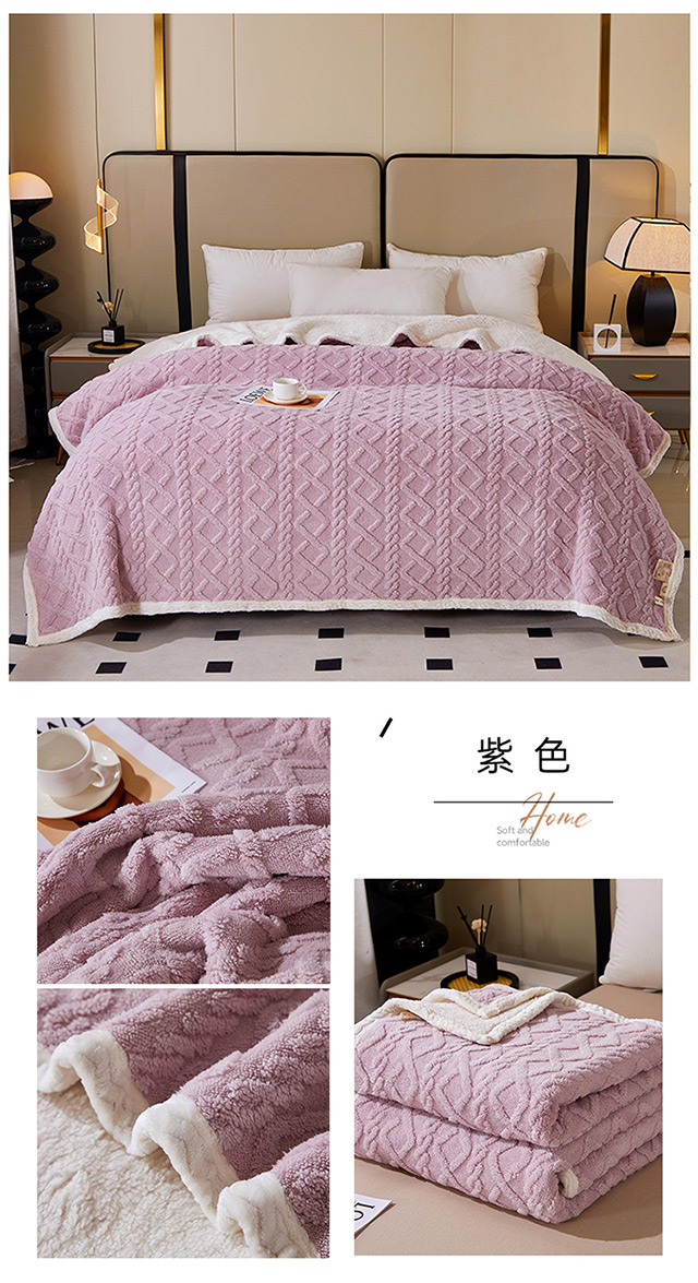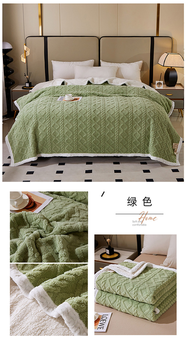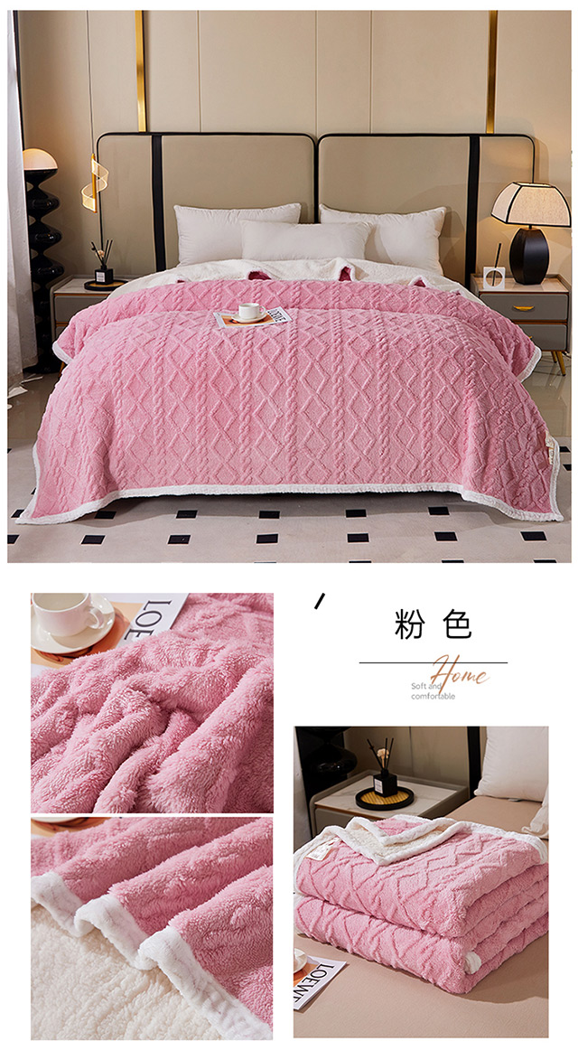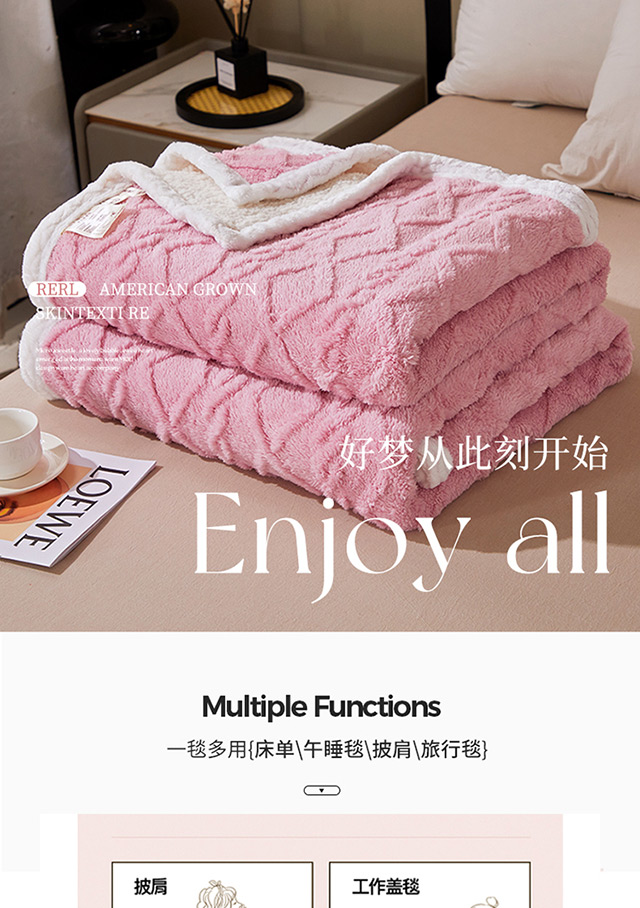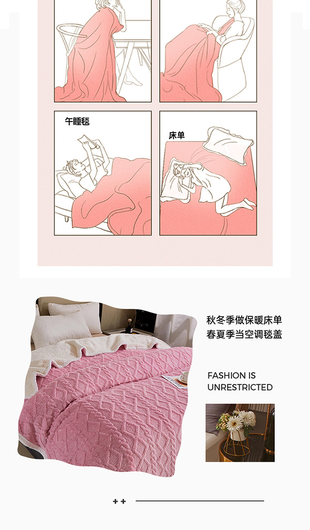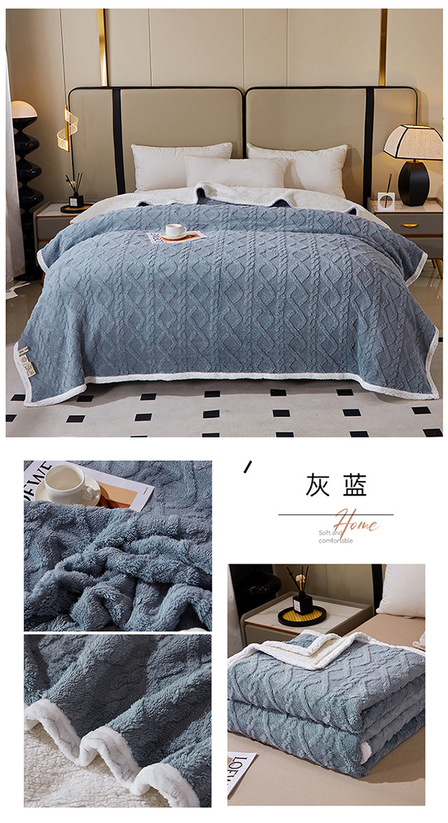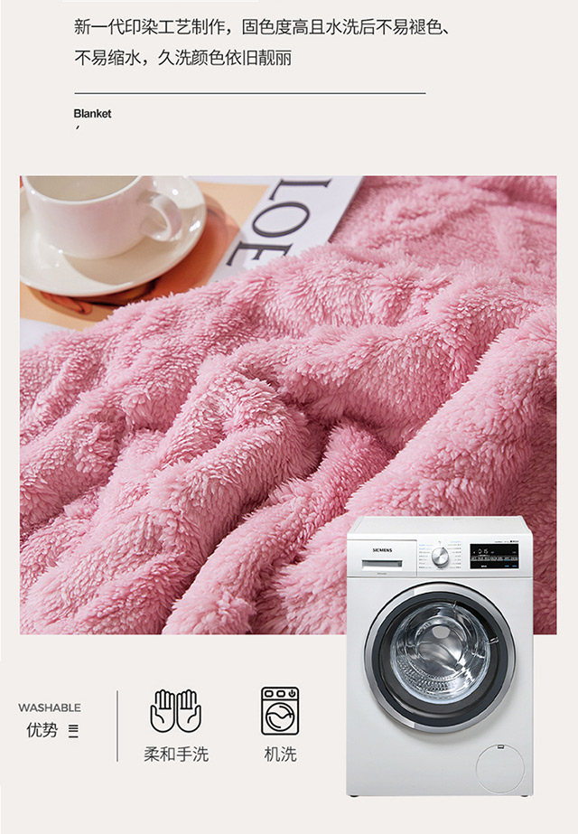 一款多用:午睡毯、车用毯、沙发毯、披肩、床用被单等等,时刻感知你的温度,给你加倍温暖。面料中植入导电丝,告别静电烦恼。面料采用活性印染技术,安全不褪色,有颜值更舒适. 面料:A版:塔芙绒 B版:羊羔绒 规格:200*230cm