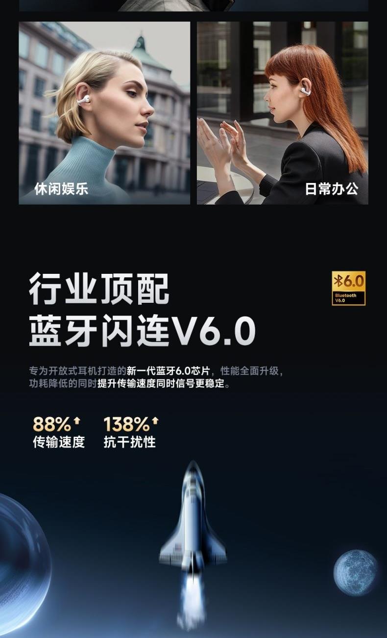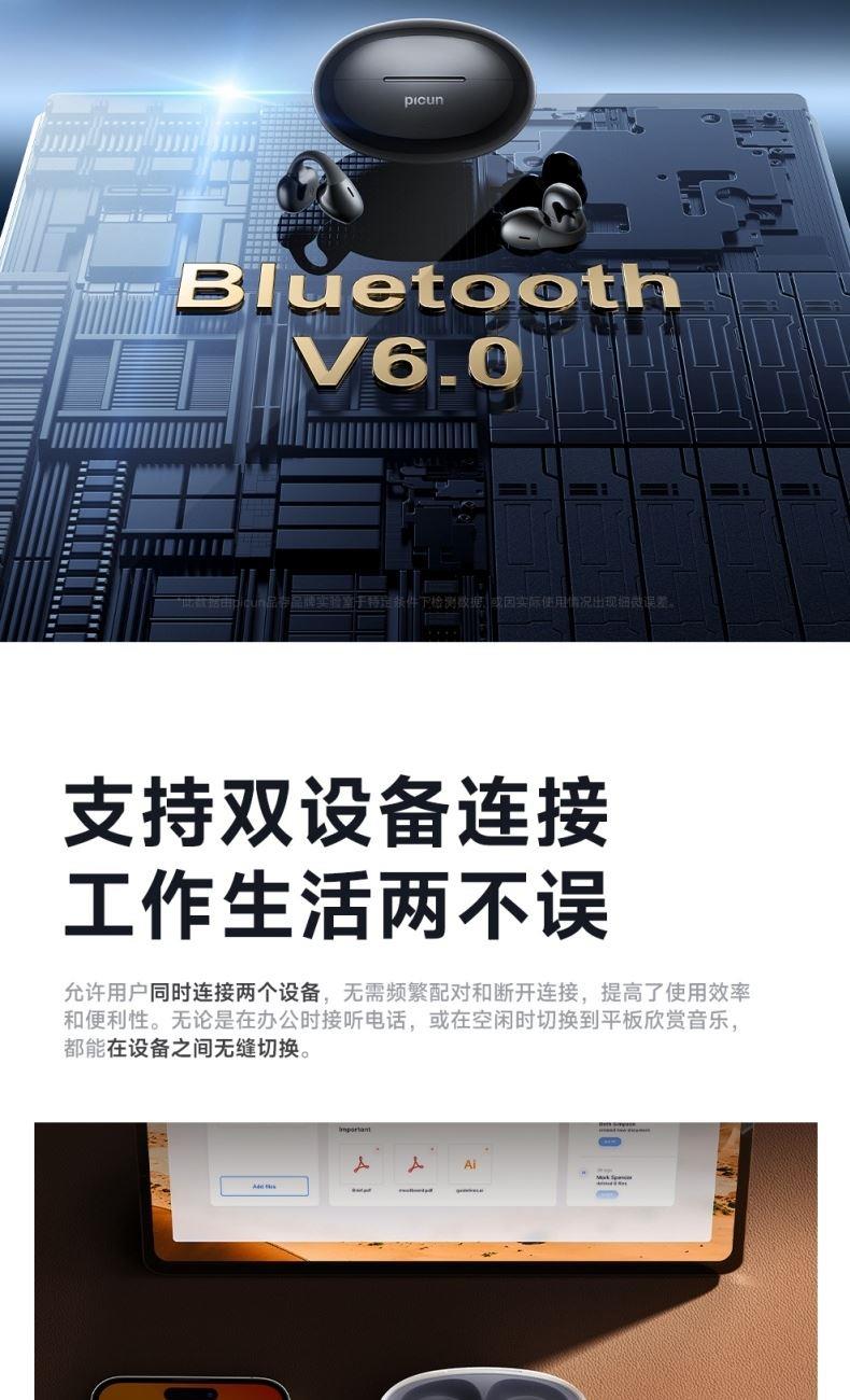 蓝牙方案:AB5716D 蓝牙版本:6.0 电池容量y:50mah/400mAh 使用时间(80%音量):≈7h 蓝牙协议:A2DP/AVRCP/HSP/HFP 接收距离:10m 喇叭尺寸:12 mm 频响范围:20HZ-20kHZ 喇叭灵敏度:123±3dB 喇叭阻抗:22±15%Ω 麦克风灵敏度:—42dB±1dB 1、支持【picun品存】APP智能互联控制 2、新一代蓝牙6.0版本 3、360°立体环绕声 4、开放式设计, 久戴不痛 5、智能一拖二连接