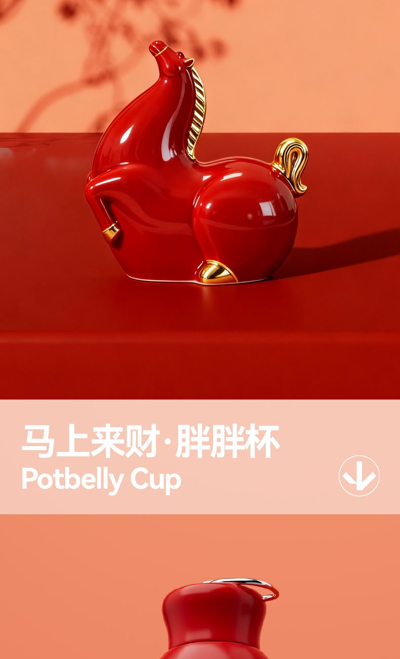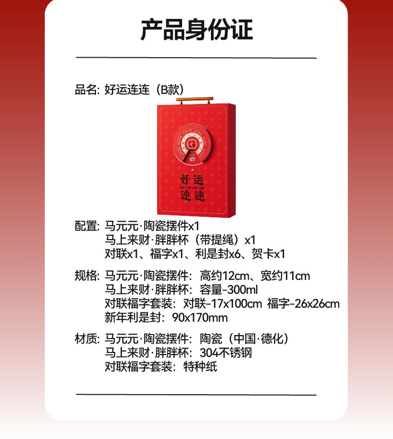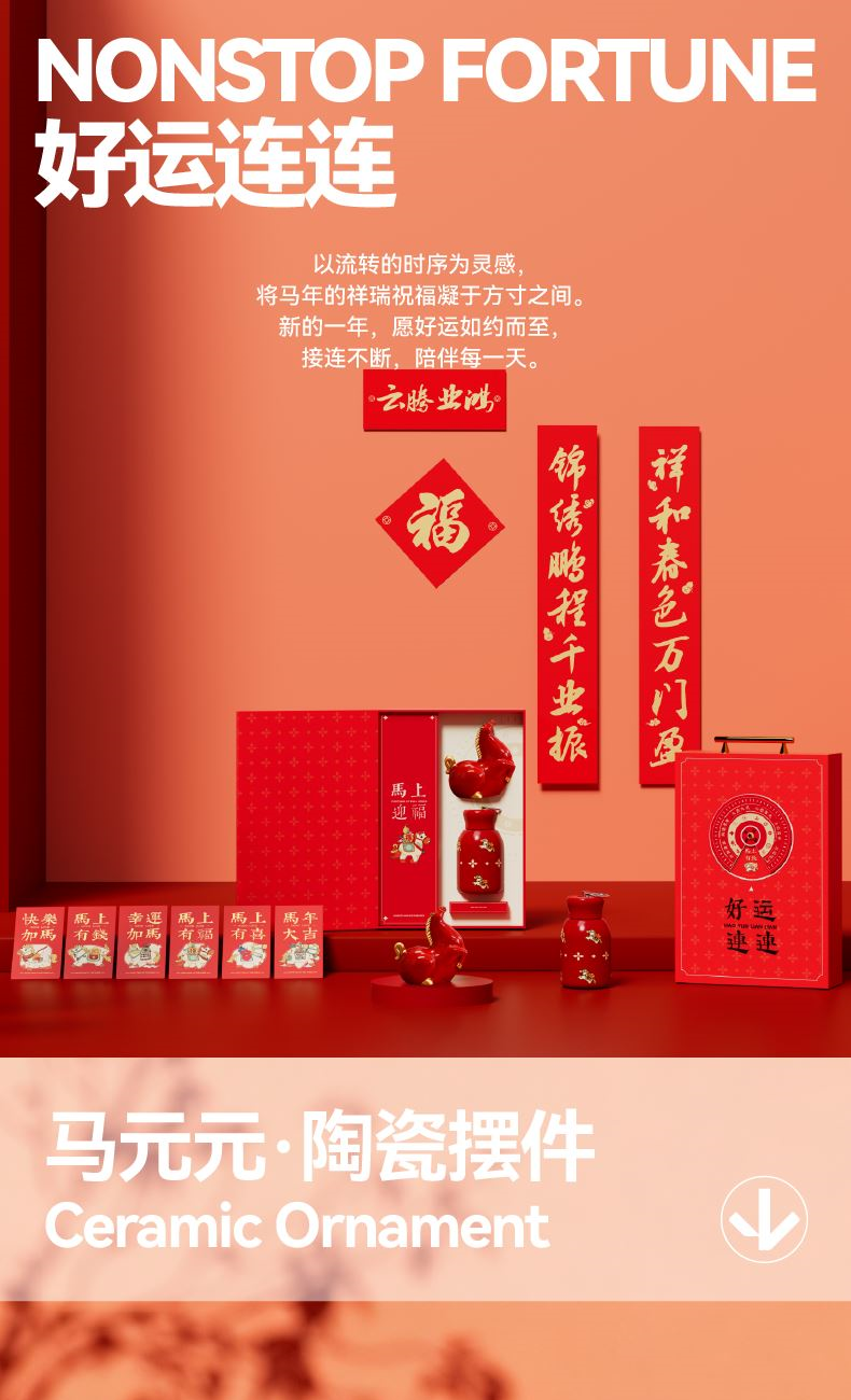 以流转的时序为灵感,将马年的祥瑞祝福凝于方寸之间。新的一年,愿好运如约而至,接连不断,陪伴每一天。 礼盒表面巧妙融入可转动圆盘,暗合“时来运转”的巧思,每转动一次,就切换一幅精心绘制的插画,对应一句马年祝福。插画风格现代活泼,色彩温暖,让传统生肖礼盒变得更生动有趣。打开礼盒的过程,也成为传递心意的一种方式,在互动中增添惊喜与祝福。 内搭马年摆件——马元元,元,取自“元宝”,象征着财富与富足,寓意新年财源滚滚。“元” 也代表开始和新生,如“元旦”,饱含着对新年新起点的美好祝愿,一元复始,万象更新,马元元伴您开启一整年的好运与精彩。 礼盒配置 精装提盒 x1、 马元元·陶瓷摆件x1、马上来财·胖胖杯(带提绳)x1 对联x1、福字x1、利是封x6、贺卡x1