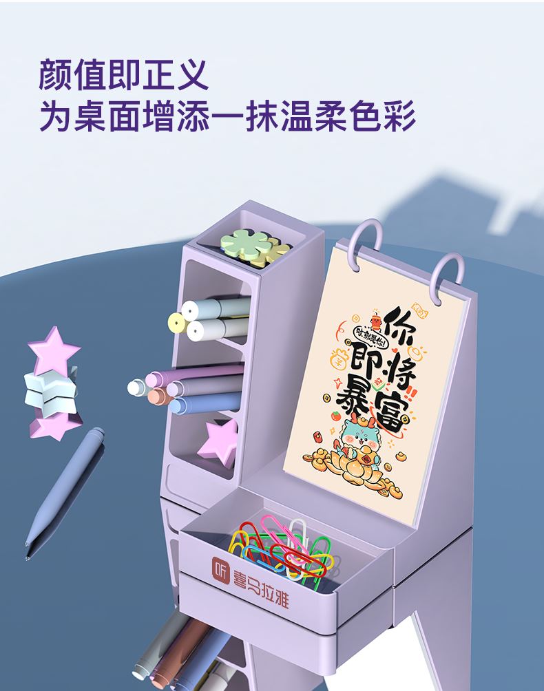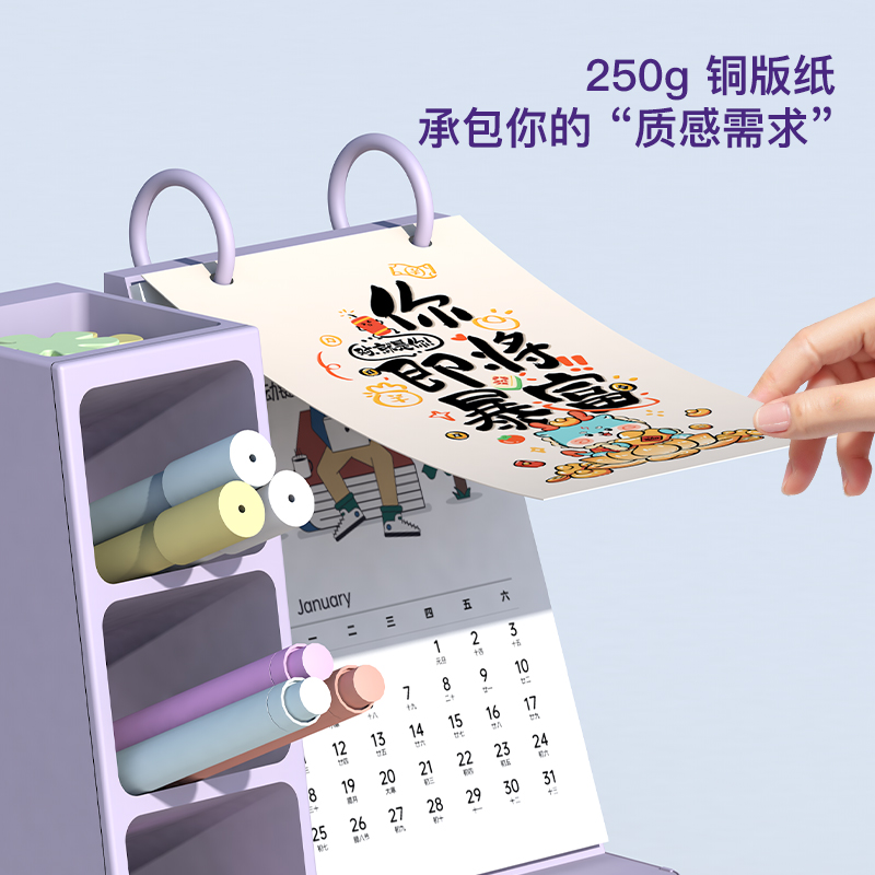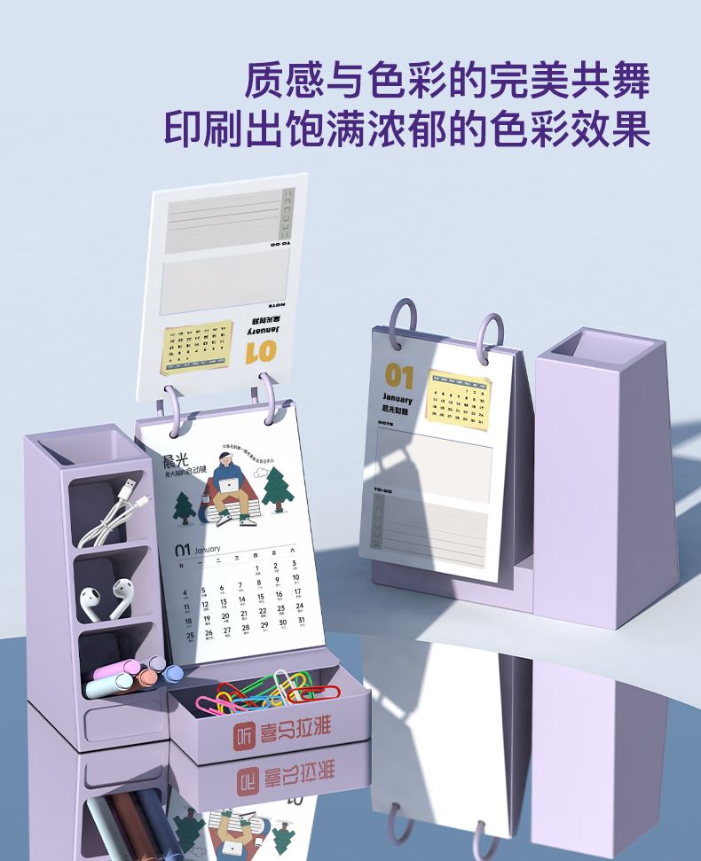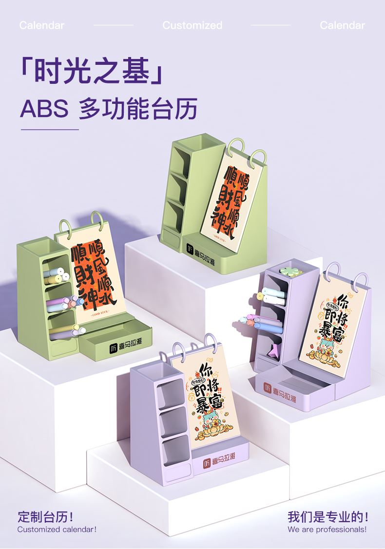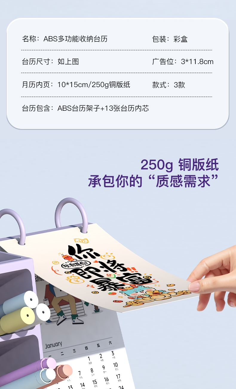 台历尺寸:18*9.5*19.7cm 内芯尺寸:10*15cm 广告位:11.5*3cm 月历张数:13张 纸张克重:250克艺术纸 颜色款式:3款(支持定制) 包含:13张内芯+ABS收纳台历架子