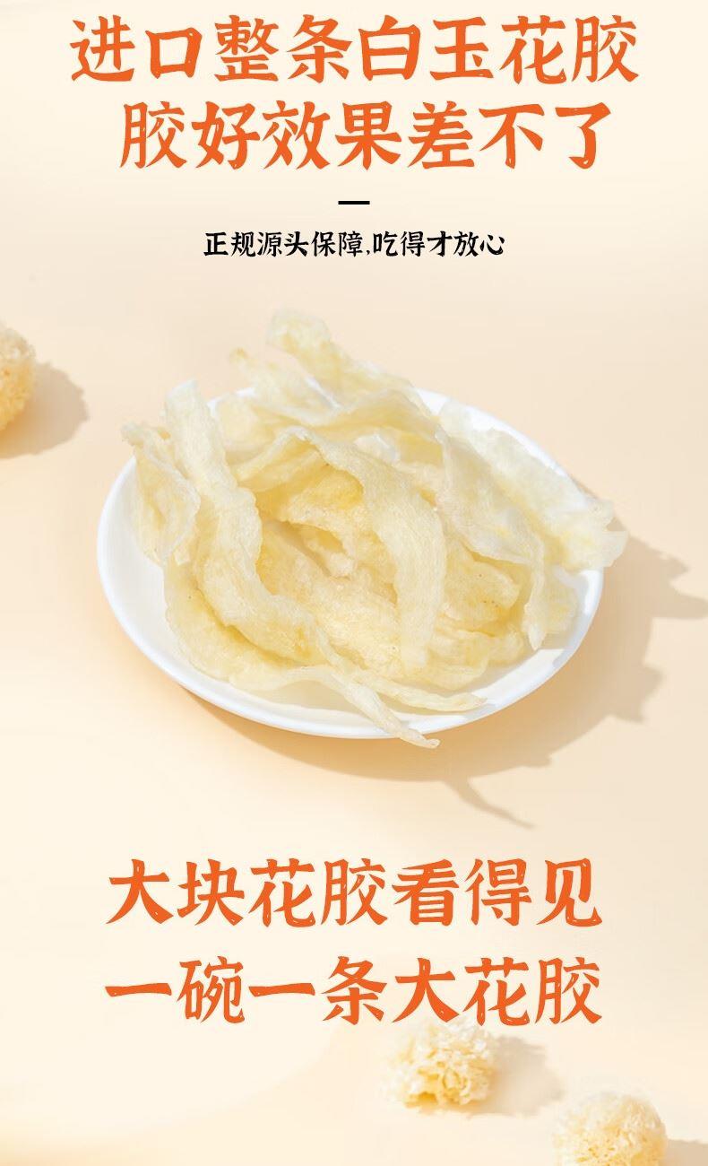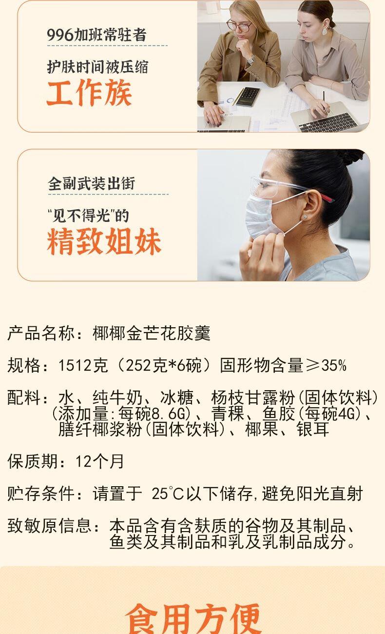 规格:1512克(252克*6碗)、固形物含量≥35% 卖点:我们坚持严选全球优质原料,只为打造这份美味。花胶,取自深海大鱼,肉质厚实,富含满满胶原蛋白,每一口都是对肌肤的温柔呵护,是天然的美容圣品。搭配来自热带果园的新鲜芒果,金黄果肉散发着浓郁果香,甜润多汁,为花胶羹注入自然的甜蜜。再融入醇厚椰浆,精选自阳光椰林的椰子,椰香馥郁,口感丝滑,将热带风情浓缩其中,让您足不出户,就能领略一场舌尖上的海岛之旅。